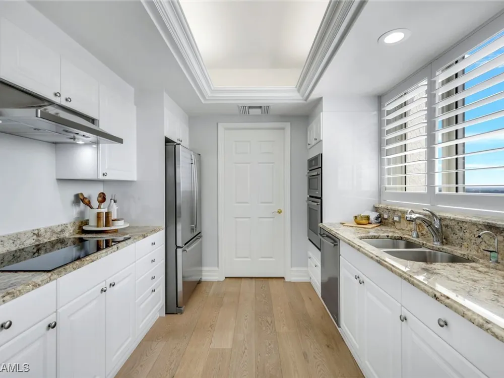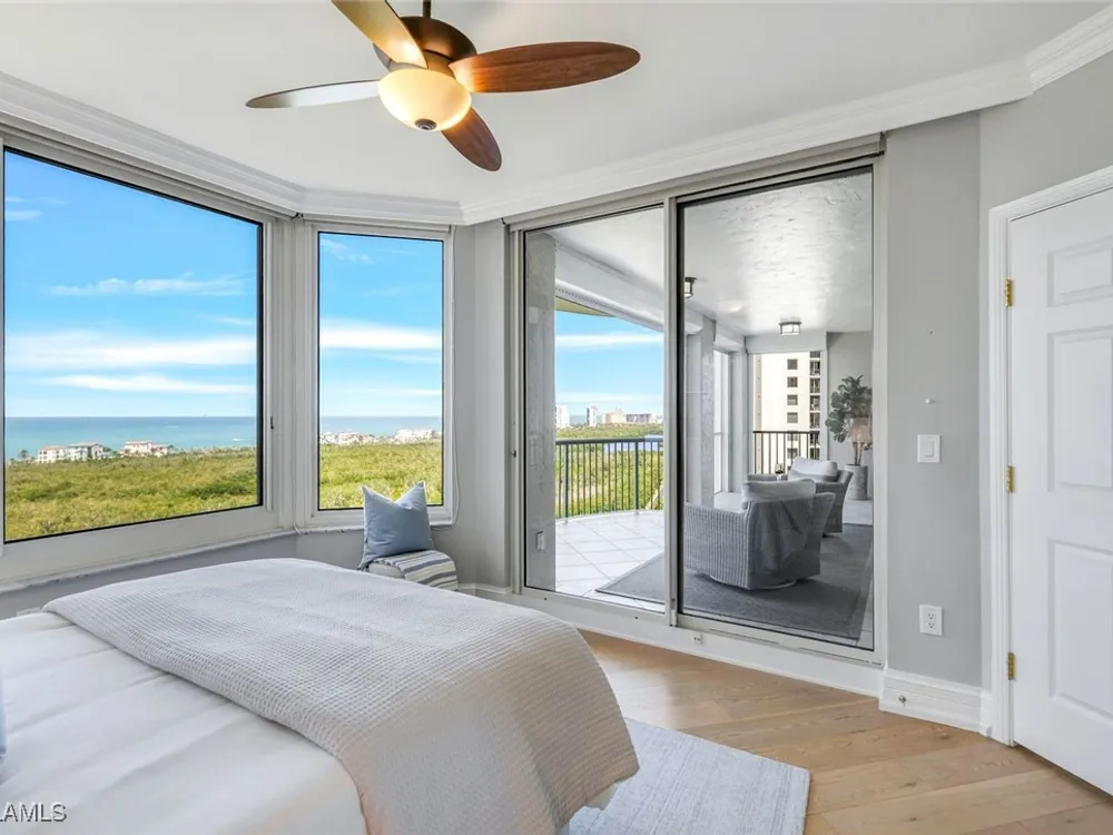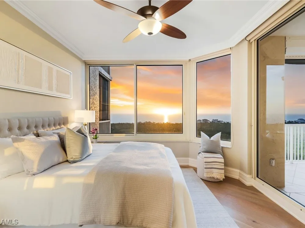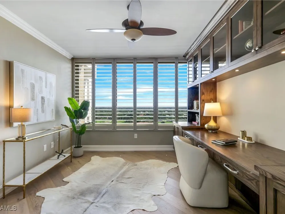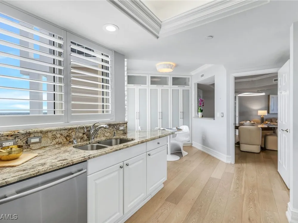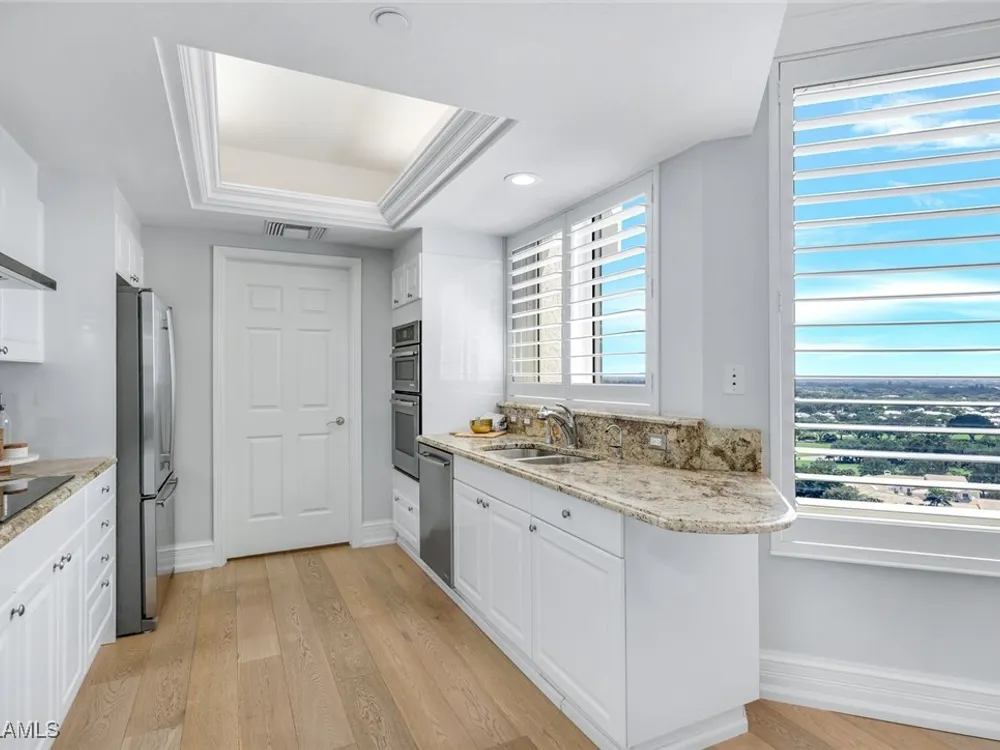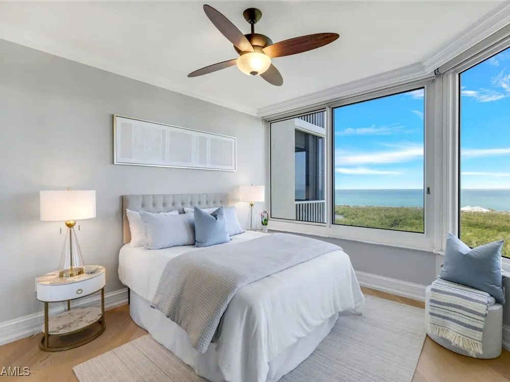 Introducing this exquisite beach access oasis in the heart of Naples, where luxury meets coastal living. This 16th floor St Raphael unit in Pelican Bay features 3 bedrooms and 3 full bathrooms with gorgeous 5" wide plank wood flooring throughout, tray in tray ceilings, plantation shutters, custom automatic shades, updated lighting, with gorgeous views from every room. The kitchen has been updated with granite counter tops with ogee edges, Wolf induction cook top and JennAir appliances and has an eat in kitchen area where you can enjoy your morning coffee overlooking the golf course. Each room has had custom organization added as well as additional storage space. A custom built home office was designed for one of the bedrooms. Enjoy peace of mind with electric hurricane shutters on your lanai space. Revel in the breathtaking views of the Gulf of Mexico from your balcony, while relishing the convenience of nearby irresistible amenities such as two Gulf-front restaurants, near by tram access, tennis facilities, a 27-hole golf course, boardwalks, Fitness & Wellness center as well as on-site amenities including a pool & hot tub, fitness room, tennis courts, library& club room and conceirge services. You are only a short distance to Waterside Shoppes with luxury shopping is offered and the choice of multiple dining options as well Baker Museum - Artis Naples where you can enjoy numerous events and exhibits. This unit also features 2 deeded garage parking spaces as well as 2 additional joined storage spaces on garage level and 1 add'l storage closet on 16th floor. You will love living in this premier community centrally located in Naples.