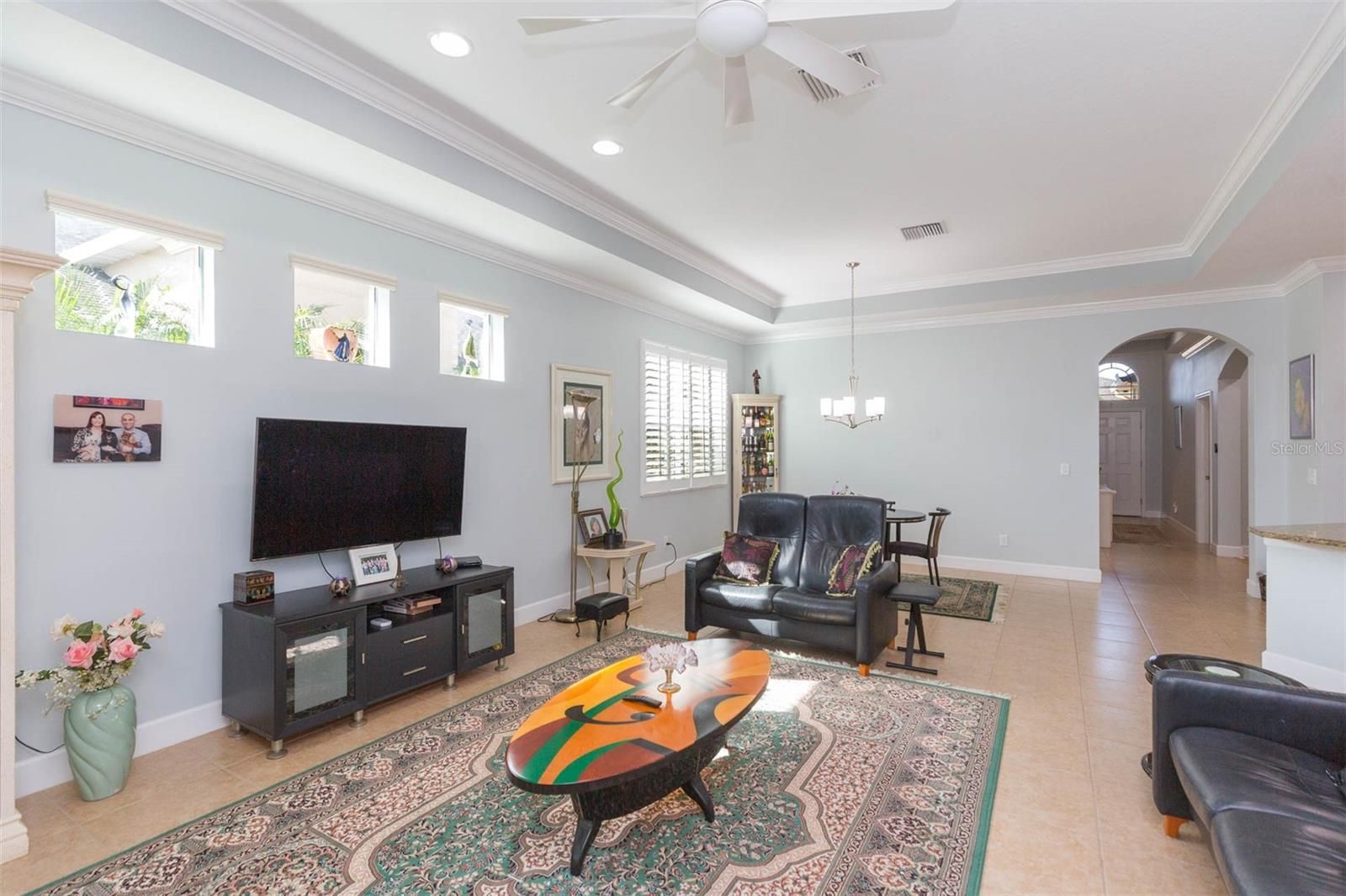 Welcome to Verona—the newest and ONLY GATED COMMUNITY in Sun City Center, Florida. This impeccably maintained home sits on a premium lot with beautiful golf course views and offers 3 bedrooms, 2 baths, a versatile den/bonus room, and approximately 1,800 sq. ft. of luxurious living space filled with upgrades. Step inside to an inviting modern floor plan featuring TRAY CEILINGS, PLANTATION SHUTTERS, recessed lighting, tile flooring throughout, and a contemporary color palette. The chef’s kitchen is equipped with 42" cabinetry, stainless steel appliances, granite countertops, a stylish tile backsplash, and a breakfast bar that opens directly to the living and dining areas—perfect for entertaining. The exquisite primary suite is privately located at the rear of the home and showcases serene golf course and nature views. It includes two walk-in closets, dual sinks, granite countertops, and a ceramic tile walk-in shower. Two additional bedrooms and a full guest bath are positioned on the opposite side of the home to provide comfort and privacy for visitors. The front BONUS ROOM offers endless possibilities—ideal as a den, office, or creative space. Prepare to fall in love with the CUSTOM FLORIDA ROOM, featuring tall windows, powered shades, stunning views, and its own AC/heater for year-round enjoyment. Additional features include reverse osmosis, a water softener, hurricane impact windows and hurricane shutters. The inside laundry room with washer/dryer leads into the 2-car garage with storage shelving and an optional TESLA POWER STATION. Residents of Sun City Center enjoy an active 55+ lifestyle with over 200 clubs and activities, multiple pools, tennis, pickleball, and more. Verona also provides access to the private Renaissance clubhouse, complete with restaurant and bar. Ideally located between Tampa and Sarasota, you’re close to world-class beaches, professional sports, amusement parks, and three international airports. Come see why we love it here—you won’t believe it until you do!