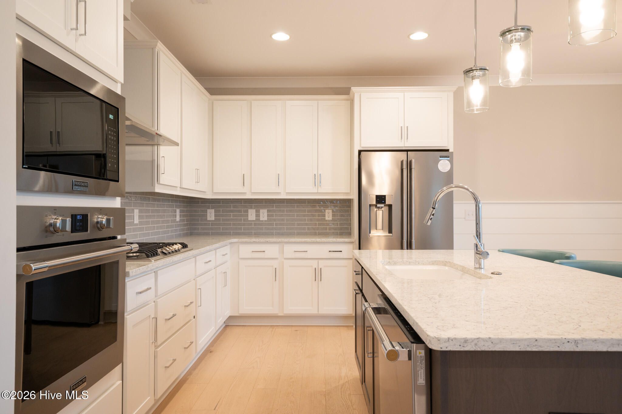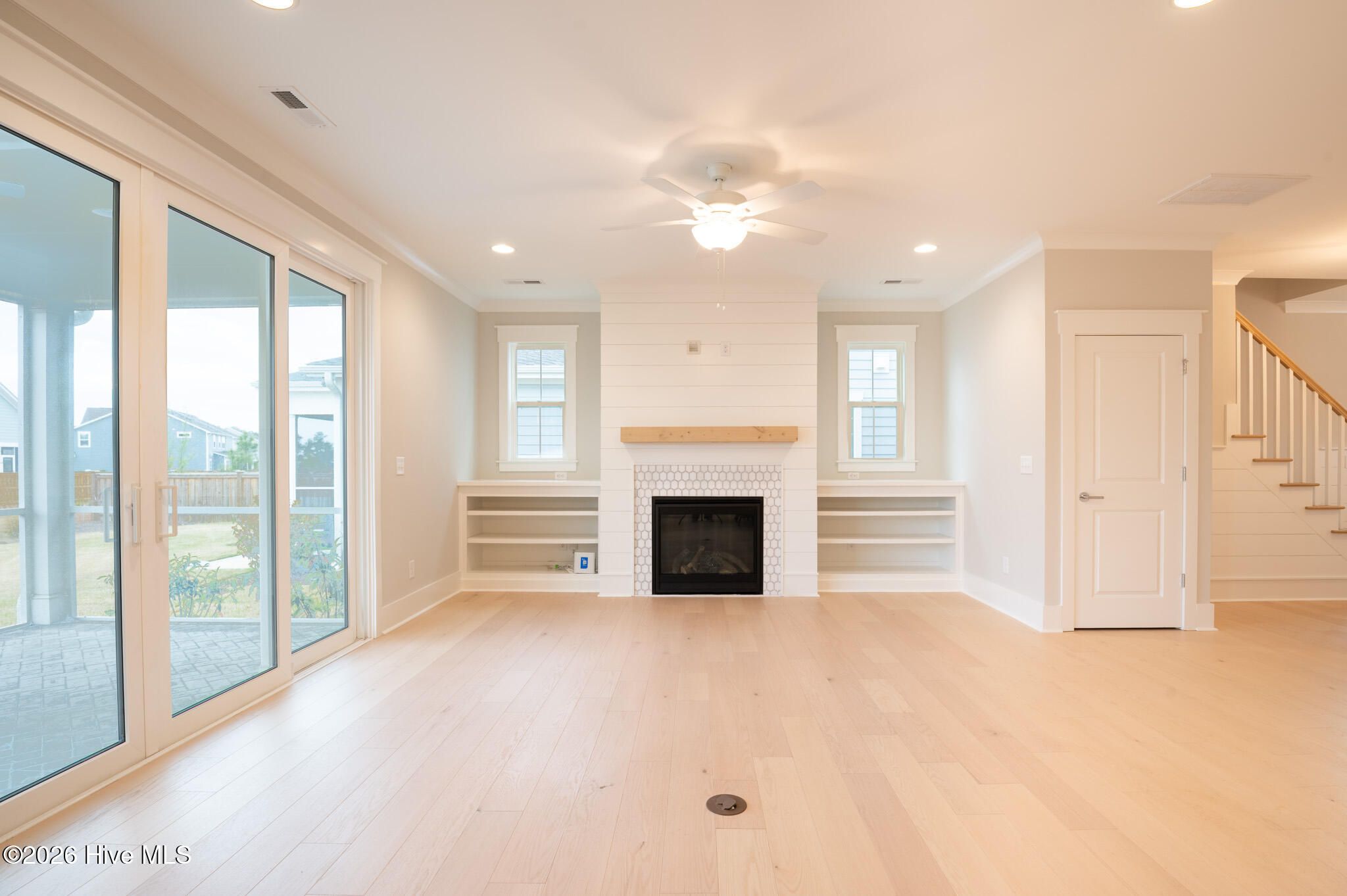 Welcome home! This beautifully crafted 2,219 sq. ft. Brunswick plan offers 3 bedrooms, 2.5 baths, and a versatile upstairs loft. Packed with premium upgrades and meticulous attention to detail, this home perfectly blends elegance with everyday functionality. Step inside to gorgeous light-toned wood floors, a classic craftsman trim package, and elegant 5-inch cove crown molding that flows through the main living areas, owner's bedroom, and upstairs loft. The inviting entryway features stunning shiplap wainscoting, which continues into the powder room, and a highly functional built-in mudroom bench with cubbies and hooks--perfect for keeping everyday items organized. The heart of the home is the great room, which boasts a stunning focal-point fireplace with a hex-tile marble surround, floor-to-ceiling shiplap, a floating wood mantle, and custom built-in shelving. Wall-to-wall sliding glass doors bathe the space in natural light, while a convenient floor outlet makes furniture arrangement a breeze. Open to the great room, the dining space is elevated by continued shiplap wainscoting and a modern, airy chandelier. Entertaining is effortless in the upgraded ''Prestige Kitchen,'' featuring a premium gas cooktop with a sleek stainless steel hood vent and a built-in wall oven and microwave combination. An expansive contrasting dark-wood island provides abundant prep space and bar seating beneath beautiful glass pendant lights. The kitchen is beautifully finished with upgraded white shaker-style cabinetry, elegant countertops, and a stylish grey glass subway tile backsplash. Additionally, the pantry, along with all bedroom closets and the laundry room, is upgraded with custom white wood shelving. Beautiful wood treads lead to the second floor, where you will find the spacious loft and bedrooms. The relaxing owner's suite features luxurious crown molding, custom closet shelving, and a stunning en-suite bath complete with a freestanding tub. The guest bath is equally well-appointed, upgraded with a beautiful tile tub surround. You will find upgraded tile and cabinetry throughout all the bathrooms in the home. Step through the great room's sliding doors to discover a fantastic screened-in rear porch featuring upgraded brick-patterned flooring. An adjoining poured concrete patio provides the perfect spot for grilling or soaking up the sun in the backyard. Additional conveniences include a garage service door and timeless exterior charm with an inviting covered front porch and custom pergola garage details.