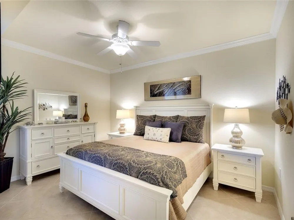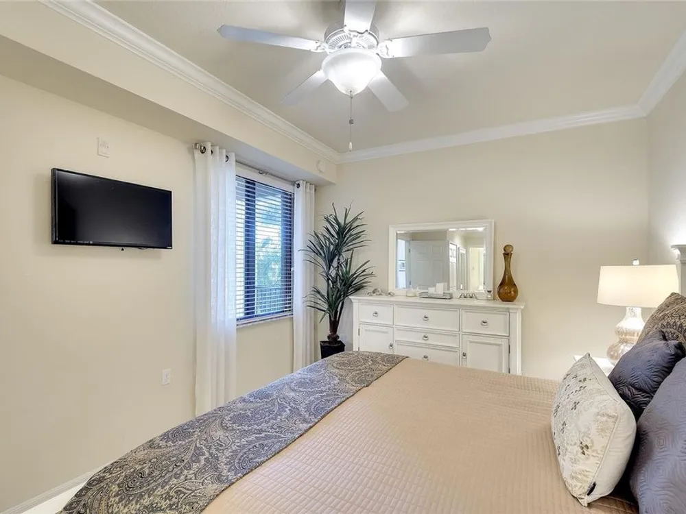 - Ceiling Fan(s), Crown Molding, Eat-in Kitchen, High Ceilings, In-Wall Pest Control, Open Floorplan, Main Level Primary, Solid-Wood Cabinets, Stone Counters, Thermostat, Walk-In Closet(s), Window Treatments