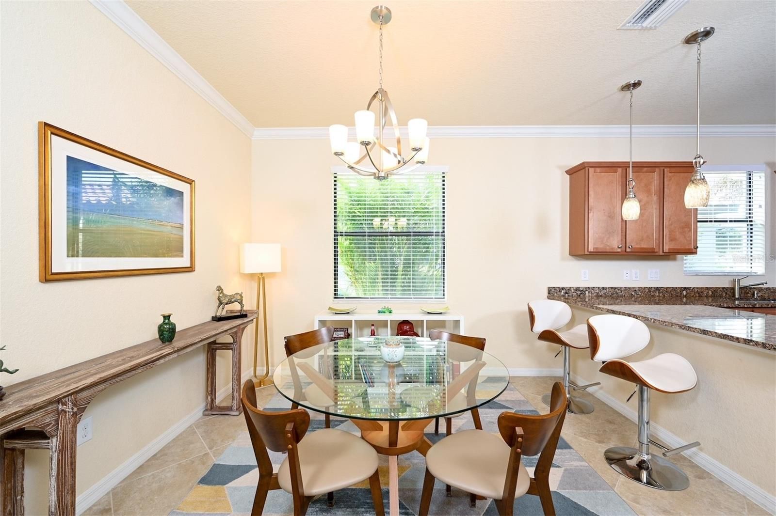 - Ceiling Fan(s), Crown Molding, Eat-in Kitchen, Open Floorplan, Main Level Primary, Solid-Wood Cabinets, Split Bedrooms, Stone Counters, Thermostat, Walk-In Closet(s), Window Treatments