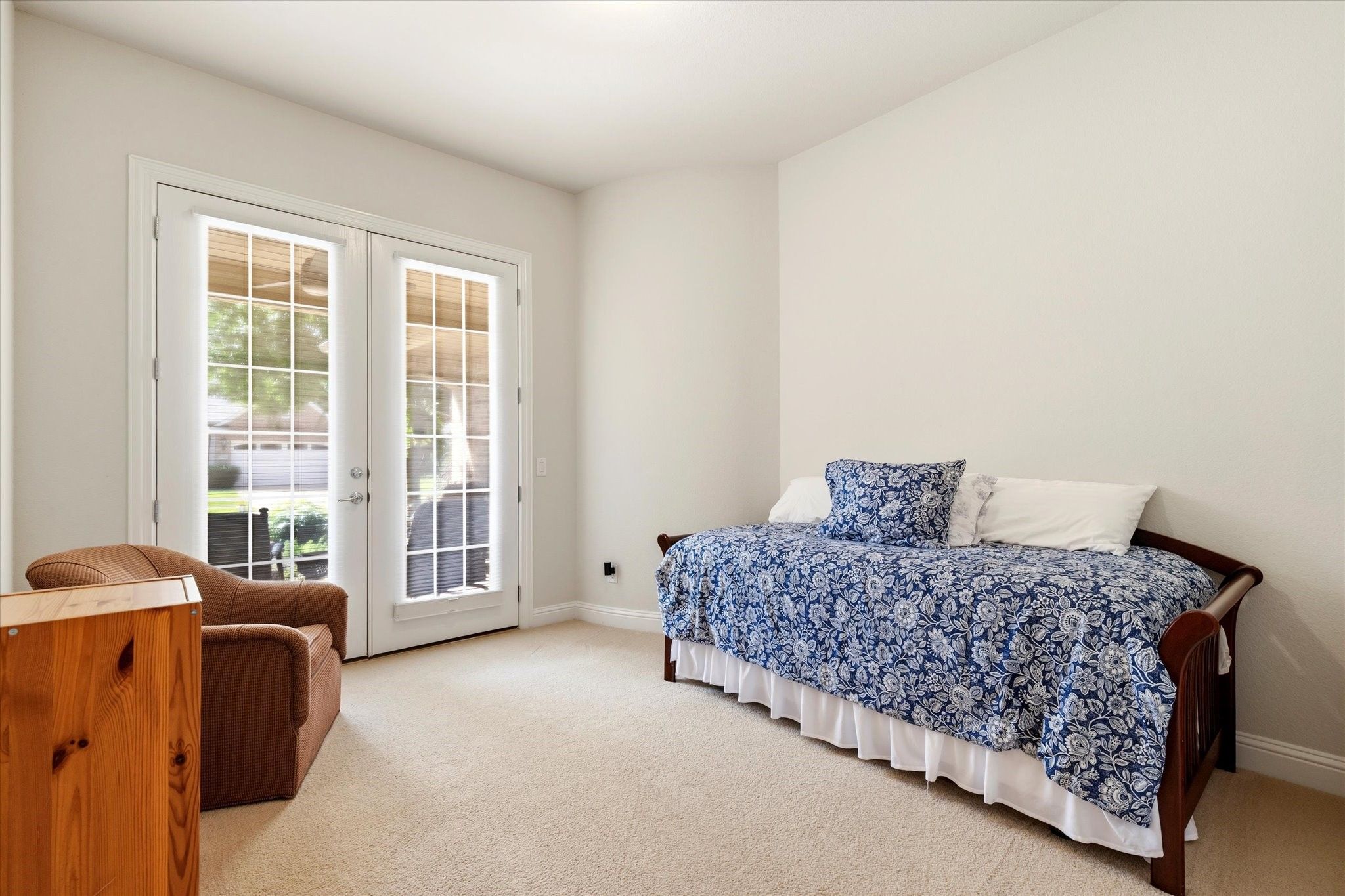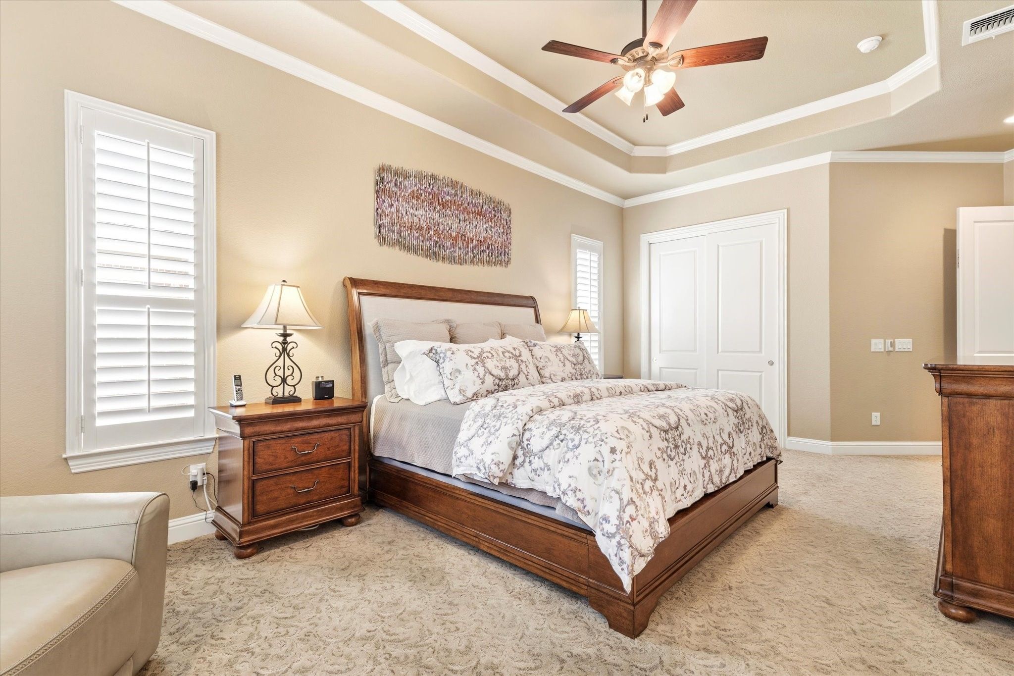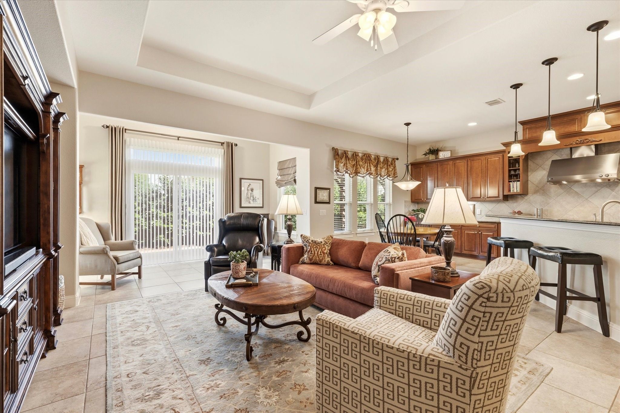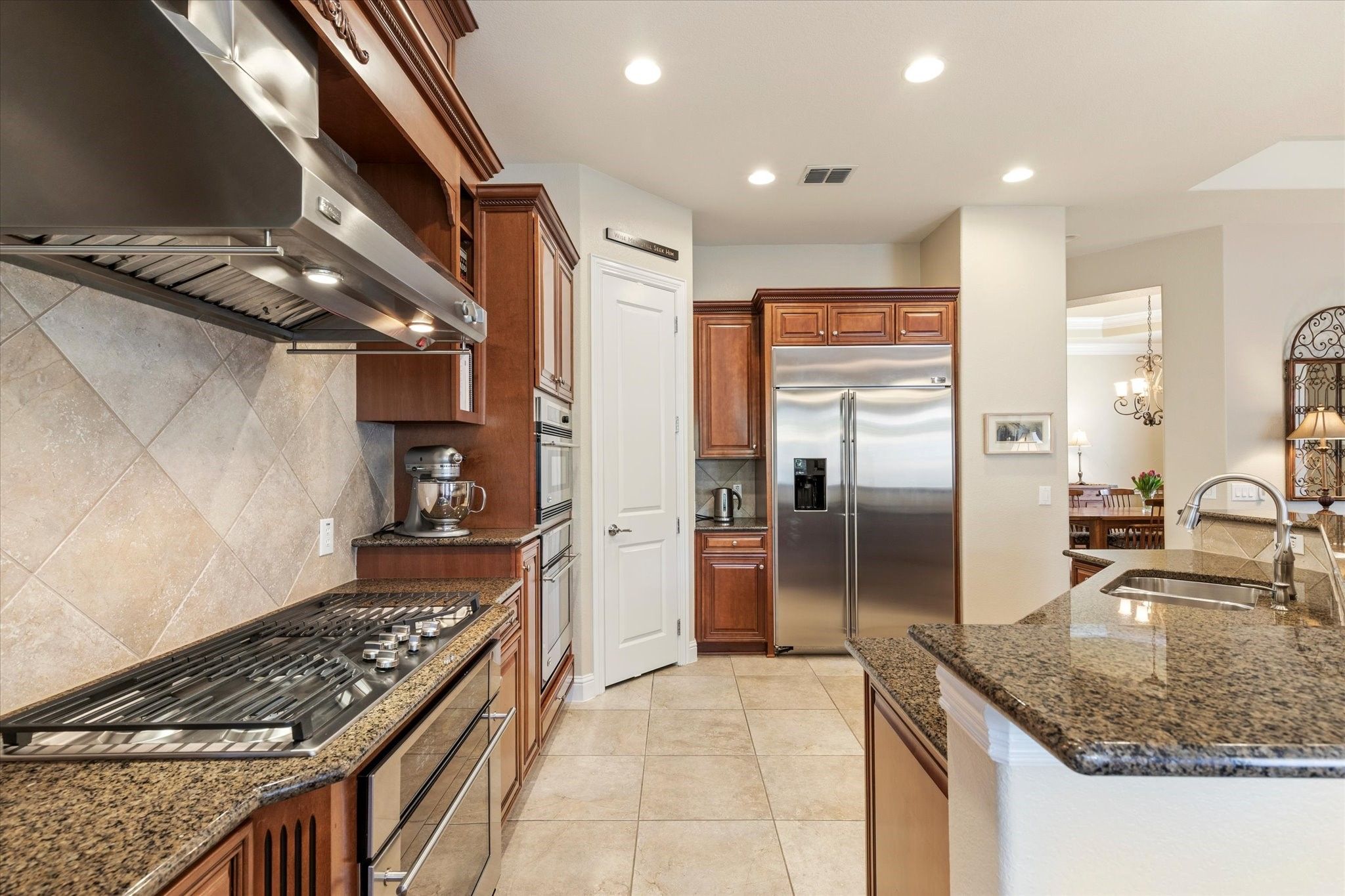 This beautifully maintained home, boasting over $100K in upgrades, is ideally situated on a quiet cul-de-sac street and features the Balboa floorplan—one of the largest in Frisco Lakes with over 2,700 square feet. Offering 3 bedrooms, 3 full bathrooms, a private study or second living area, and a spacious formal dining room, this home is designed with both entertaining and everyday comfort in mind. The open-concept great room seamlessly connects the family room, extended sunroom, kitchen, & breakfast nook, creating a warm and inviting space. At the front of the home, a generously sized guest bedroom overlooks the front yard and is paired with a full bathroom, while the study is enclosed with elegant glass French doors for added privacy. The formal dining room easily accommodates large gatherings and is conveniently located near the kitchen, which features extensive granite countertops with bar seating, a new GE Profile 5-burner gas cooktop with upgraded vent, double ovens, microwave, built-in refrigerator, and a walk-in pantry. The family room includes a fireplace—a rare feature—along with a sunroom sitting area & sliding doors that lead to the backyard. The private primary suite is tucked away at the rear of the home with a cozy sitting area & a luxurious bath complete with dual vanities, soaking tub, walk-in shower, and a customized walk-in closet. A 3rd bedroom & full bath are located in a separate wing, ideal for guests. Additional highlights include a large laundry room with sink and a three-car tandem garage with space for a golf cart or workshop. The beautifully landscaped backyard offers exceptional privacy with a living fence of Magnolias and Holly trees and a pergola-covered patio perfect for relaxing or entertaining. Located in the vibrant 55+ Frisco Lakes community, residents enjoy access to over 40,000 square feet of resort-style amenities including fitness centers, pools, tennis, pickleball, bocce courts, walking trails, and numerous social activities.