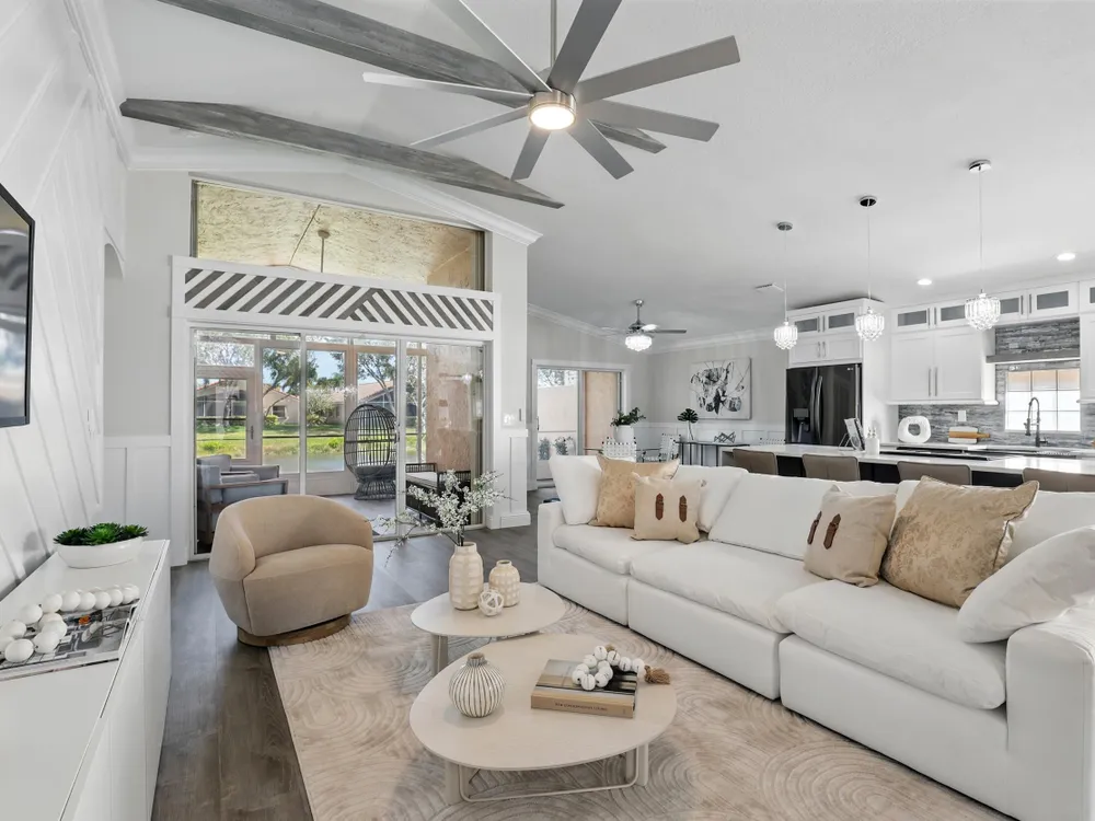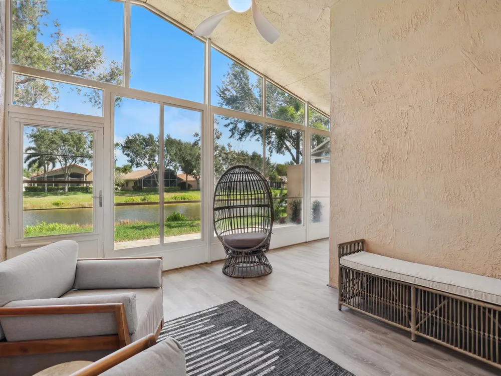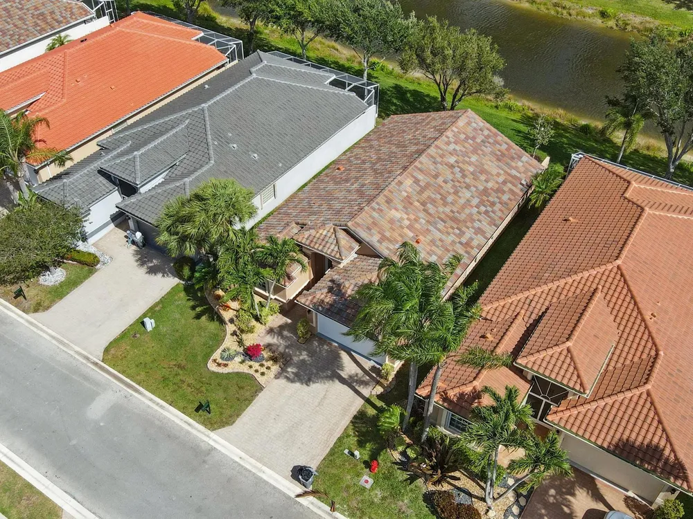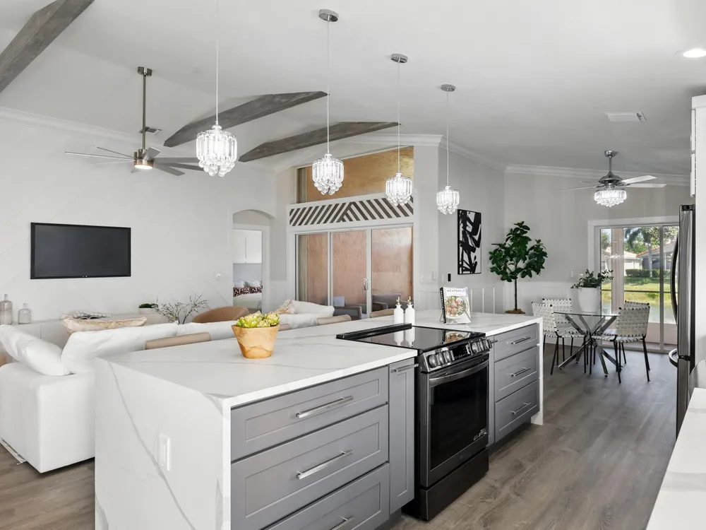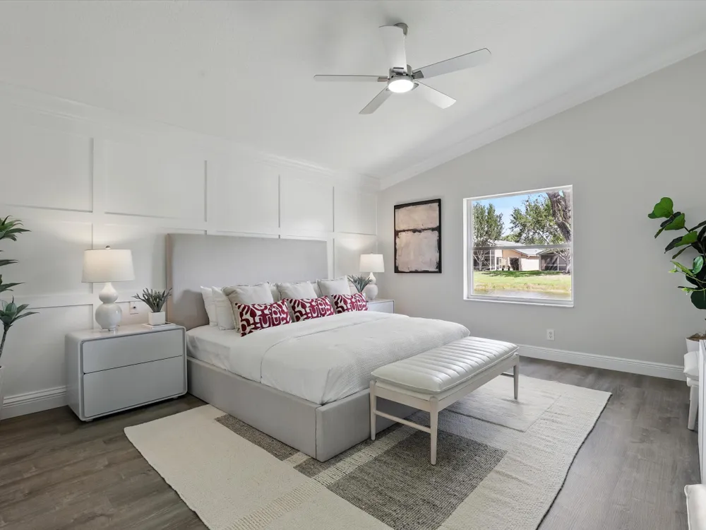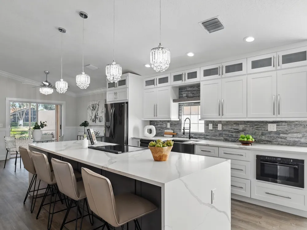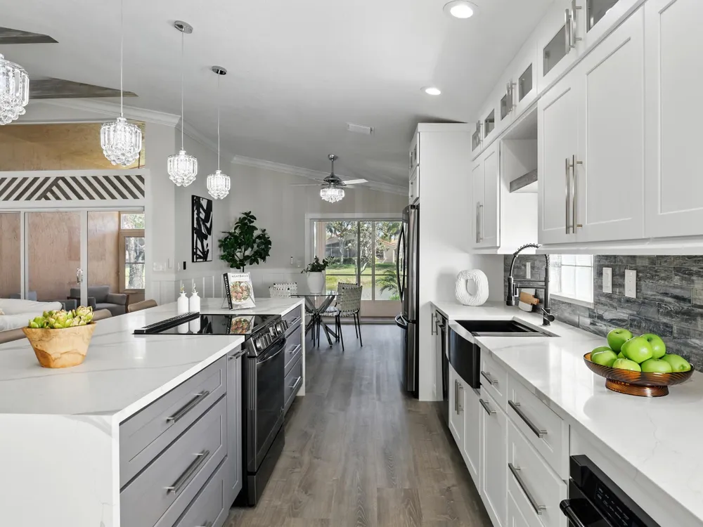 Updated from top to bottom! STUNNING, LAKEFRONT home featuring 3 bedrooms, 2 baths, and a spacious 2-car garage. Including a BRAND-NEW ROOF (2025) Hot water heater (2025). Designer finishes throughout include custom shaker cabinetry, quartz countertops with waterfall edging, brand-new black stainless-steel appliances, sleek center island. High ceilings. Premium laminate flooring. The elegant primary suite is set apart for added privacy and features two expansive walk-in closets, luxurious soaking tub & separate glass enclosed shower with seating. Dual sinks. Unwind on your covered screened patio overlooking the lake. Accordion shutters for added storm protection. This home is truly a showpiece! Meticulously upgraded!