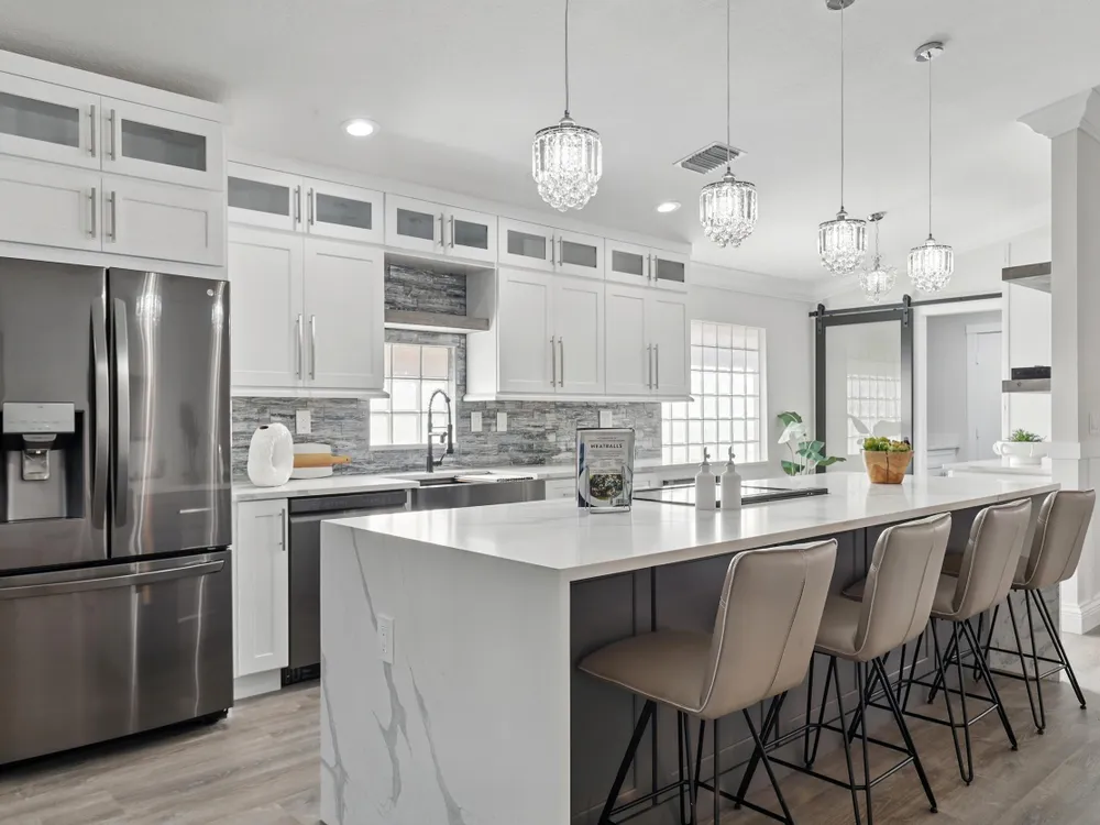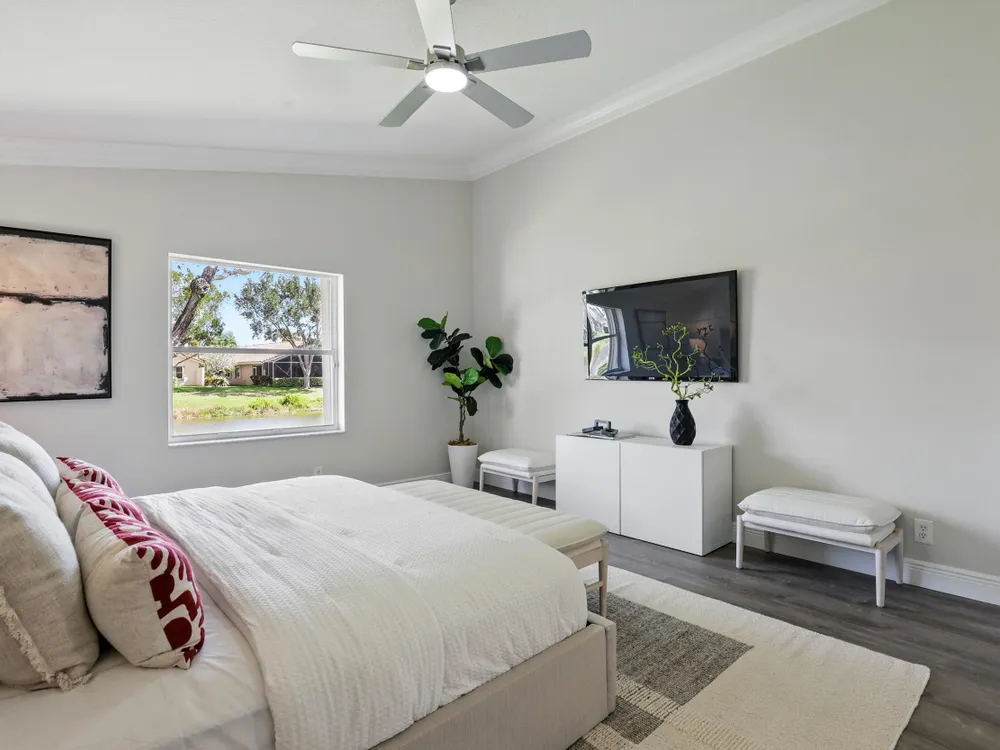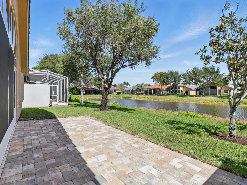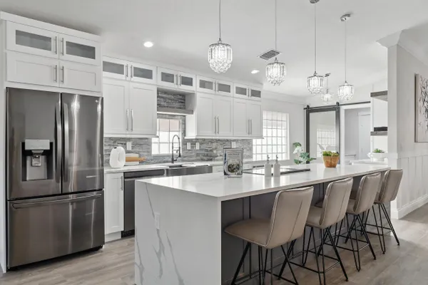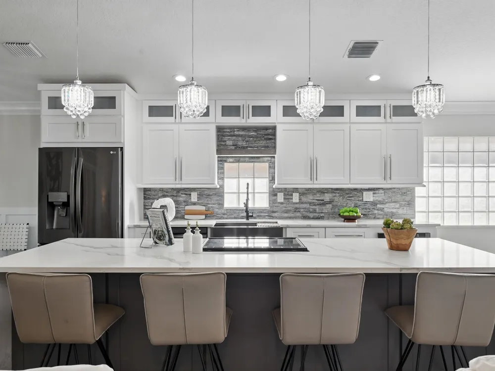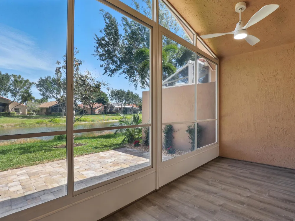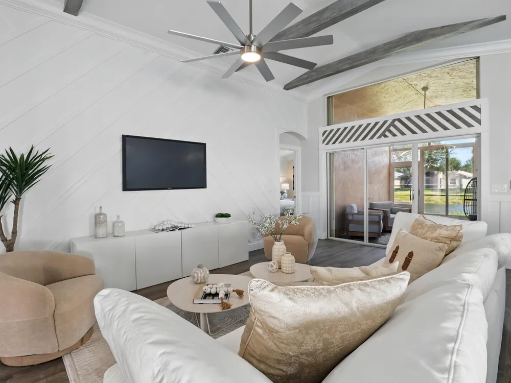Updated from top to bottom! STUNNING, LAKEFRONT home featuring 3 bedrooms, 2 baths, and a spacious 2-car garage. Including a BRAND-NEW ROOF (2025) Hot water heater (2025). Designer finishes throughout include custom shaker cabinetry, quartz countertops with waterfall edging, brand-new black stainless-steel appliances, sleek center island. High ceilings. Premium laminate flooring. The elegant primary suite is set apart for added privacy and features two expansive walk-in closets, luxurious soaking tub & separate glass enclosed shower with seating. Dual sinks. Unwind on your covered screened patio overlooking the lake. Accordion shutters for added storm protection. This home is truly a showpiece! Meticulously upgraded!