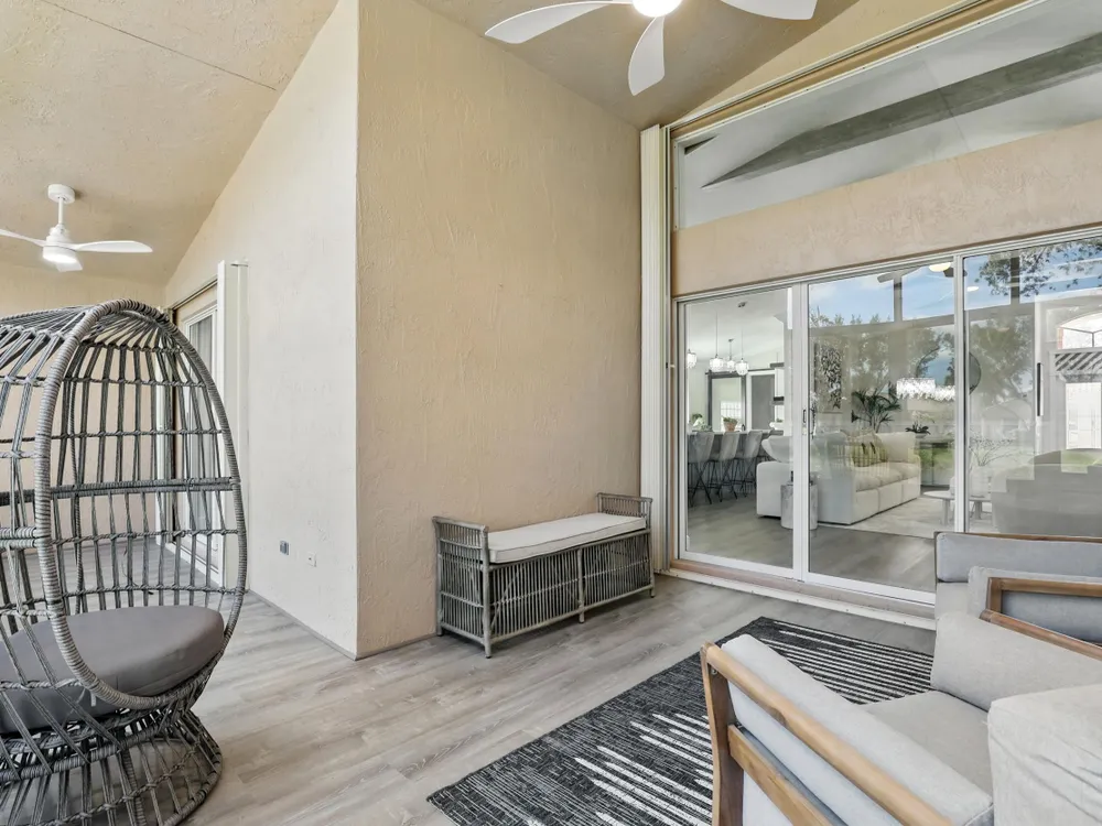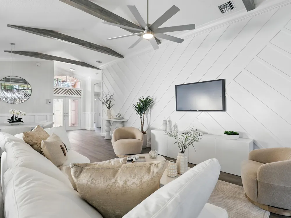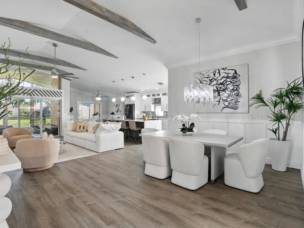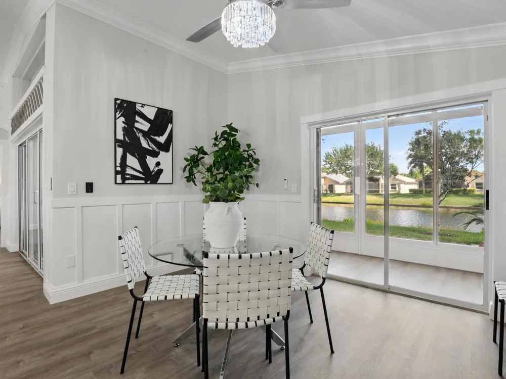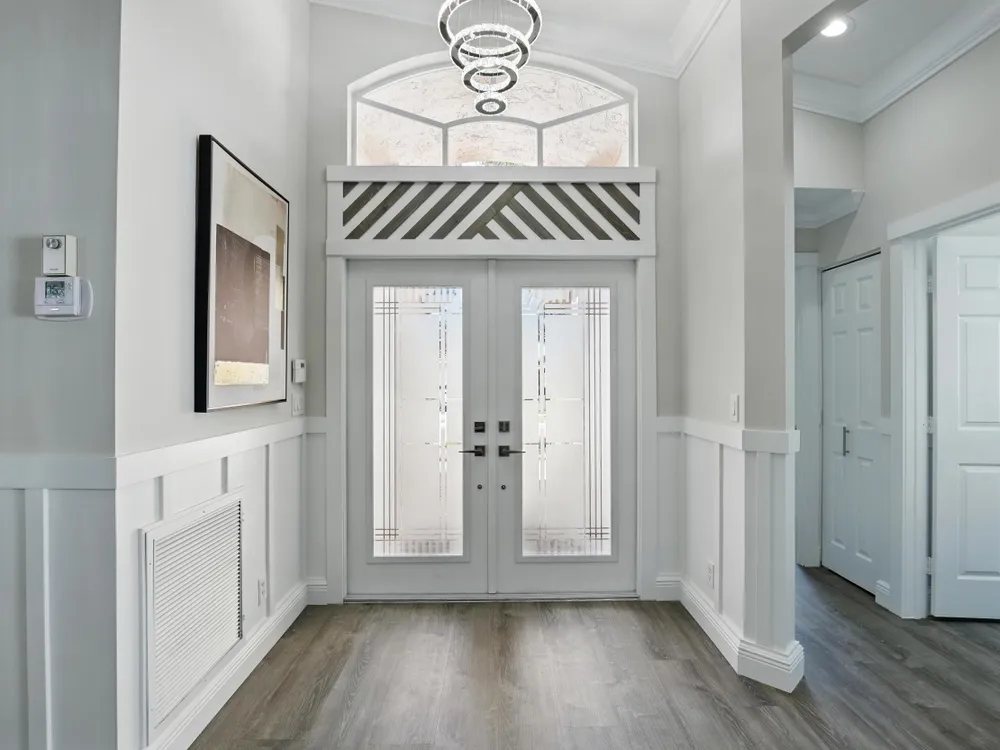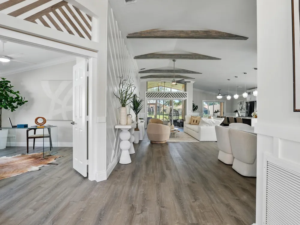 Updated from top to bottom! STUNNING, LAKEFRONT home featuring 3 bedrooms, 2 baths, and a spacious 2-car garage. Including a BRAND-NEW ROOF (2025) Hot water heater (2025). Designer finishes throughout include custom shaker cabinetry, quartz countertops with waterfall edging, brand-new black stainless-steel appliances, sleek center island. High ceilings. Premium laminate flooring. The elegant primary suite is set apart for added privacy and features two expansive walk-in closets, luxurious soaking tub & separate glass enclosed shower with seating. Dual sinks. Unwind on your covered screened patio overlooking the lake. Accordion shutters for added storm protection. This home is truly a showpiece! Meticulously upgraded!