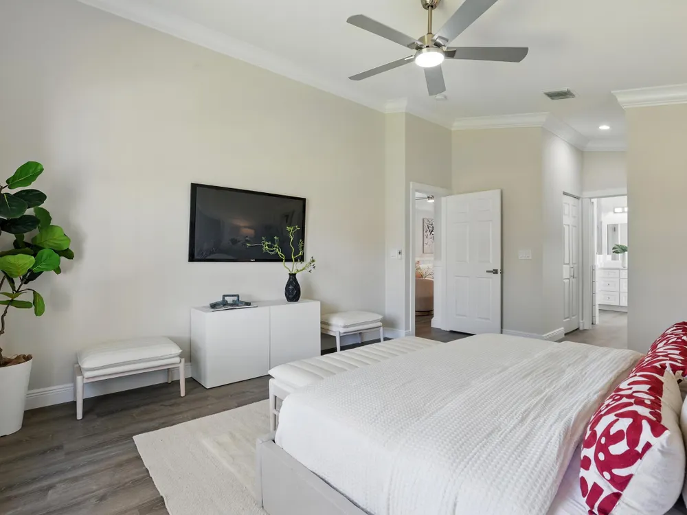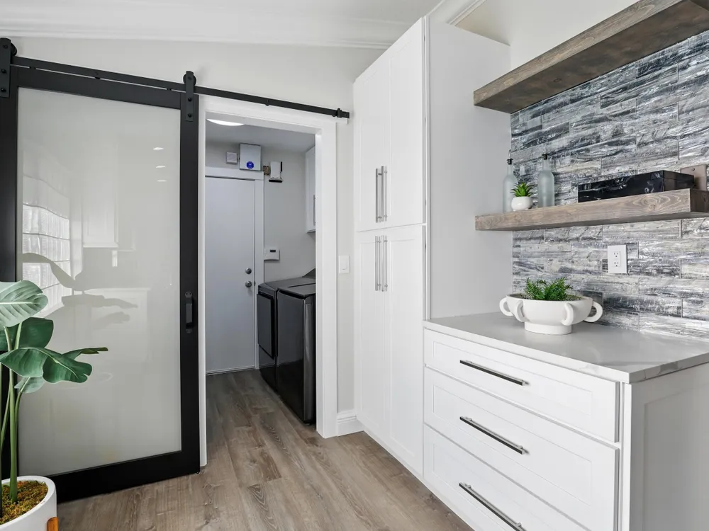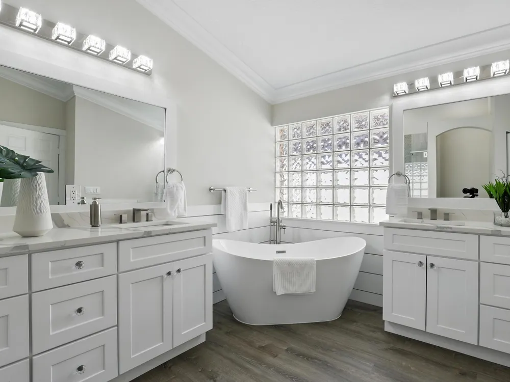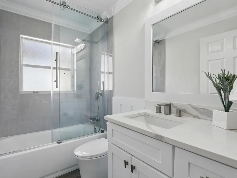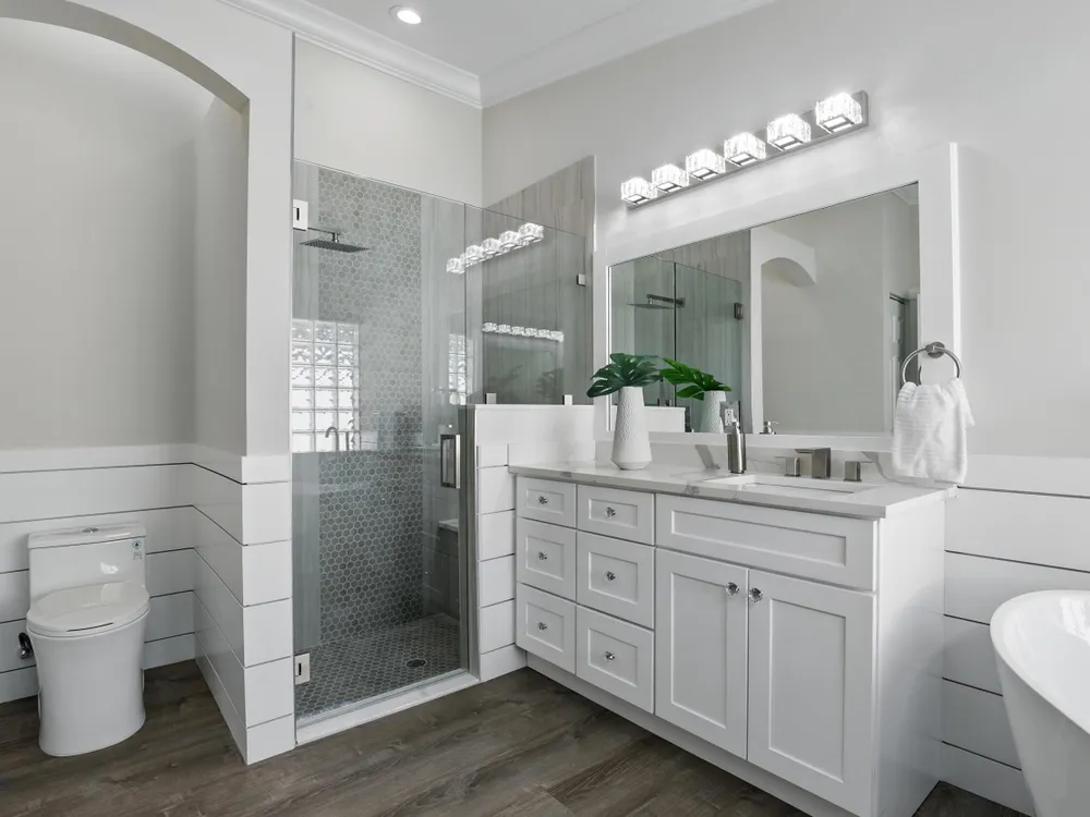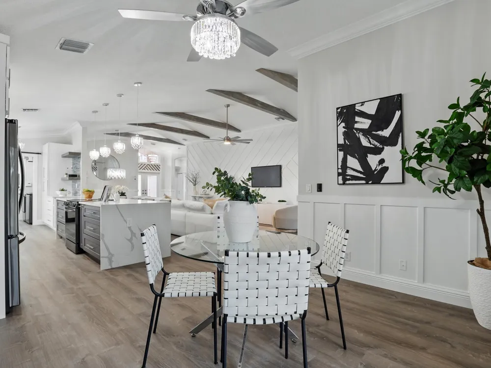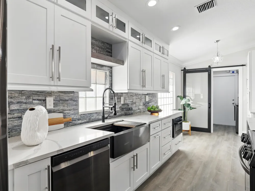 Updated from top to bottom! STUNNING, LAKEFRONT home featuring 3 bedrooms, 2 baths, and a spacious 2-car garage. Including a BRAND-NEW ROOF (2025) Hot water heater (2025). Designer finishes throughout include custom shaker cabinetry, quartz countertops with waterfall edging, brand-new black stainless-steel appliances, sleek center island. High ceilings. Premium laminate flooring. The elegant primary suite is set apart for added privacy and features two expansive walk-in closets, luxurious soaking tub & separate glass enclosed shower with seating. Dual sinks. Unwind on your covered screened patio overlooking the lake. Accordion shutters for added storm protection. This home is truly a showpiece! Meticulously upgraded!