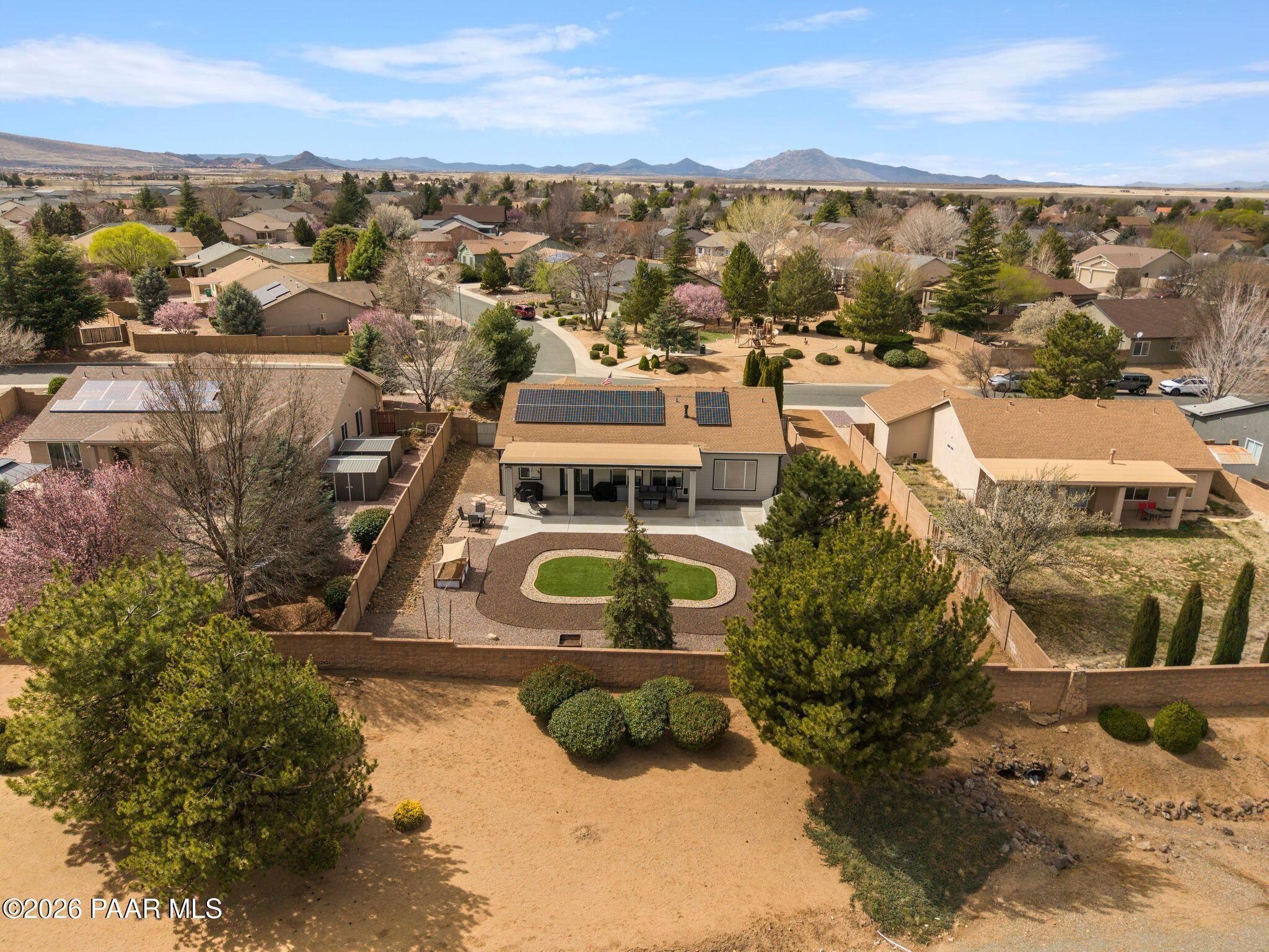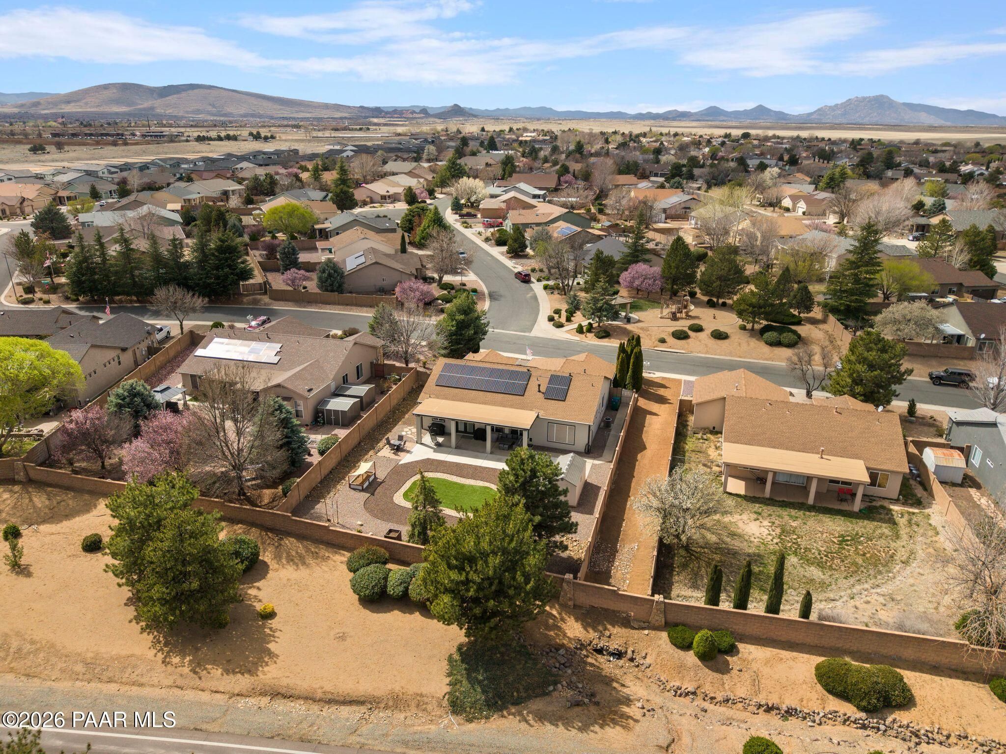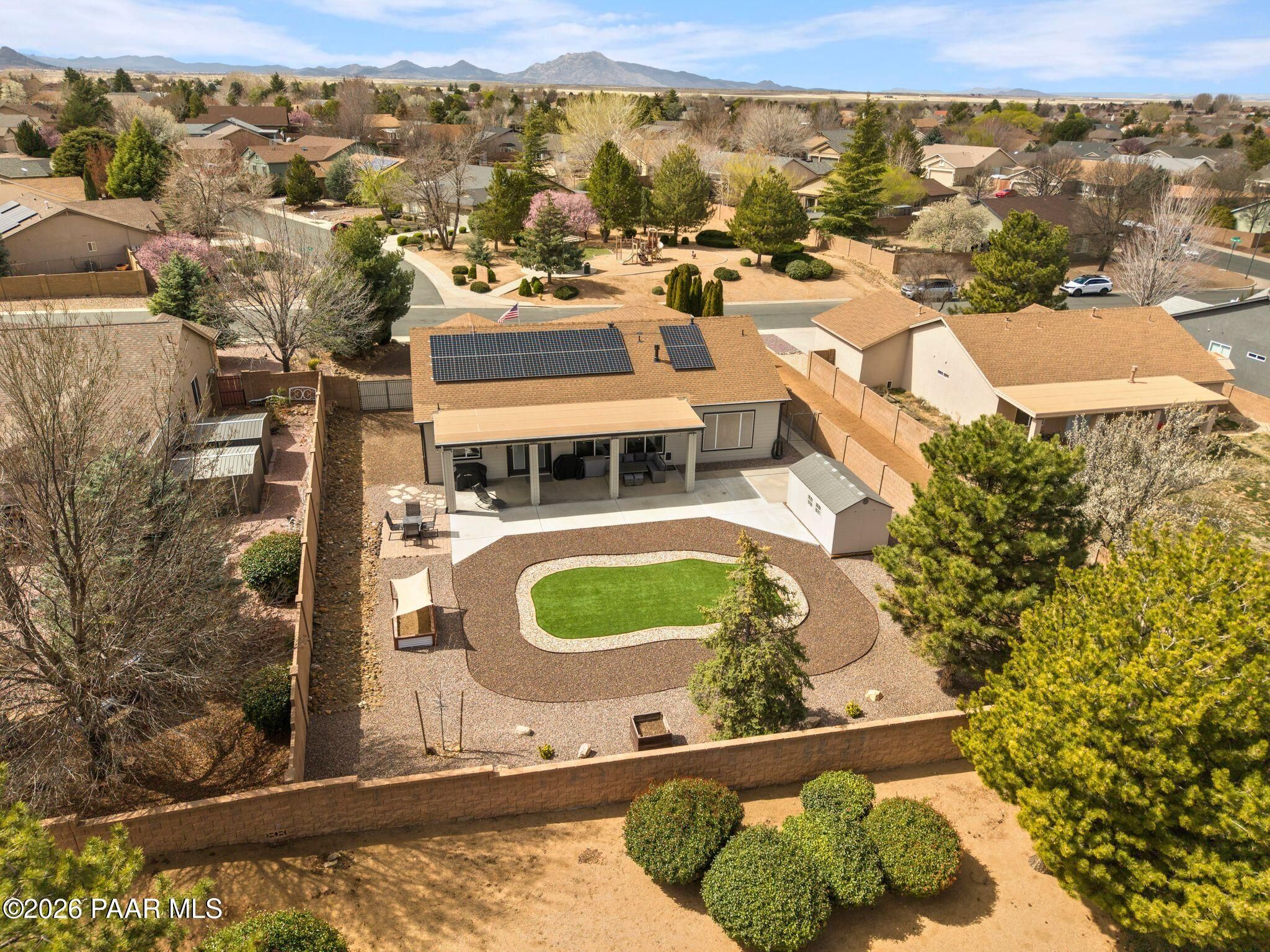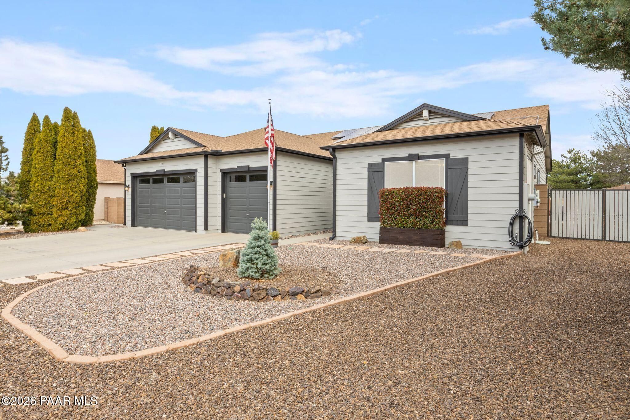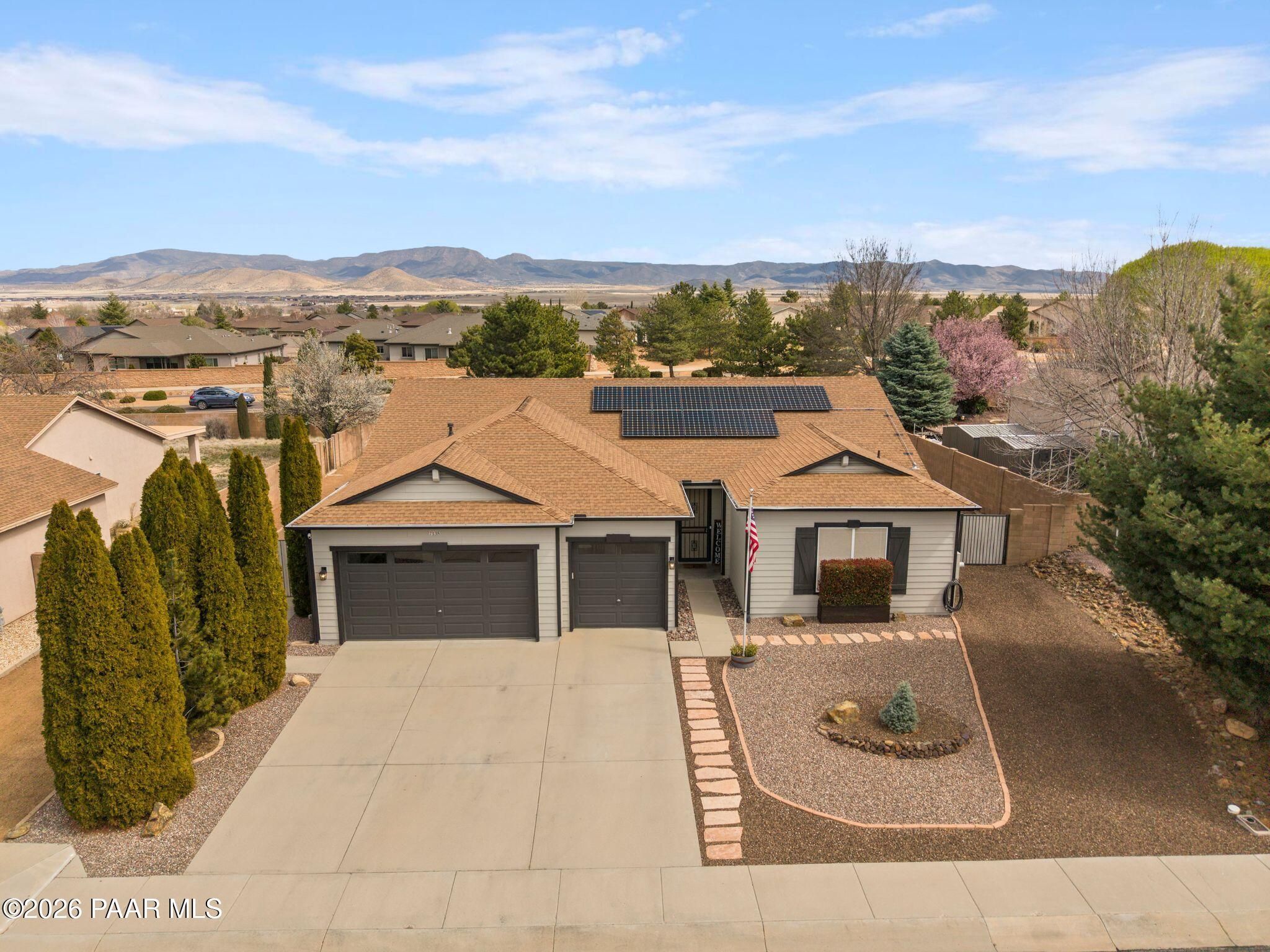 Located in the sought-after Pronghorn Ranch community, this well-maintained home offers owned solar, a three-car garage, and a generously sized lot, combining comfort, functionality, and energy efficiency in one inviting property.The open-concept floor plan creates a seamless connection between the living, dining, and kitchen areas, making the home ideal for both everyday living and entertaining. The kitchen features a center island, ample cabinetry for storage, and a functional layout that opens naturally to the main living space.The primary suite provides a comfortable retreat and includes an en suite bathroom with a soaking tub, offering a relaxing place to unwind. Additional bedrooms provide flexible space that may accommodate guests, hobbies, or workspace needs.Outdoor living is enhanced by the fully landscaped backyard, where mature trees, a covered patio, and a storage shed provide both beauty and practicality. The spacious lot offers room to enjoy outdoor dining, relaxing evenings, and Arizona's beautiful sunrises.The three-car garage complete with epoxy floor offers ample space for vehicles, storage, or recreational equipment.Conveniently located approximately 15 minutes from shopping, dining, and services in Prescott Valley, this home provides a comfortable lifestyle within one of the area's popular communities.
