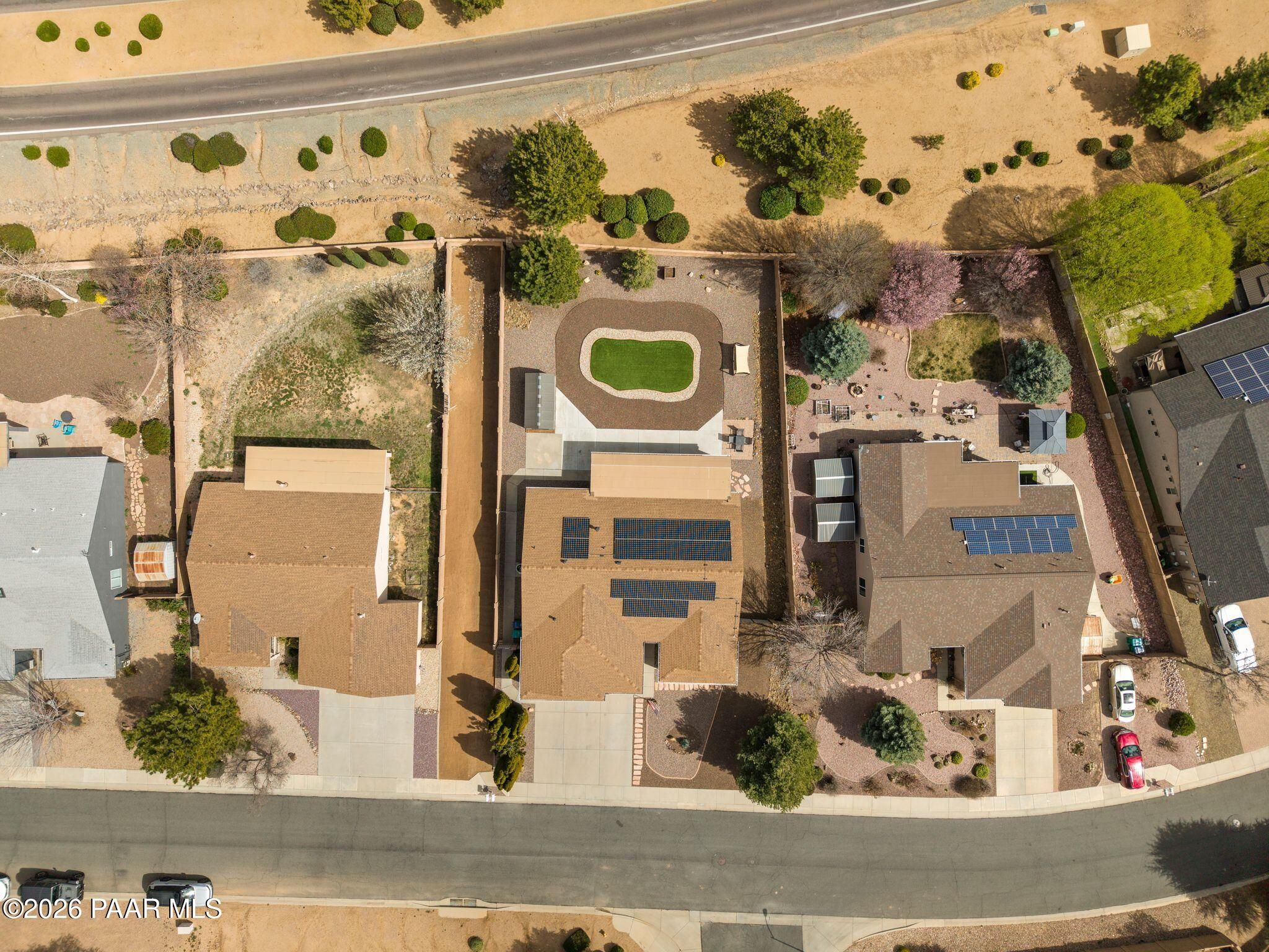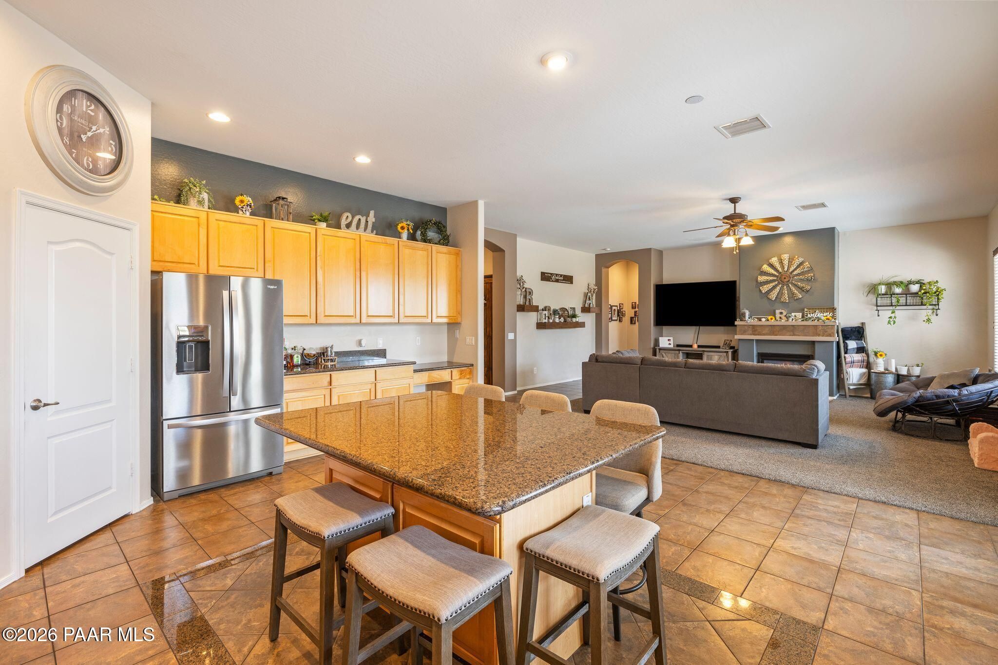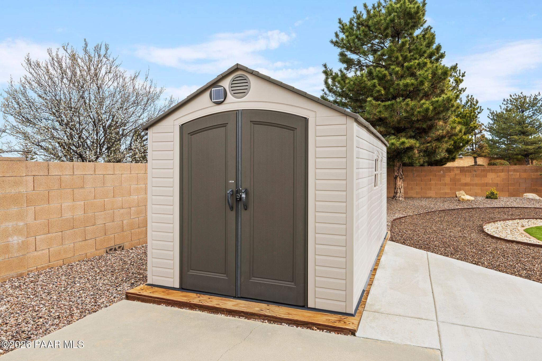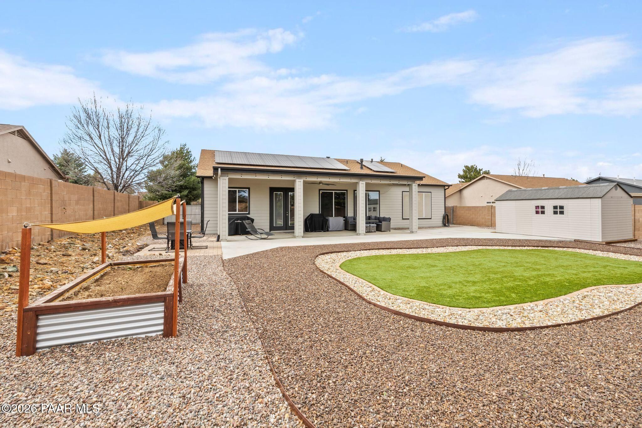Located in the sought-after Pronghorn Ranch community, this well-maintained home offers owned solar, a three-car garage, and a generously sized lot, combining comfort, functionality, and energy efficiency in one inviting property.The open-concept floor plan creates a seamless connection between the living, dining, and kitchen areas, making the home ideal for both everyday living and entertaining. The kitchen features a center island, ample cabinetry for storage, and a functional layout that opens naturally to the main living space.The primary suite provides a comfortable retreat and includes an en suite bathroom with a soaking tub, offering a relaxing place to unwind. Additional bedrooms provide flexible space that may accommodate guests, hobbies, or workspace needs.Outdoor living is enhanced by the fully landscaped backyard, where mature trees, a covered patio, and a storage shed provide both beauty and practicality. The spacious lot offers room to enjoy outdoor dining, relaxing evenings, and Arizona's beautiful sunrises.The three-car garage complete with epoxy floor offers ample space for vehicles, storage, or recreational equipment.Conveniently located approximately 15 minutes from shopping, dining, and services in Prescott Valley, this home provides a comfortable lifestyle within one of the area's popular communities.