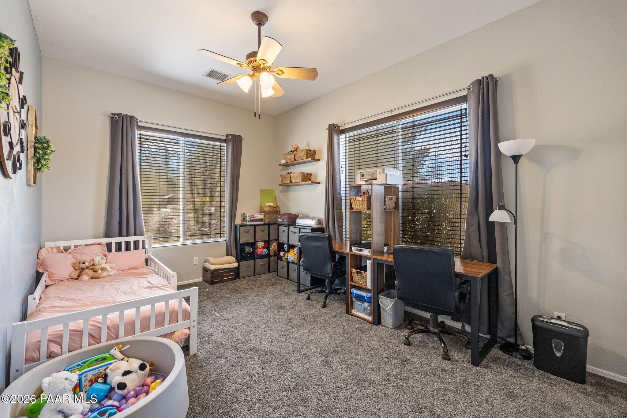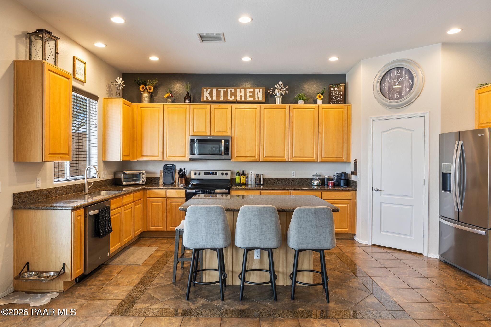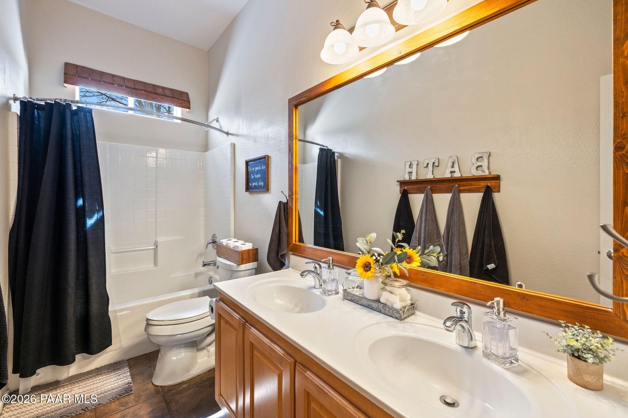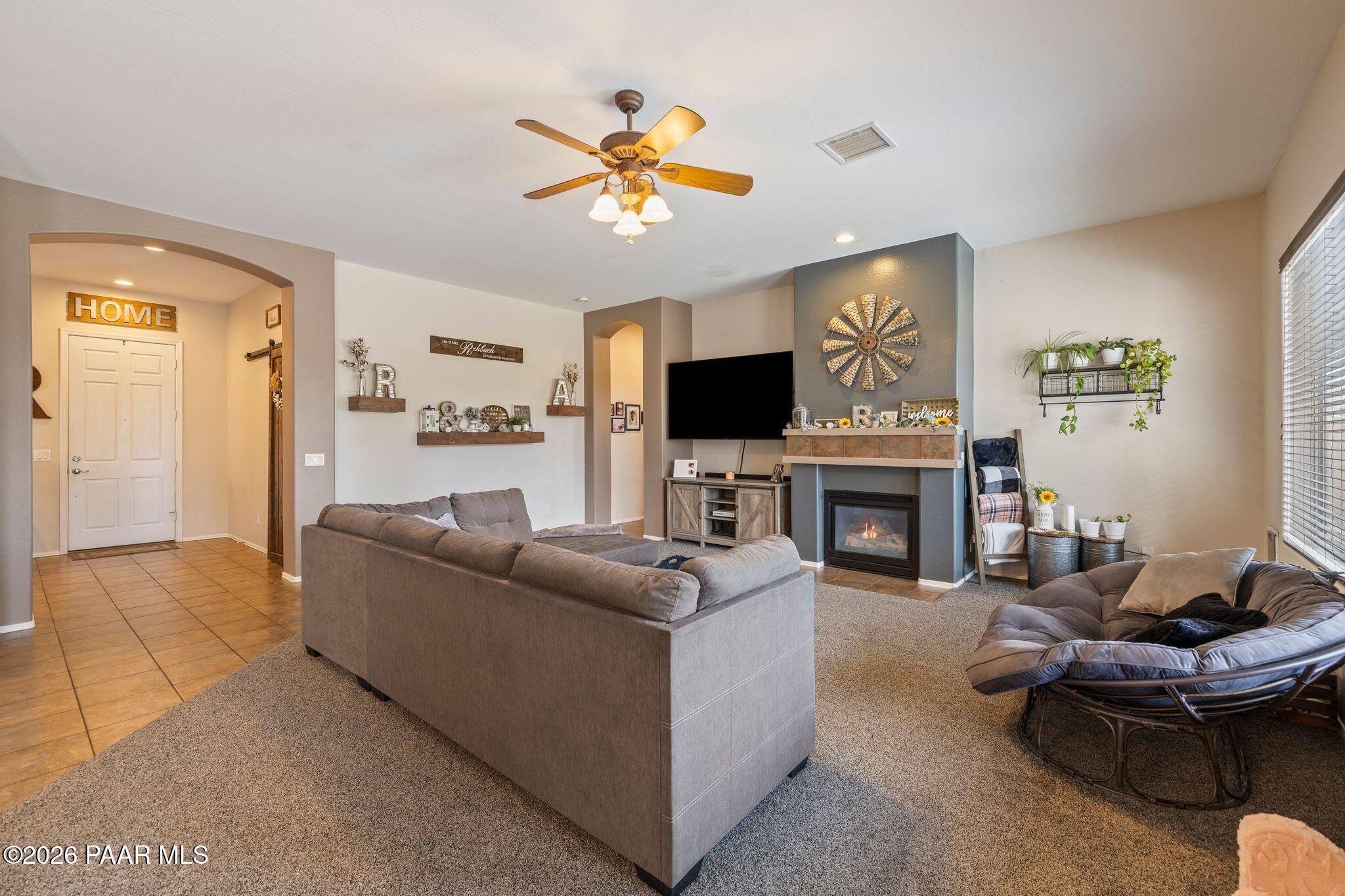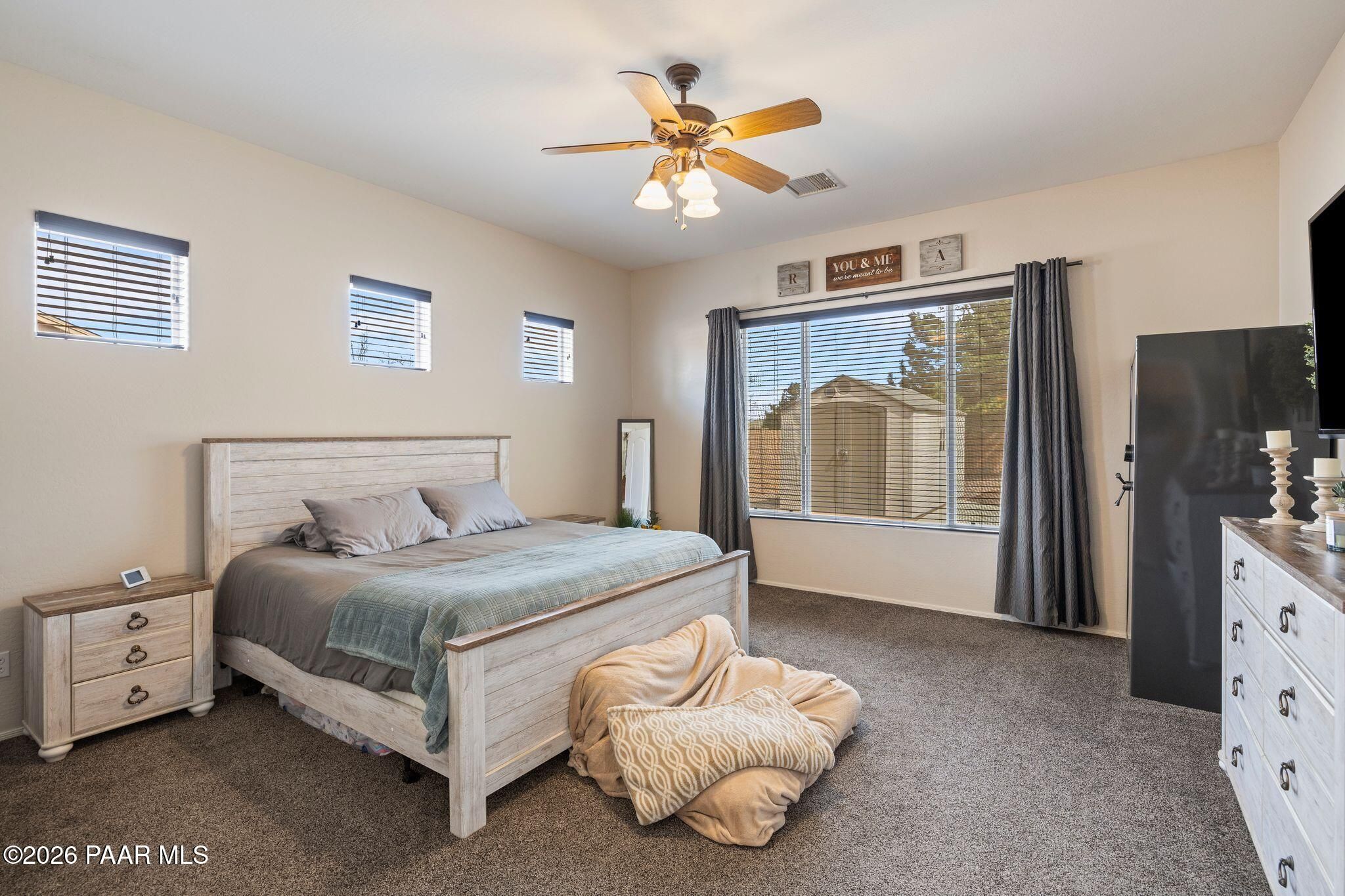 Located in the sought-after Pronghorn Ranch community, this well-maintained home offers owned solar, a three-car garage, and a generously sized lot, combining comfort, functionality, and energy efficiency in one inviting property.The open-concept floor plan creates a seamless connection between the living, dining, and kitchen areas, making the home ideal for both everyday living and entertaining. The kitchen features a center island, ample cabinetry for storage, and a functional layout that opens naturally to the main living space.The primary suite provides a comfortable retreat and includes an en suite bathroom with a soaking tub, offering a relaxing place to unwind. Additional bedrooms provide flexible space that may accommodate guests, hobbies, or workspace needs.Outdoor living is enhanced by the fully landscaped backyard, where mature trees, a covered patio, and a storage shed provide both beauty and practicality. The spacious lot offers room to enjoy outdoor dining, relaxing evenings, and Arizona's beautiful sunrises.The three-car garage complete with epoxy floor offers ample space for vehicles, storage, or recreational equipment.Conveniently located approximately 15 minutes from shopping, dining, and services in Prescott Valley, this home provides a comfortable lifestyle within one of the area's popular communities.