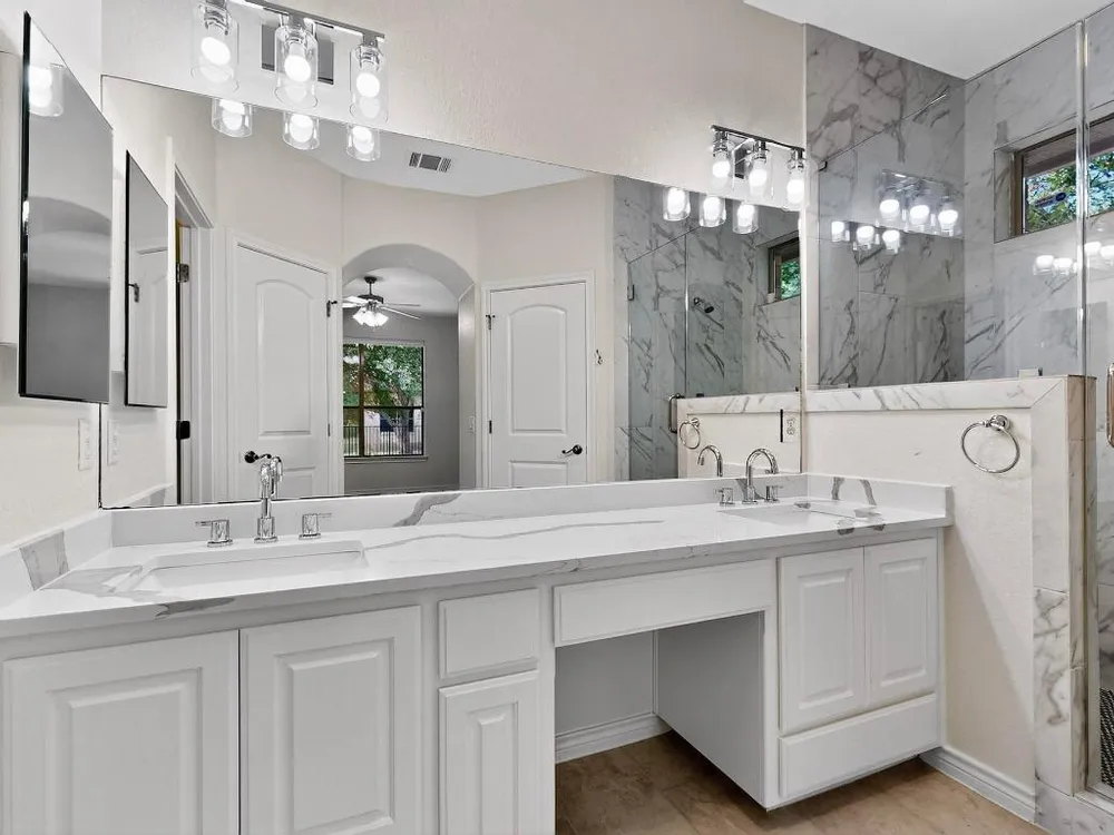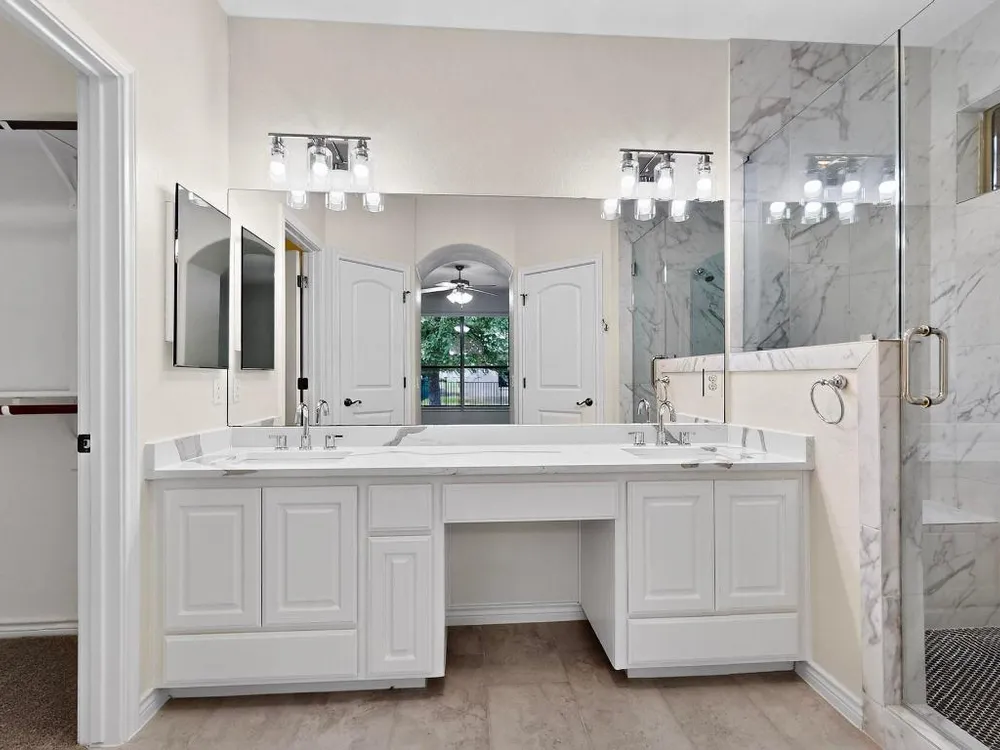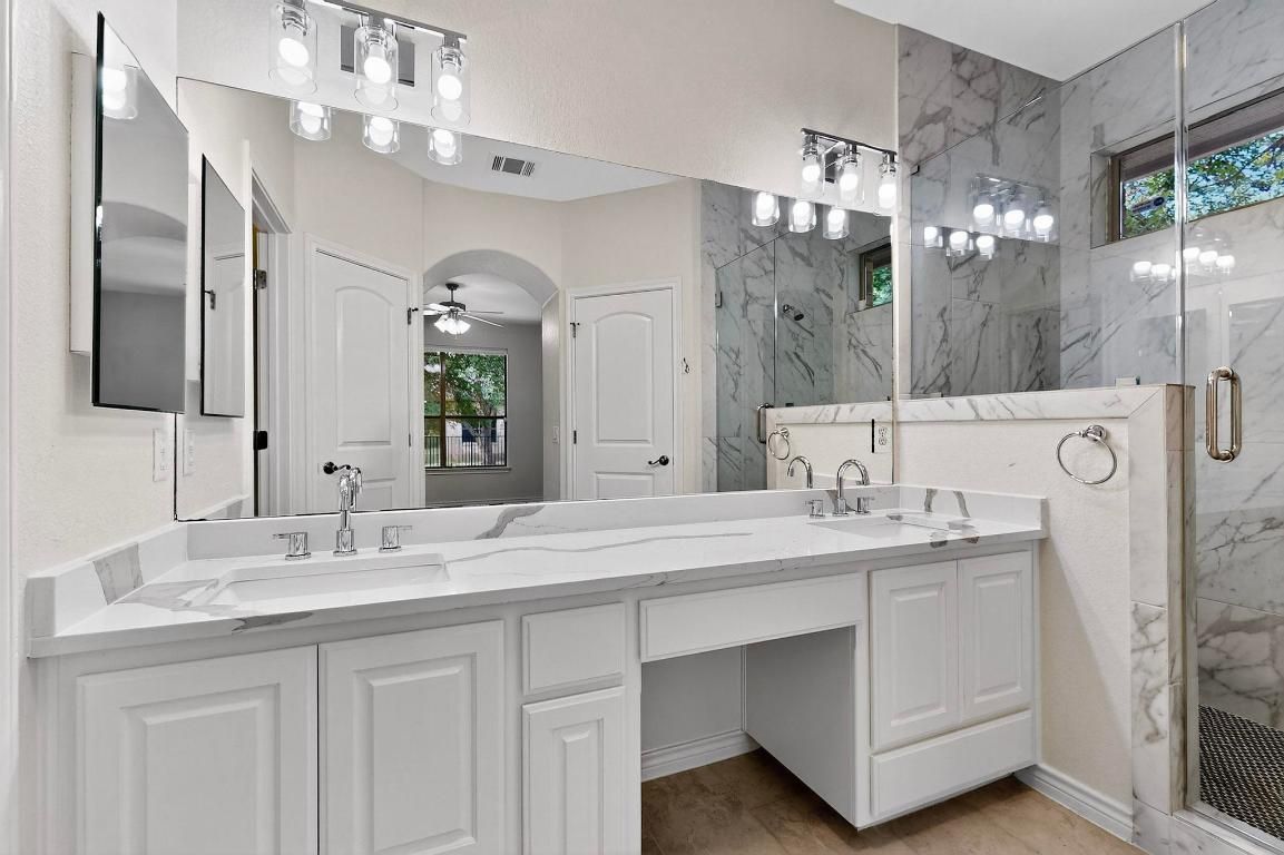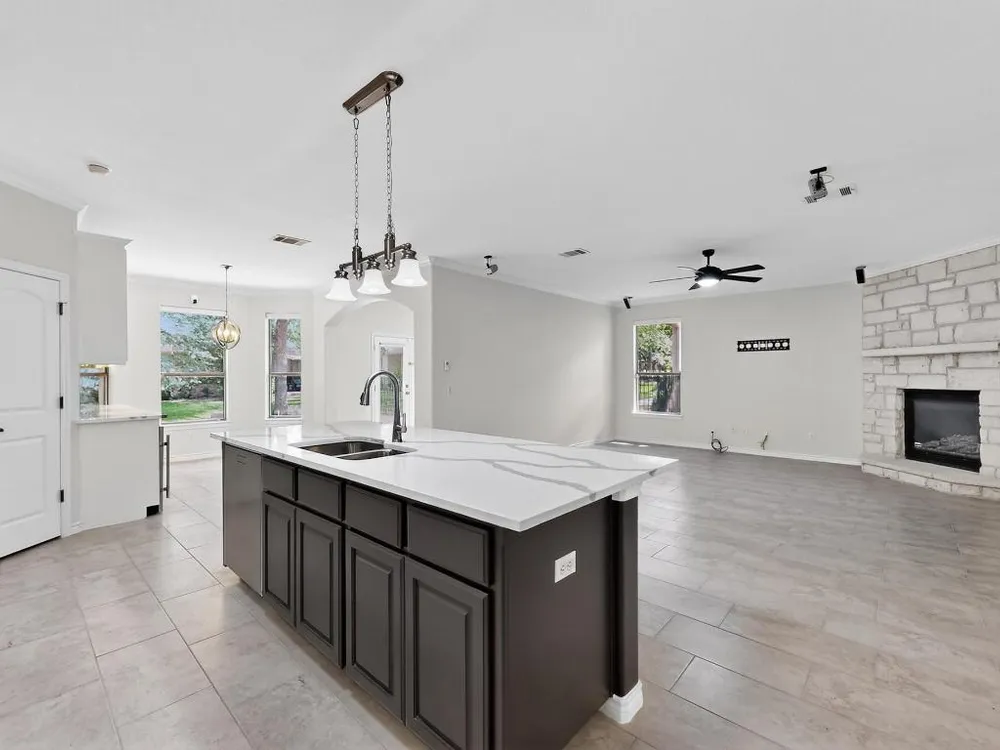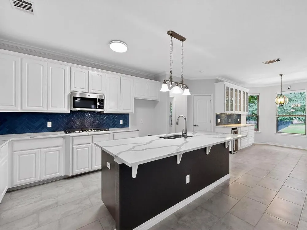 - Breakfast Bar, Ceiling Fan(s), Chandelier, Separate/Formal Dining Room, Double Vanity, Entrance Foyer, Eat-in Kitchen, Kitchen Island, Multiple Living Areas, Multiple Dining Areas, Main Level Primary, Multiple Primary Bathrooms, NoInteriorSteps, Open Floorplan, Pantry, Quartz Countertops, Soaking Tub, Walk-In Closet(s)