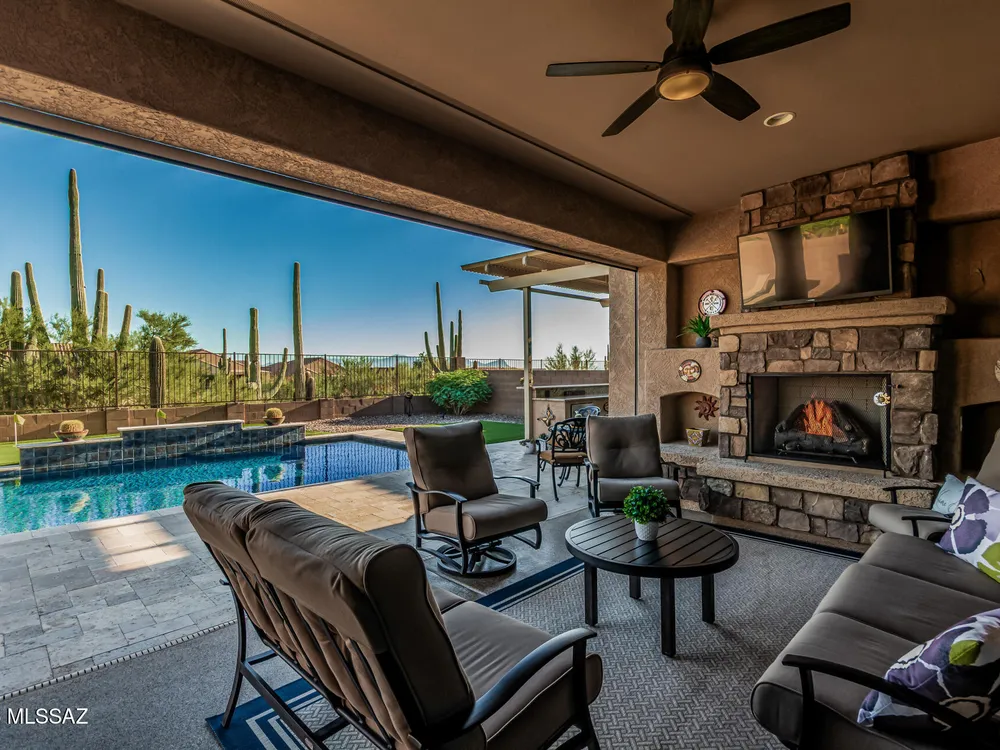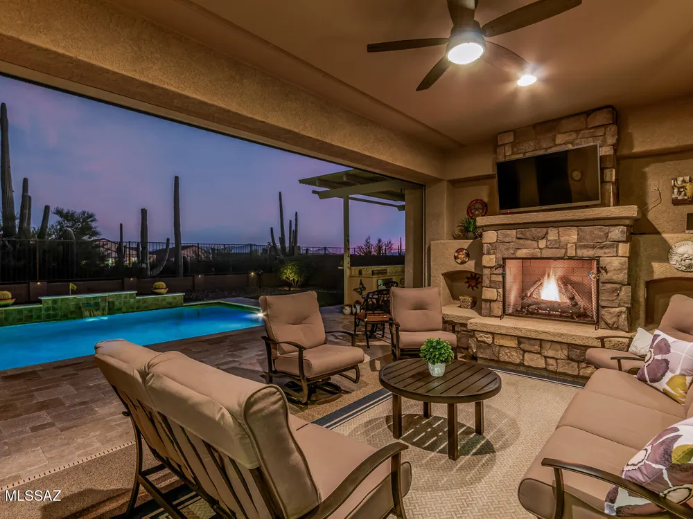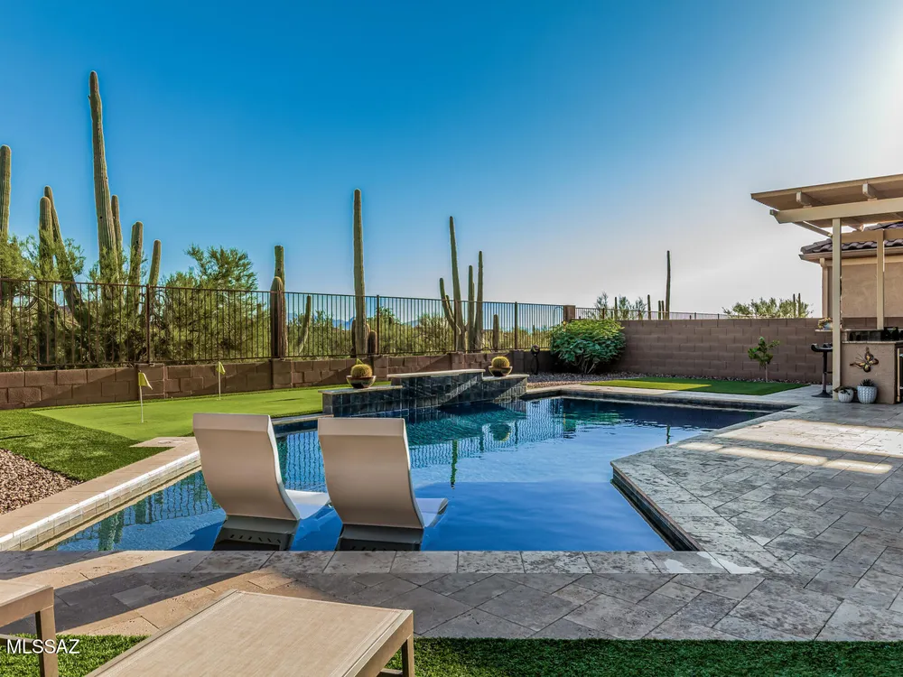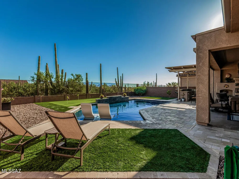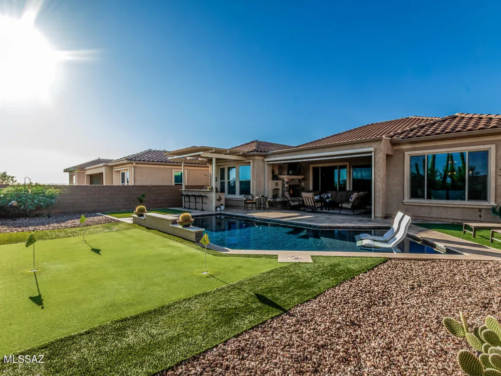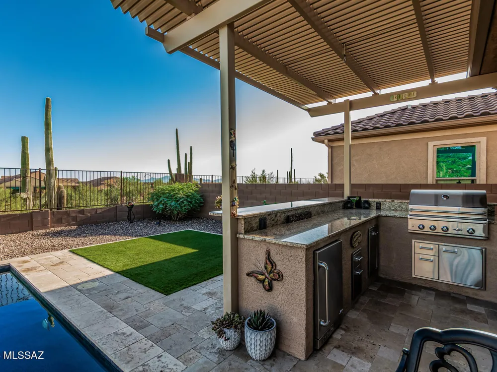 Nestled in a quiet cul-de-sac within the desirable 55+ community of Del Webb at Dove Mountain, this beautifully designed residence offers seamless indoor-outdoor living with breathtaking mountain views from every room. Step into a light-filled living space featuring high ceilings, recessed lighting, and attractive Upgraded porcelain wood-look flooring, all flowing effortlessly toward the heart of the home -- the backyard retreat. Step outside to your private oasis, with a heated Pebble Tec pool with Baja shelf await. Where a covered patio and pergola create multiple spaces for peaceful relaxation and entertaining. Enjoy cooking in the outdoor kitchen, complete with a built-in BBQ and gas fireplace, all perfectly positioned to take in the sweeping desert vistas. Whether you're hosting