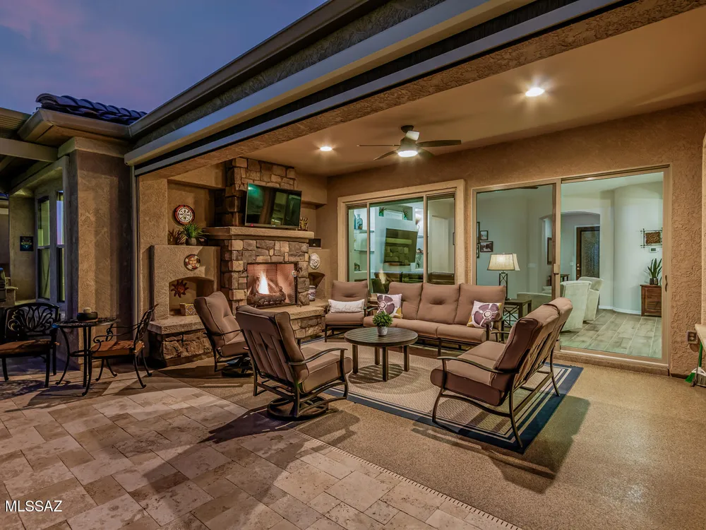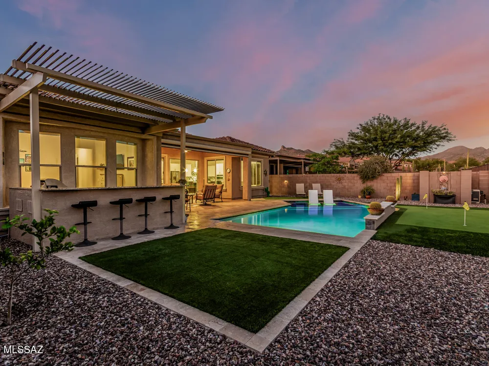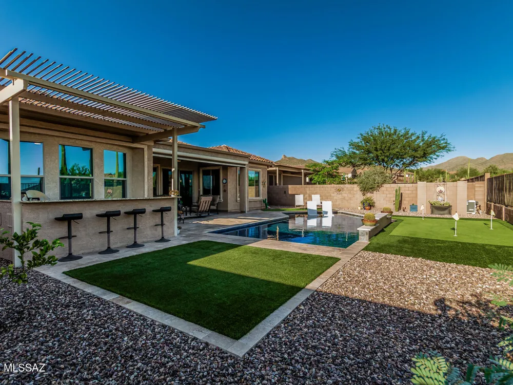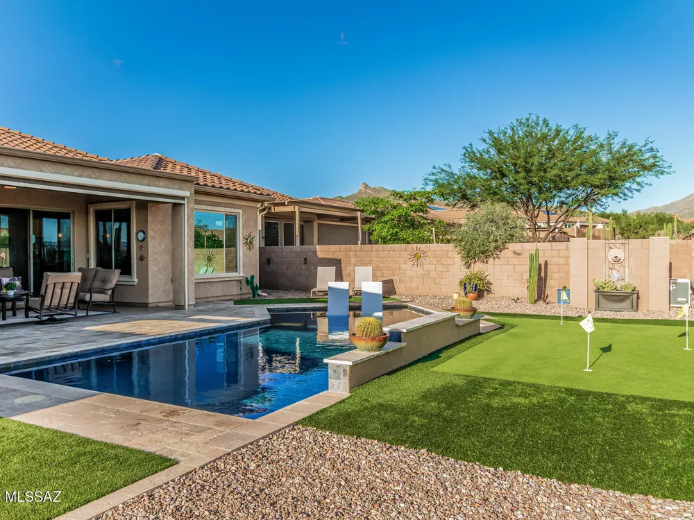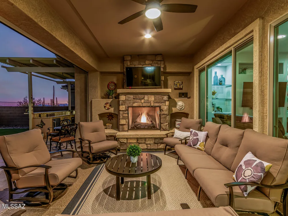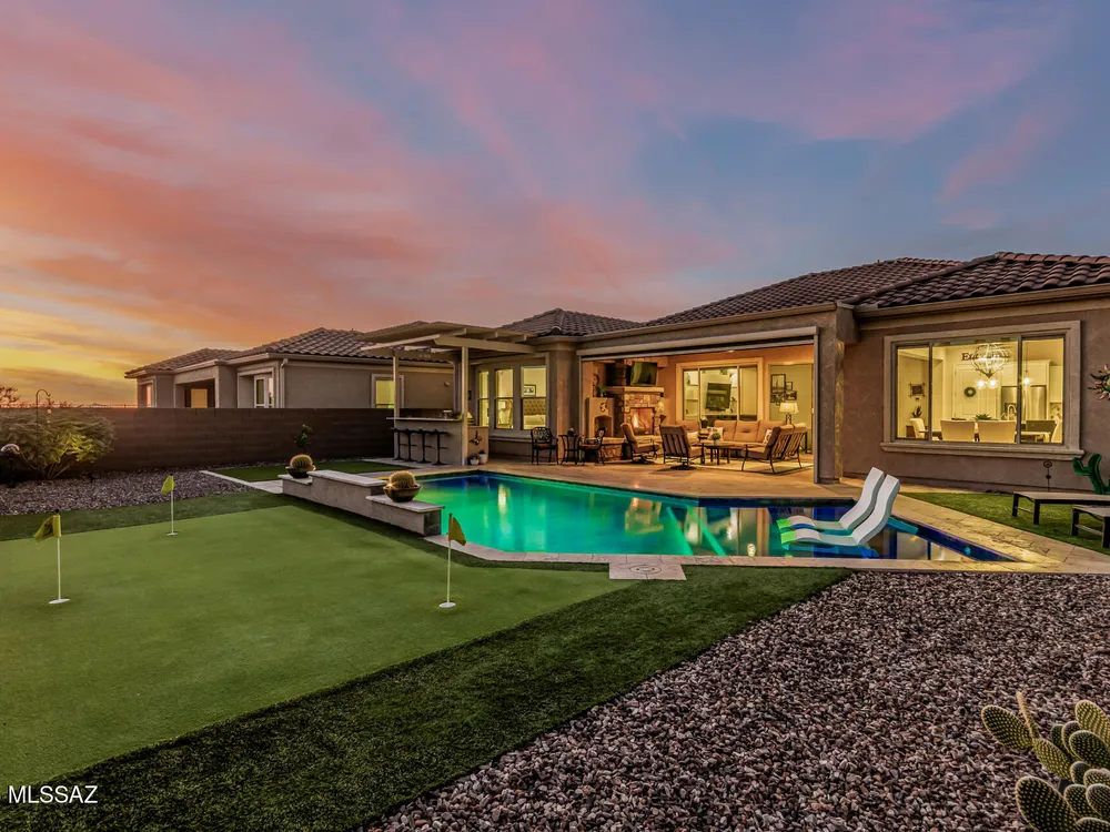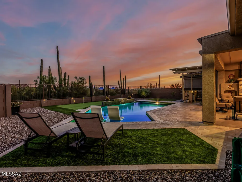 Nestled in a quiet cul-de-sac within the desirable 55+ community of Del Webb at Dove Mountain, this beautifully designed residence offers seamless indoor-outdoor living with breathtaking mountain views from every room. Step into a light-filled living space featuring high ceilings, recessed lighting, and attractive Upgraded porcelain wood-look flooring, all flowing effortlessly toward the heart of the home -- the backyard retreat. Step outside to your private oasis, with a heated Pebble Tec pool with Baja shelf await. Where a covered patio and pergola create multiple spaces for peaceful relaxation and entertaining. Enjoy cooking in the outdoor kitchen, complete with a built-in BBQ and gas fireplace, all perfectly positioned to take in the sweeping desert vistas. Whether you're hosting
