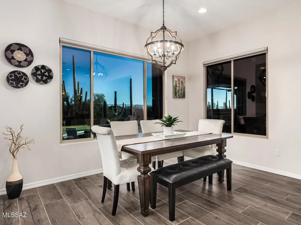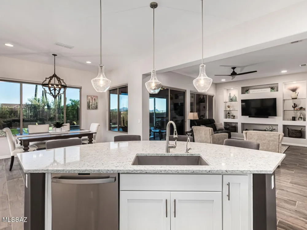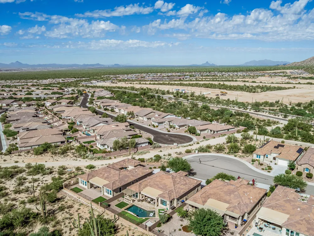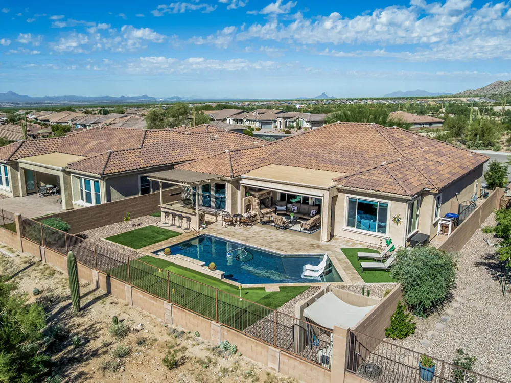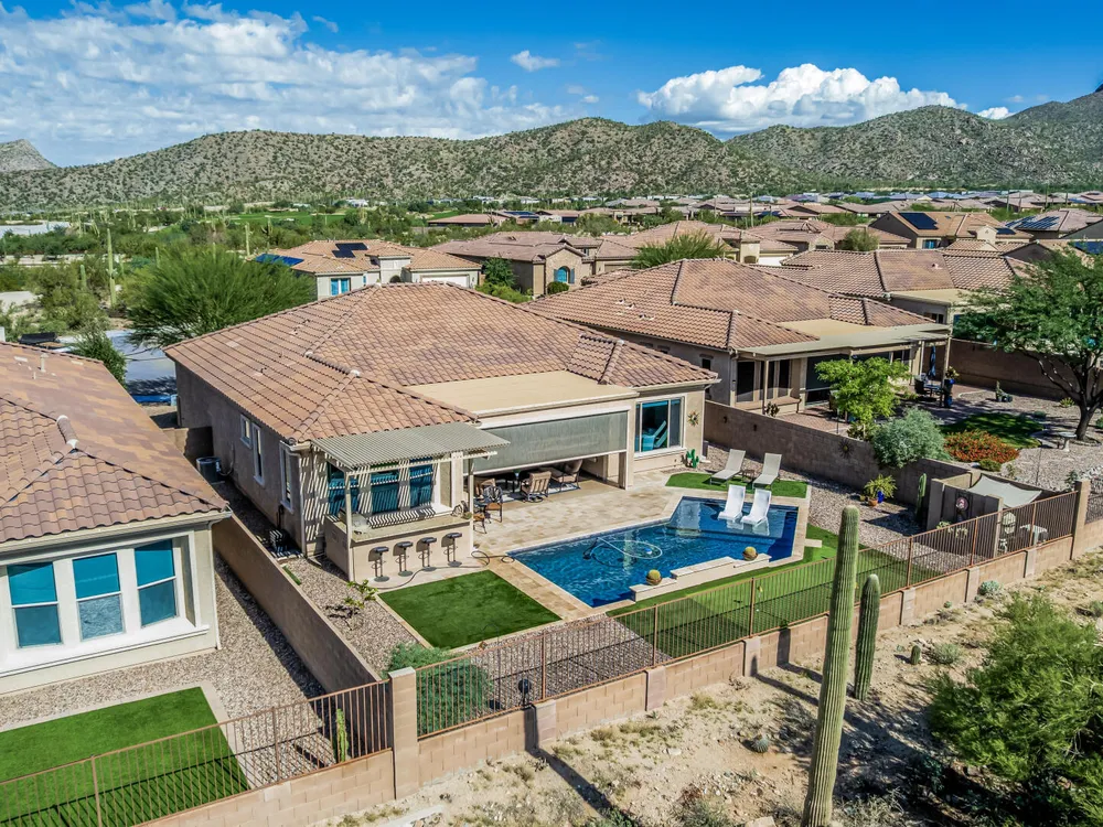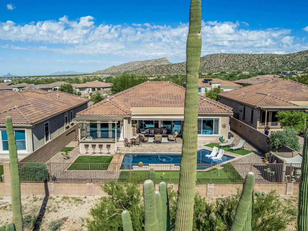 Nestled in a quiet cul-de-sac within the desirable 55+ community of Del Webb at Dove Mountain, this beautifully designed residence offers seamless indoor-outdoor living with breathtaking mountain views from every room. Step into a light-filled living space featuring high ceilings, recessed lighting, and attractive Upgraded porcelain wood-look flooring, all flowing effortlessly toward the heart of the home -- the backyard retreat. Step outside to your private oasis, with a heated Pebble Tec pool with Baja shelf await. Where a covered patio and pergola create multiple spaces for peaceful relaxation and entertaining. Enjoy cooking in the outdoor kitchen, complete with a built-in BBQ and gas fireplace, all perfectly positioned to take in the sweeping desert vistas. Whether you're hosting