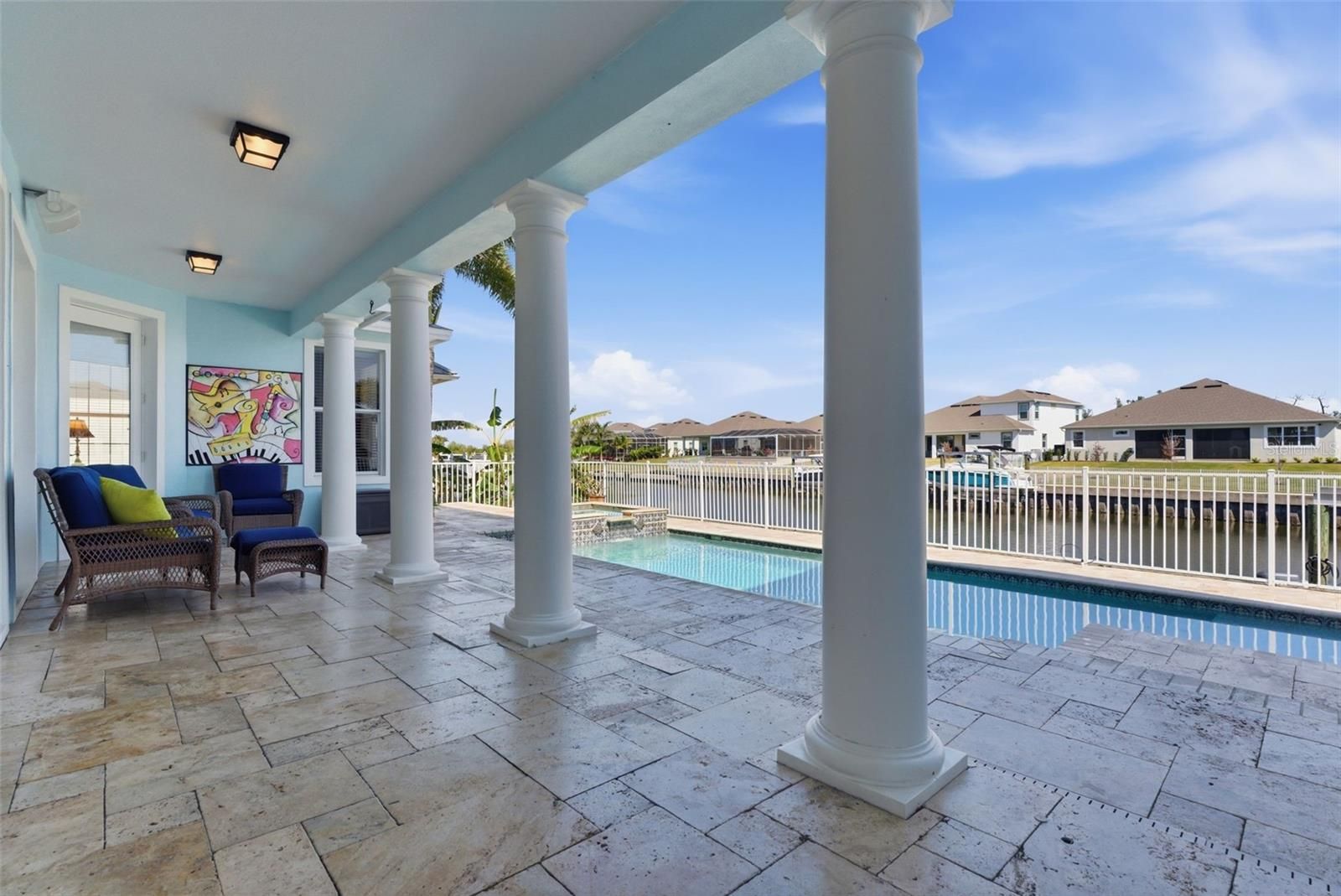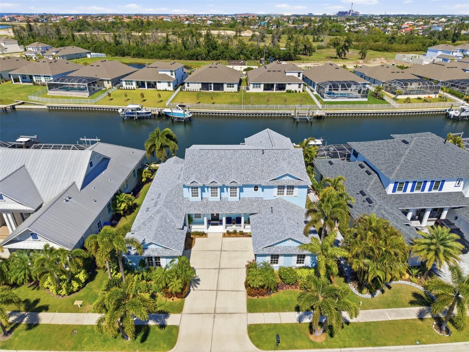 Experience elevated waterfront living in the heart of MiraBay. This beautifully maintained 4-bedroom, 4-bathroom home offers a private dock and boat lift with direct access to Tampa Bay, making it a true boater’s dream. Designed with both comfort and elegance in mind, the home features luxury vinyl & travertine flooring throughout the main level, soaring ceilings, and a wall of windows that flood the space with natural light. French doors lead to a stunning outdoor retreat with a travertine pool and spa—perfect for entertaining or relaxing in your own private oasis. The first-floor primary suite is a peaceful retreat with a spa-like en suite bathroom, while a dedicated office provides ideal work-from-home flexibility. Upstairs, a spacious bonus room with balcony adds versatility for guests or additional living space. Additional highlights include a gas range, fireplace, new roof (2024), fresh paint, and new pool equipment (2025). Enjoy all that MiraBay has to offer. Including a resort-style pool, clubhouse with restaurant, fitness center, playgrounds, and courts for tennis, pickleball, and basketball. This is waterfront living, redefined.