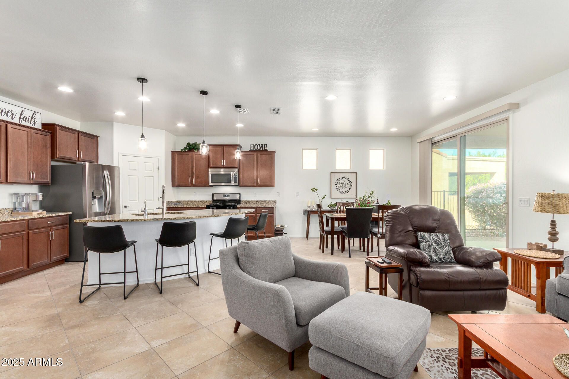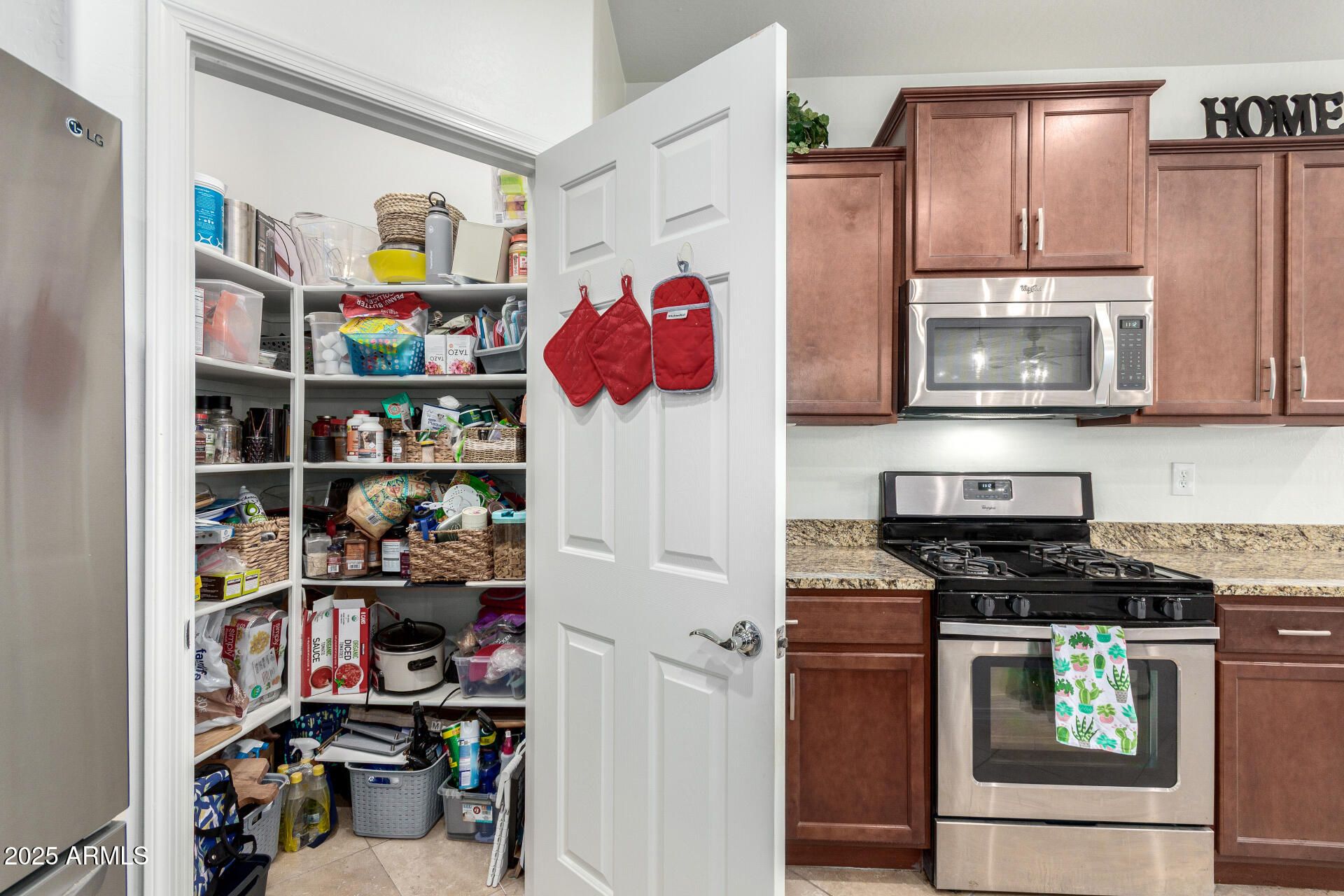 LIVE THE GOOD LIFE IN SUN CITY! Welcome to this delightful home surrounded by mature vegetation in both the front & fully fenced back yard which you'll love, offering a peaceful outdoor retreat backing to open space. Inside, the kitchen features granite counters, pendant lighting, gas stove & walk-in pantry—combining timeless elegance w/ everyday convenience.The primary suite features a bay window that fills the room w/ natural light, along w/ spacious bathroom offering dual sinks, shower w/ bench & walk-in closet—the perfect blend of comfort & luxury. You'll also appreciate the extended laundry room, providing extra storage space & added functionality for everyday living. Don't miss your opportunity to own this Hideaway, live the resort life & put a little sunshine in your retirement!! Sun City Anthem at Merrill Ranch offers a 48,000 SF recreation center w/ craft rooms for quilting, pottery, glass works, jewelry & crafts, spacious ballroom w/ stage for dancing, theatrical productions, concerts & more. PLUS full gym, work out rooms, indoor lap pool & spa, walking track, cafe area, card rooms, poker tables, pool table, ping pong table, business center, class room for interesting seminars! Troon Poston Butte Golf Course is one of the nicest in the area. Sun City offers Pickleball, Tennis, Bocce Ball, Horseshoes, Shuffleboard, clubs for all activities.......LIVE WHERE THE SURROUNDINGS DELIGHT, INSPIRE & CHALLENGE YOU!