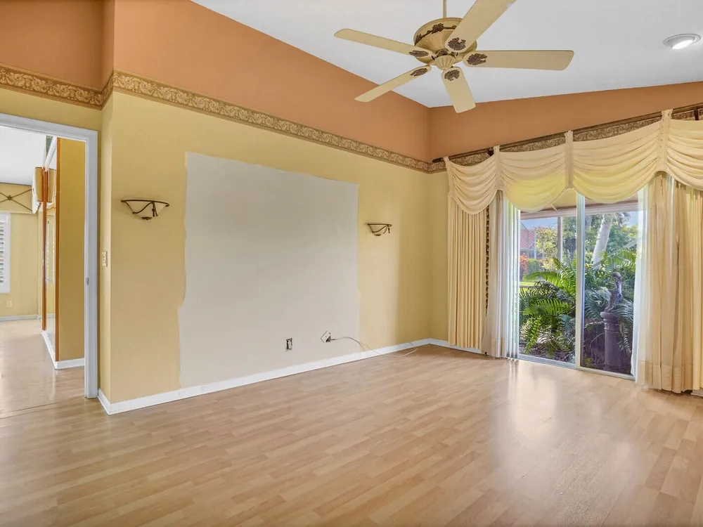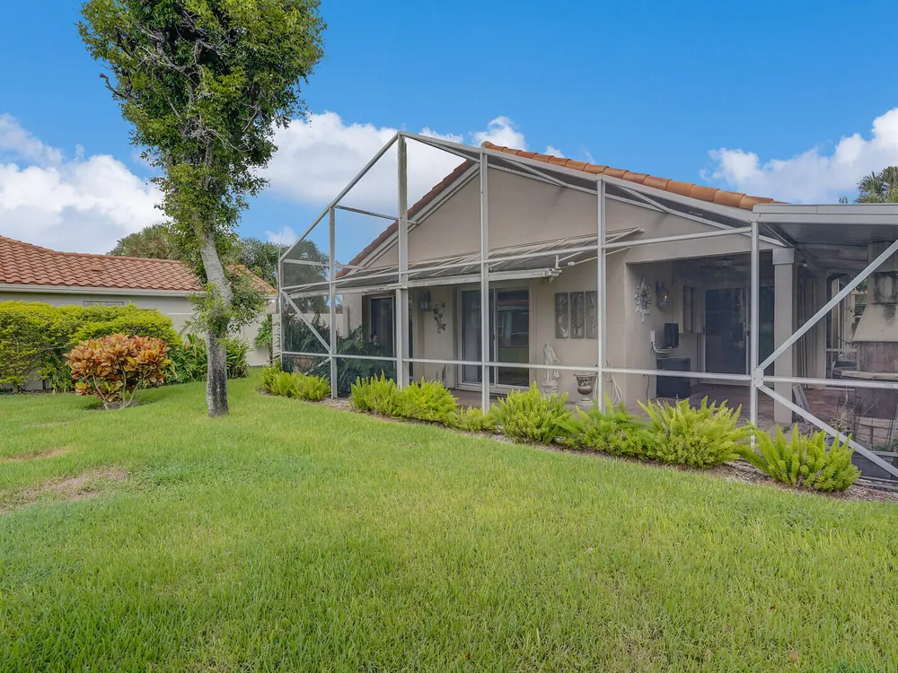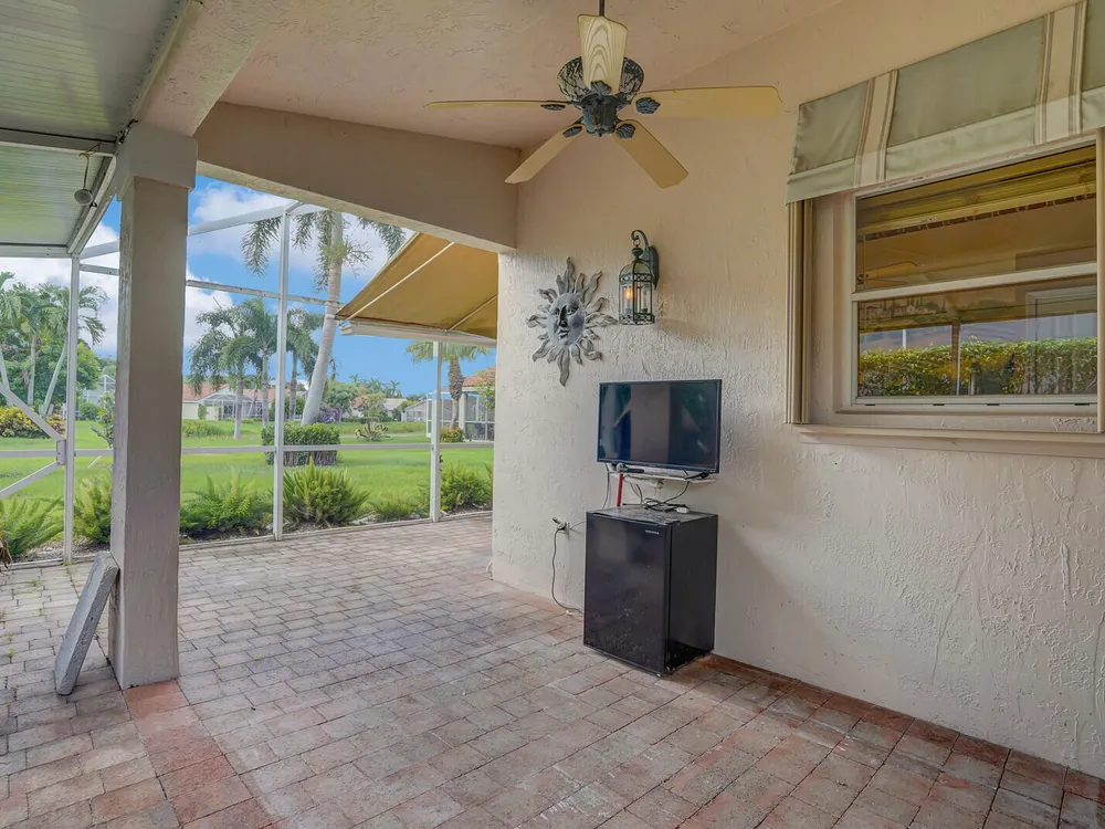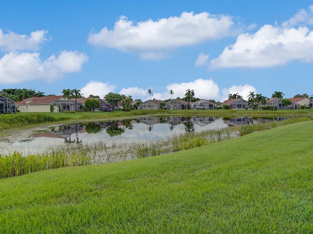 Welcome to Cascades, Boynton's premier 55+ community, where resort-style living meets the comfort of home. This inviting waterfront residence is tucked away on an oversized cul-de-sac lot & enjoys one of the community's longest backyards-where sunrises & sunsets can be viewed from extended, screened lanai. Inside, a split-bedroom layout offers privacy for guests, while vaulted ceilings lend an airy elegance to the living areas. 3rd bedroom has been opened to create a spacious family room accented by decorative wood beams & charming electric fireplace. Kitchen is ideally positioned for entertaining. Primary suite boasts a roomy walk-in closet & oversized ensuite bath. Separate laundry. 2-car garage. Laminate flooring throughout. 2009 roof, full accordion shutters & whole-house generator.
