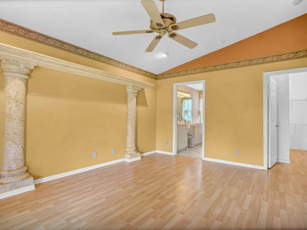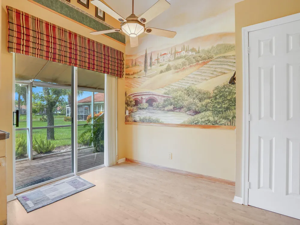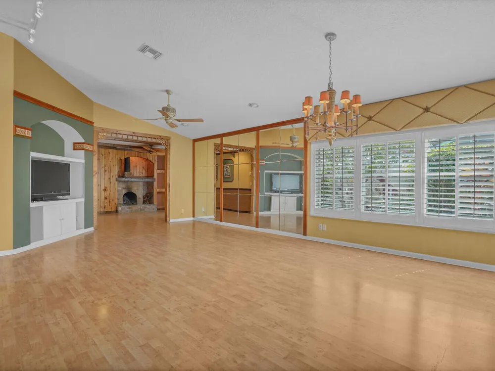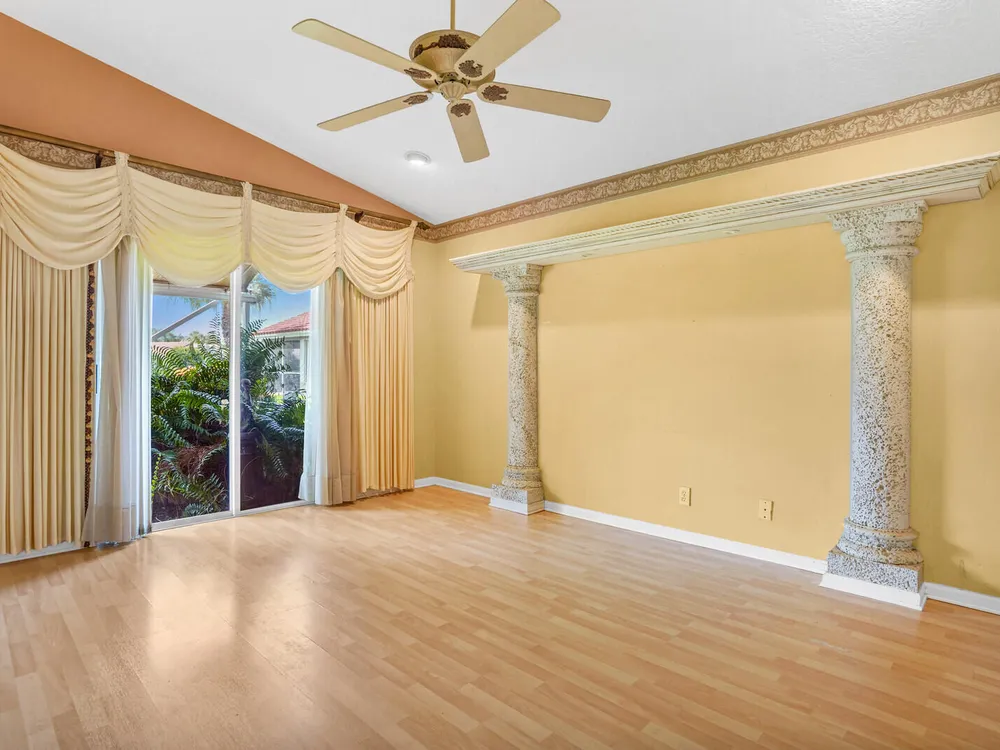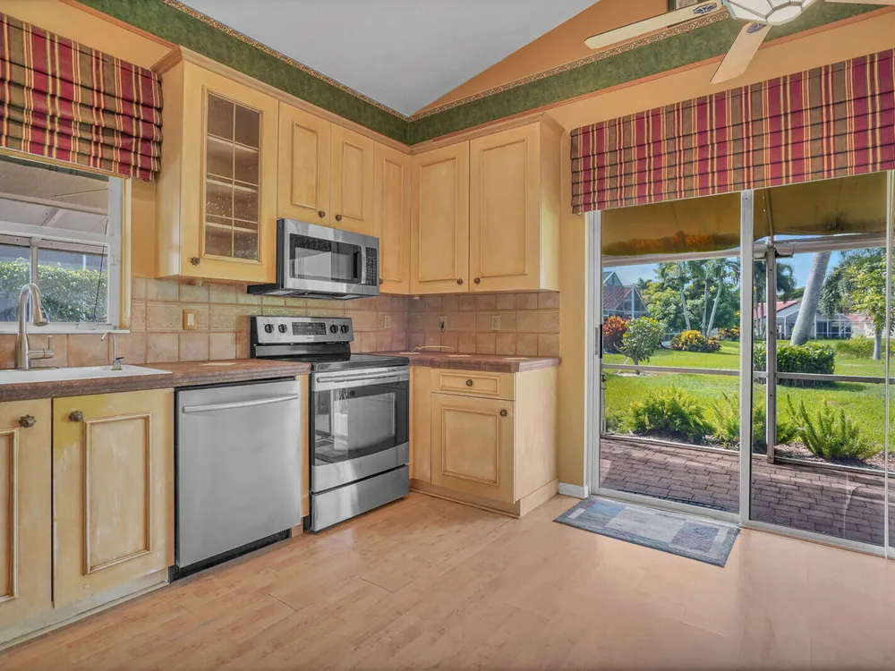 Welcome to Cascades, Boynton's premier 55+ community, where resort-style living meets the comfort of home. This inviting waterfront residence is tucked away on an oversized cul-de-sac lot & enjoys one of the community's longest backyards-where sunrises & sunsets can be viewed from extended, screened lanai. Inside, a split-bedroom layout offers privacy for guests, while vaulted ceilings lend an airy elegance to the living areas. 3rd bedroom has been opened to create a spacious family room accented by decorative wood beams & charming electric fireplace. Kitchen is ideally positioned for entertaining. Primary suite boasts a roomy walk-in closet & oversized ensuite bath. Separate laundry. 2-car garage. Laminate flooring throughout. 2009 roof, full accordion shutters & whole-house generator.