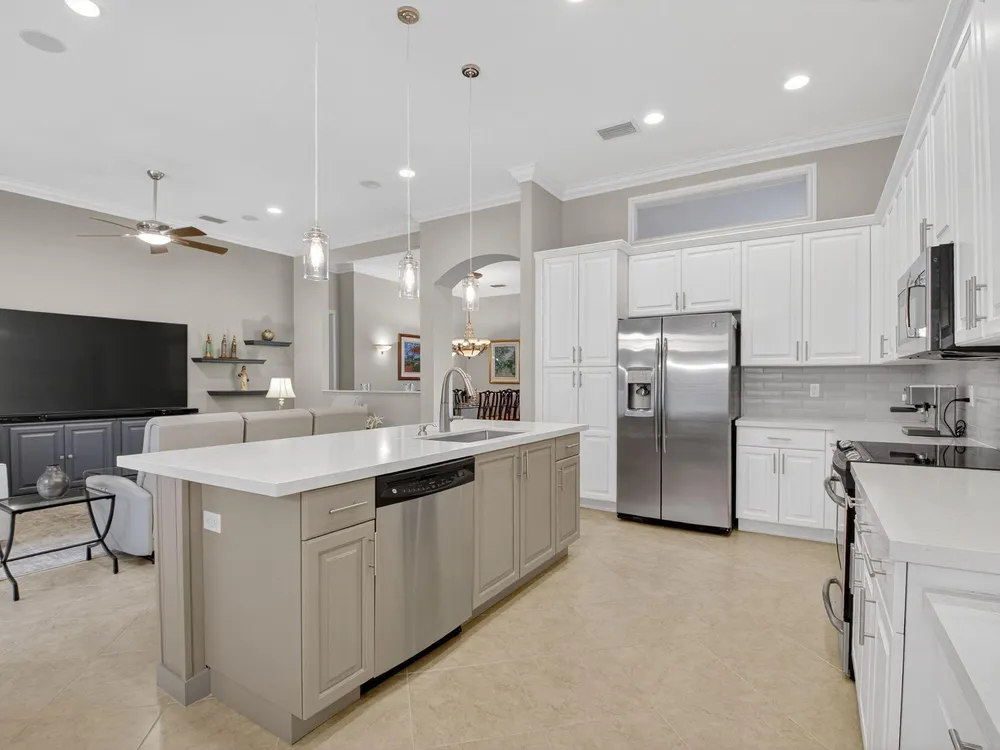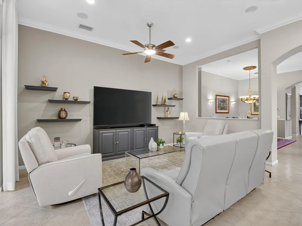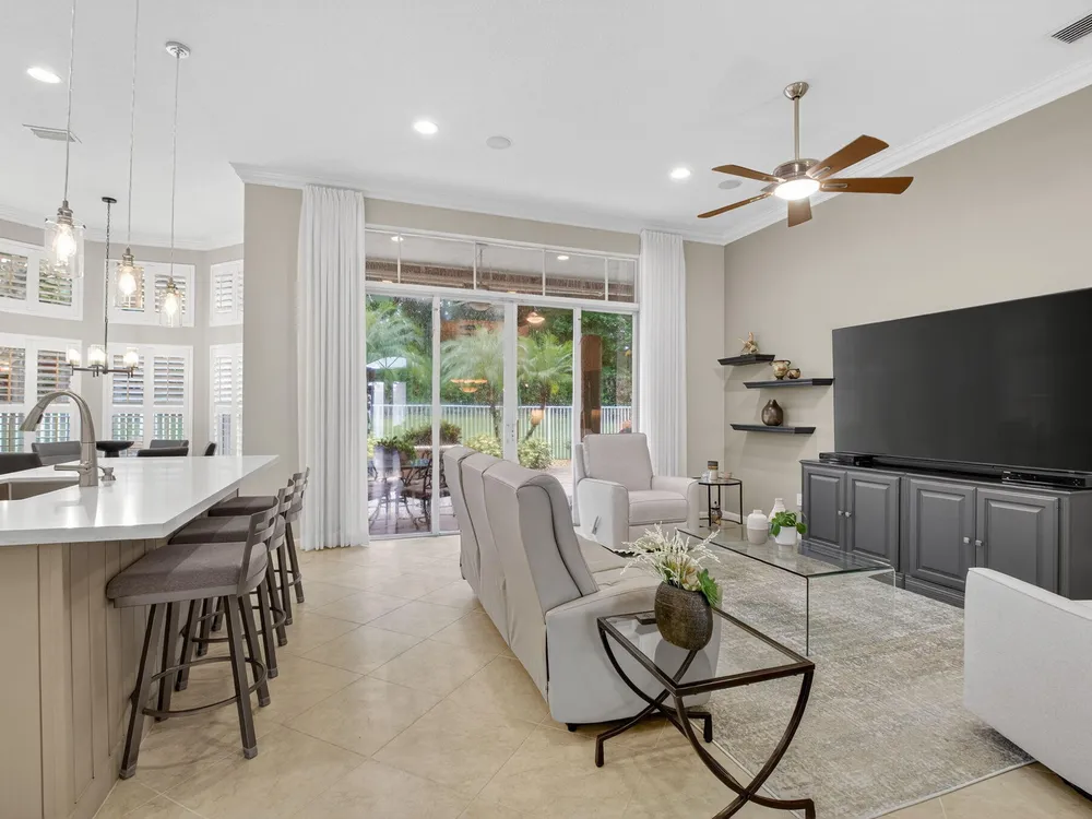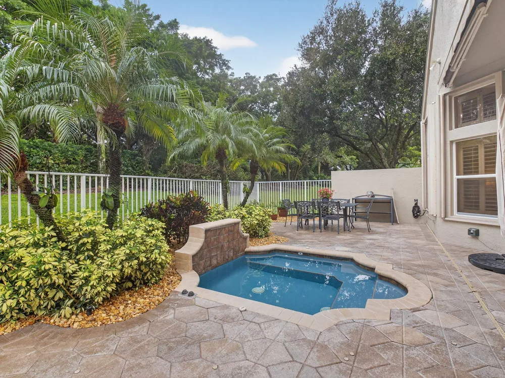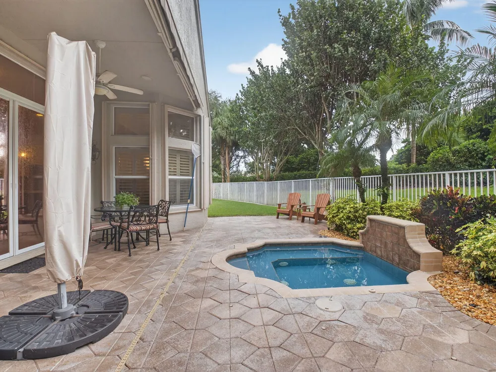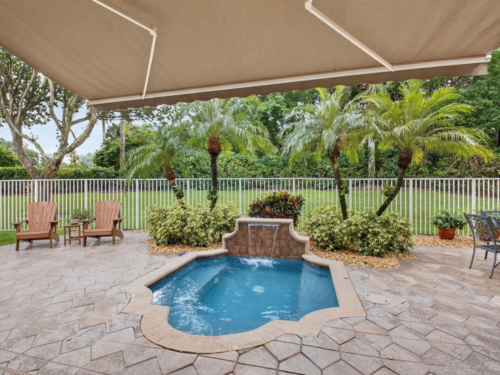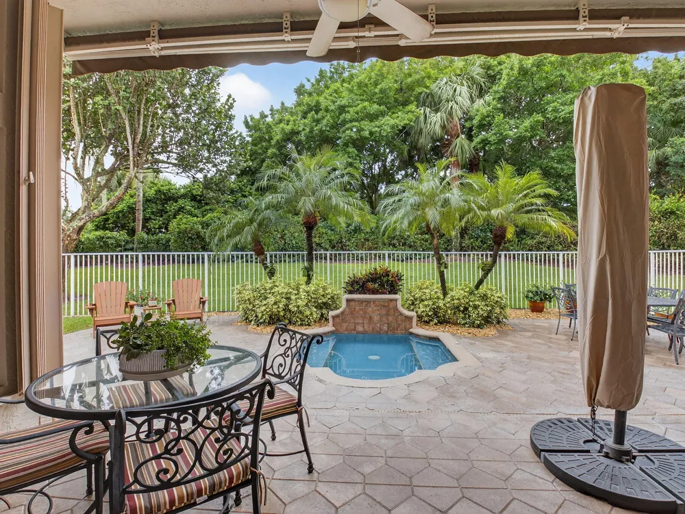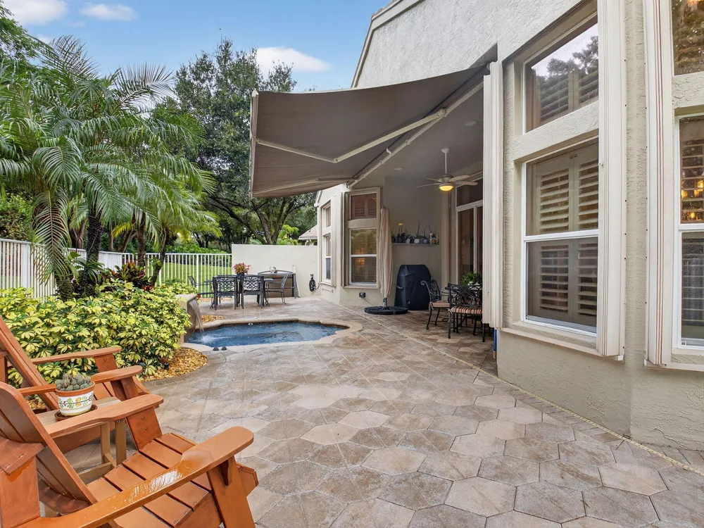 Fabulous updated 4BR/2.1BA Gibraltar model w/wall opening sits on oversized fenced in lot (8396 sq ft) w/room for a pool. Enjoy your private in-ground SPA with new heater & pump, plus 20' motorized retractable awning perfect for relaxing or entertaining. Contemporary kitchen w/quartz counters, updated island & pullouts in all cabinets, Both kitchen & baths shine with quartz finishes. Plantation shutters add timeless style. Additional highlights include custom closet systems for organized living, extended garage w/epoxy flooring, accordion shutters for all windows. With its open, modern layout and luxurious touches, this home truly stands out--move-in ready! Enjoy resort-style clubhouse, cafe, fitness center, lap & resort pools, tennis, pickleball, bocce, billiards, social events & more.