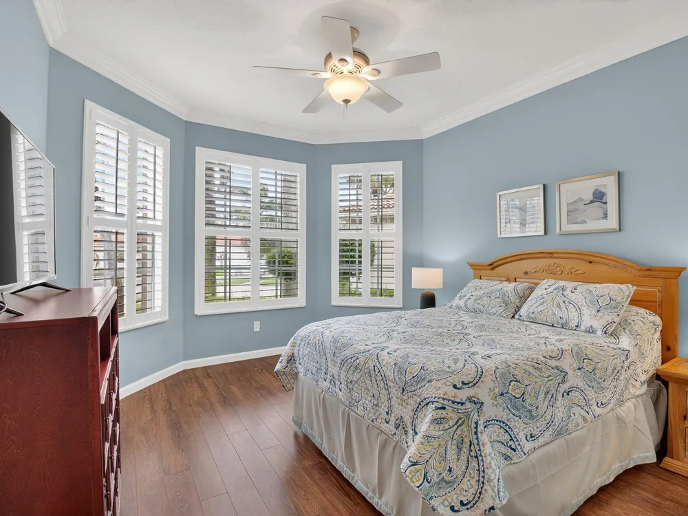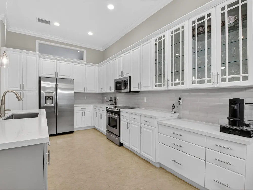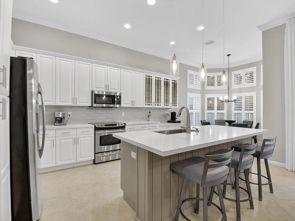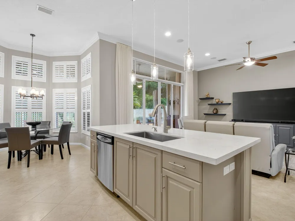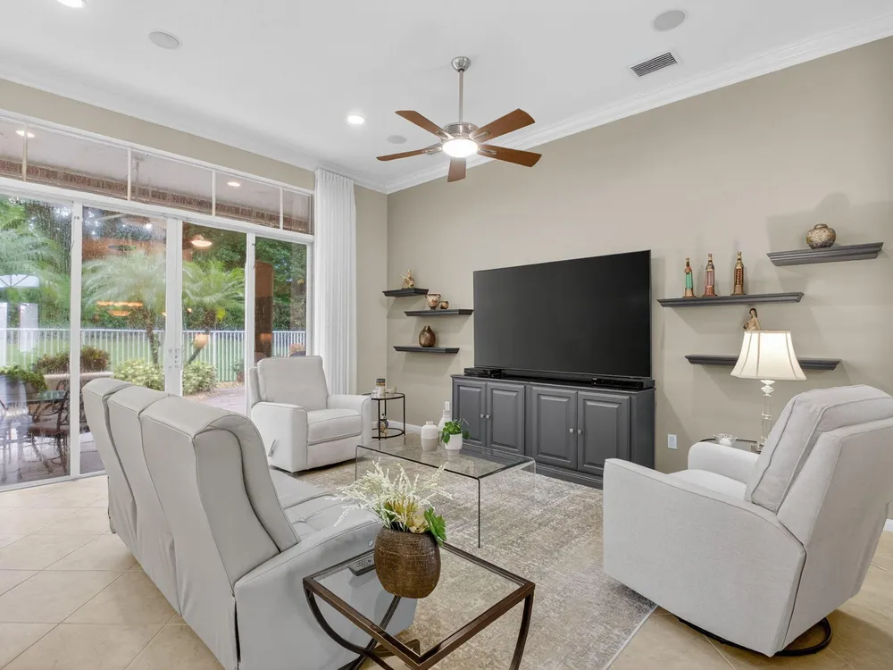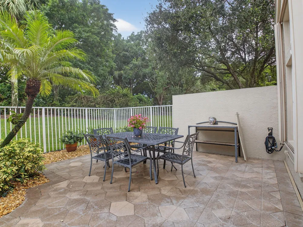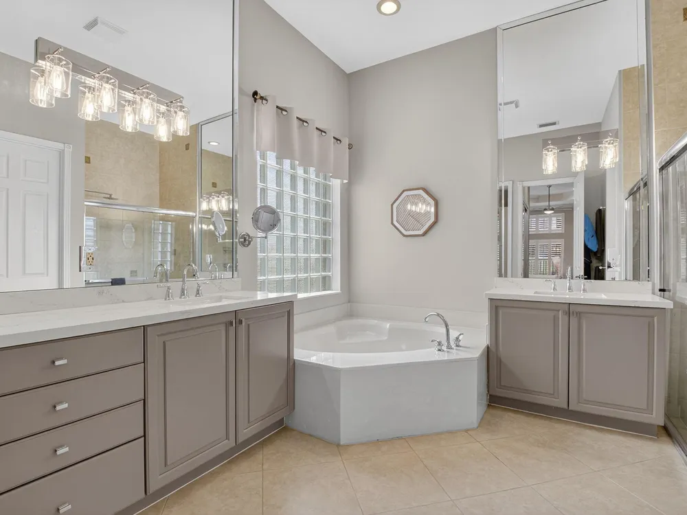 Fabulous updated 4BR/2.1BA Gibraltar model w/wall opening sits on oversized fenced in lot (8396 sq ft) w/room for a pool. Enjoy your private in-ground SPA with new heater & pump, plus 20' motorized retractable awning perfect for relaxing or entertaining. Contemporary kitchen w/quartz counters, updated island & pullouts in all cabinets, Both kitchen & baths shine with quartz finishes. Plantation shutters add timeless style. Additional highlights include custom closet systems for organized living, extended garage w/epoxy flooring, accordion shutters for all windows. With its open, modern layout and luxurious touches, this home truly stands out--move-in ready! Enjoy resort-style clubhouse, cafe, fitness center, lap & resort pools, tennis, pickleball, bocce, billiards, social events & more.
