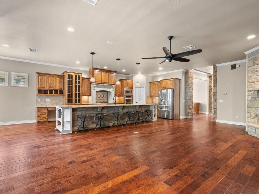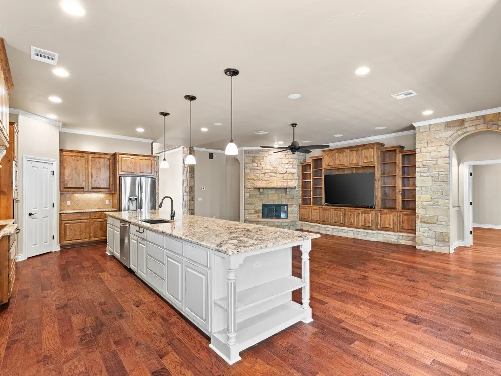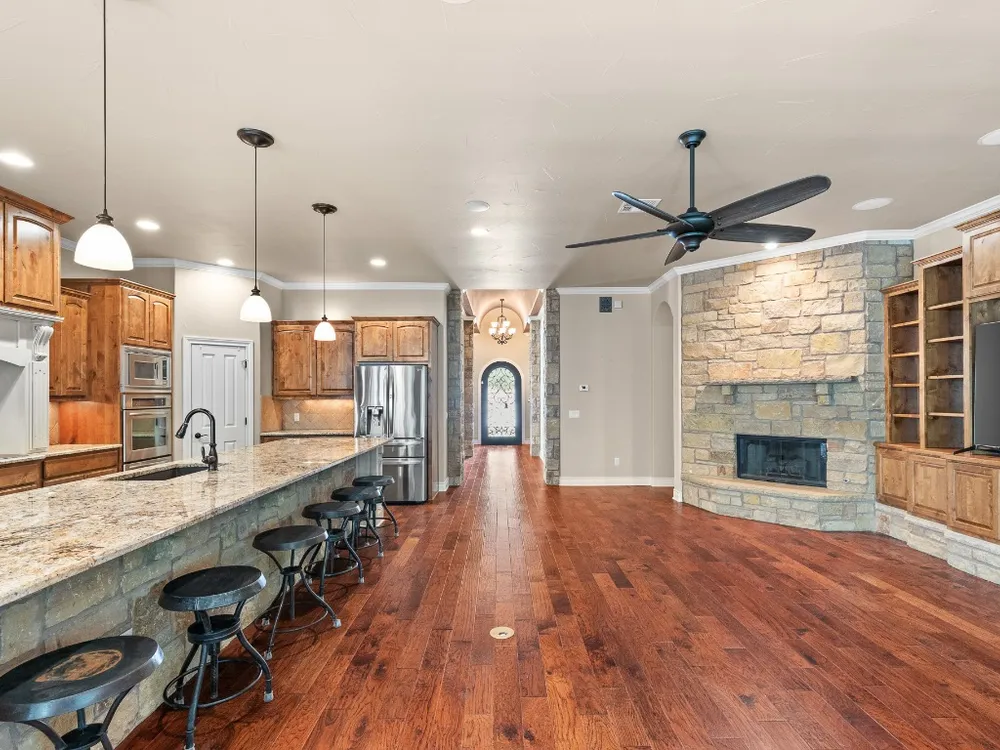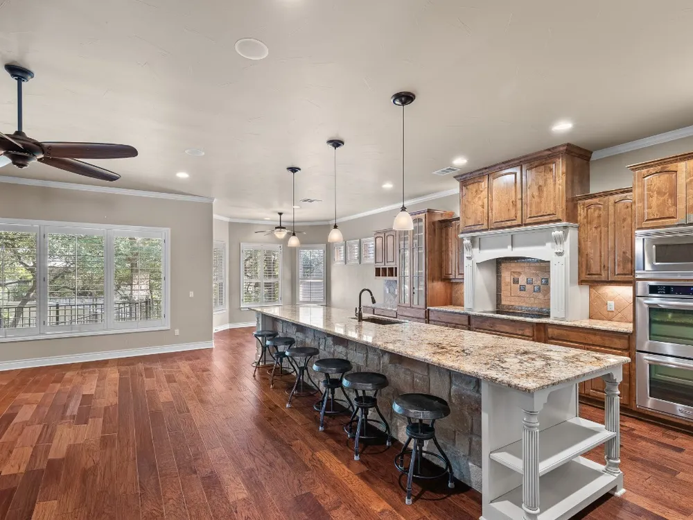 - Breakfast Bar, Bookcases, Built-in Features, Ceiling Fan(s), Separate/Formal Dining Room, Entrance Foyer, Granite Counters, Kitchen Island, Multiple Living Areas, Multiple Dining Areas, Multiple Primary Bathrooms, NoInteriorSteps, Pantry, Natural Woodwork, Walk-In Closet(s)