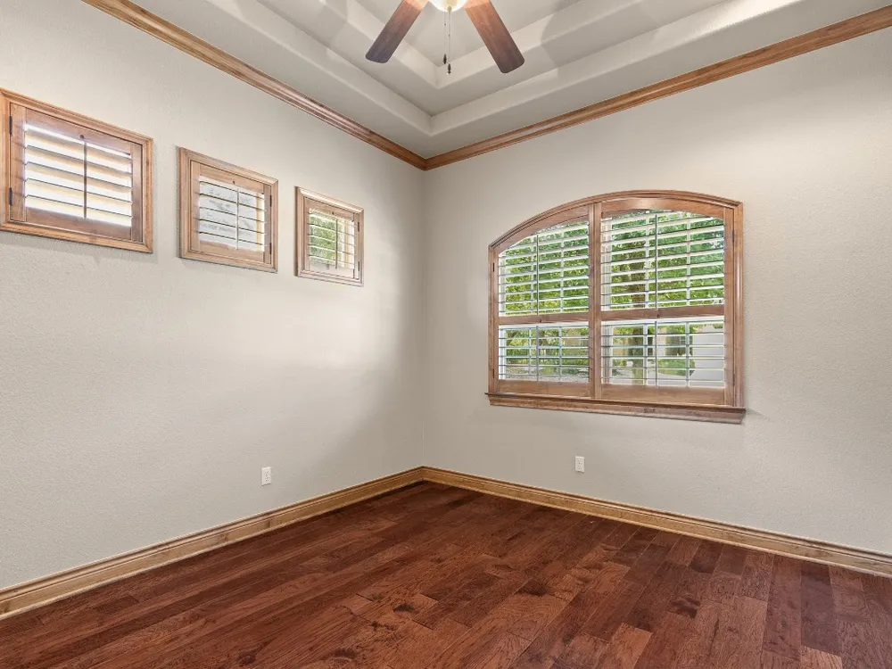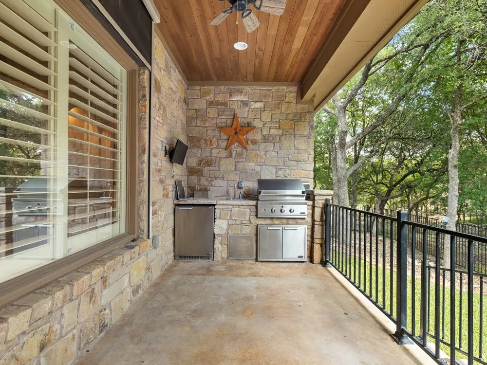 Located on heavily treed greenspace - you can barely see your neighbors behind you * Featuring a 3-car garage, 3 bedrooms, 2 full and 1 half bath, a handsome dedicated office and - did I mention an outdoor kitchen with a DCS Grill * The entry greets you with a stunning barrel ceiling and designer lighting * Wood flooring flows thru the whole home, except for the 2 guest bedrooms * A meticulously crafted kitchen features a 17' island, under and over cabinet lighting, designer hood vent over the electric cooktop and a planning desk for daily scheduling * Large living area with gas fireplace and wall of built-ins that include the TV and all components for the surround sound currently in place. A large window provides panoramic views of the gorgeous, treed back yard * There is an outdoor electric, remote control blind that also provides privacy for this window * Primary bedroom with tray ceiling, plantation shutters and of course the beautiful wood floors * There are his and her closets * Spa like primary bath offers sconce lighting and overhead lighting, dual vanity, oversized walk-in shower and a customized tile design in the floor * A formal dining area is already prepared for your finest meals and entertaining. * It includes built in storage, buffet and wine racks * 2 additional guest bedrooms have generous sized closets * The Outdoor Kitchen is complete with a DCS Grill, a built-in refrigerator, sink and a mounted TV. Top all this off with a desirable 3 car garage complete with finished floors * Washer, Dryer and 2 refrigerators will also convey. Roof 2020.