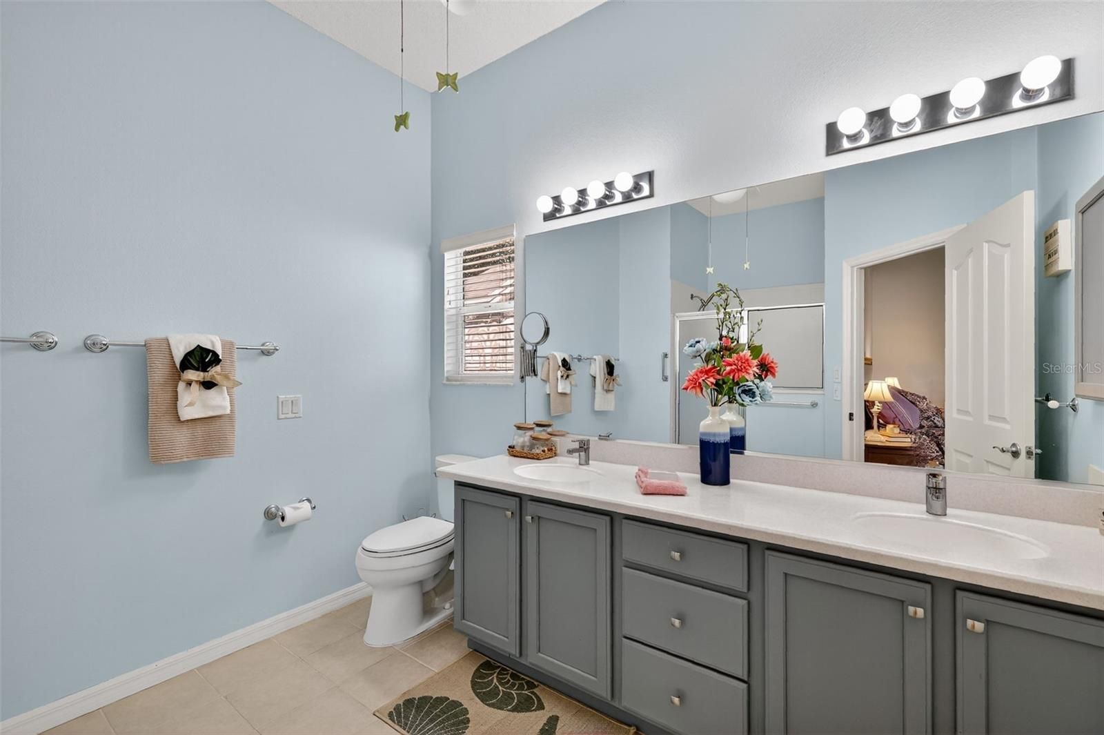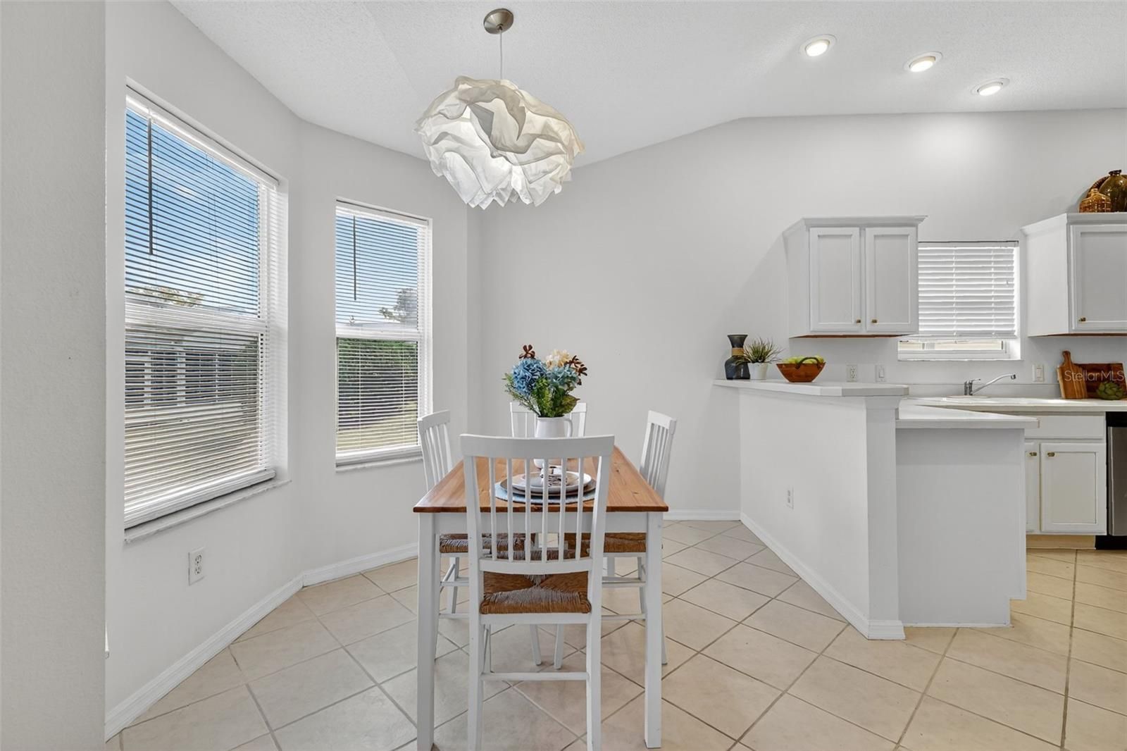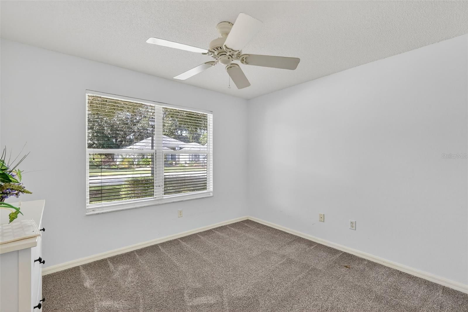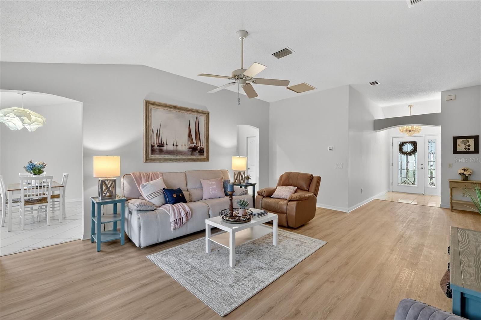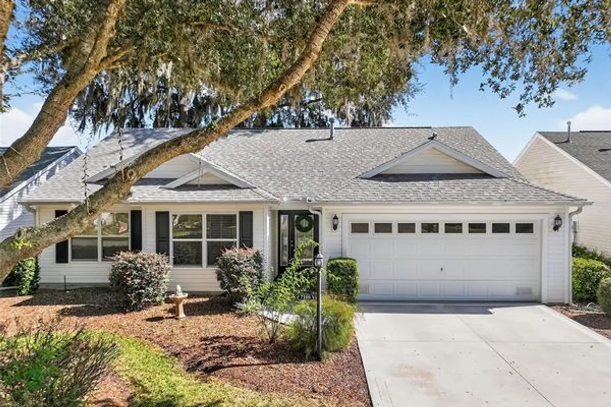 Welcome to the serene Village of Chatham in The Villages & step into this Whispering Pine floorplan. It features a split layout with 3 bedrooms and 2 bathrooms along with a 2-car garage. The property boasts curb appeal, enhanced by landscaping and painted sidewalk and driveway. Upon entering, you are welcomed by a tiled foyer with a chandelier. The main living area showcases VAULTED CEILINGS & NEW BEAUTIFUL laminate flooring. The living room offers glass French doors that lead to the screened lanai featuring a PAINTED FLOOR for your OUTDOOR enjoyment. The kitchen offers laminate countertops, modern cabinets, stainless steel appliances, and a gas stove, complemented by a breakfast nook with great natural lighting. The guest bedrooms apart from the master, ensuring PRIVACY for both you and your guests. The bedroom without a closet includes a fan, ample natural light from the window, and NEW LVP flooring. It can easily be used as an office as well as a bedroom. A linen closet is conveniently located in the hallway leading to the guest bathroom, which includes a tiled shower with tub. The other guest bedroom features a fan, window for lighting, and carpet. The MASTER BEDROOM comes with an EN SUITE bathroom and a WALK-IN CLOSET. ROOF 2021. This property is in a GREAT LOCATION, GOLF CART DRIVE to the VA, close to golf courses, swimming pools, recreational facilities, shopping, and dining options. Residents enjoy the nearby adult pool, while the Chatham Recreation Center features one of the area's family pools, ideal for the grandkids! The Nancy Lopez Country Club is just down the street, complete with a restaurant, driving range, pro shop, and golf academy. Four executive courses are in close proximity: Briarwood, Walnut Grove, Oakley, and Amberwood! Don’t miss the chance to see this home TODAY!