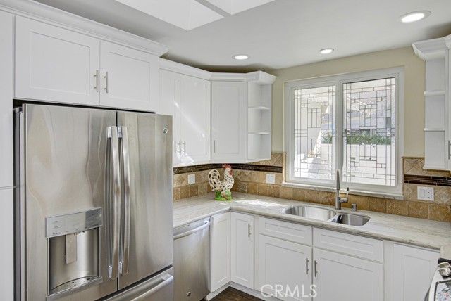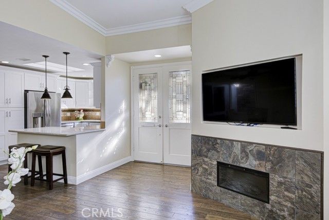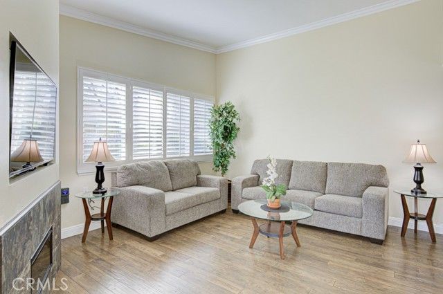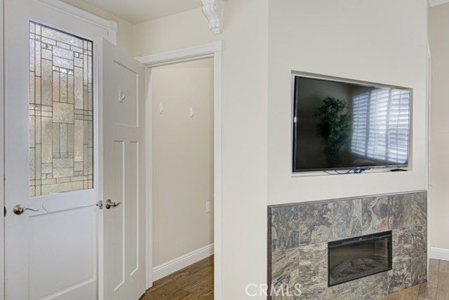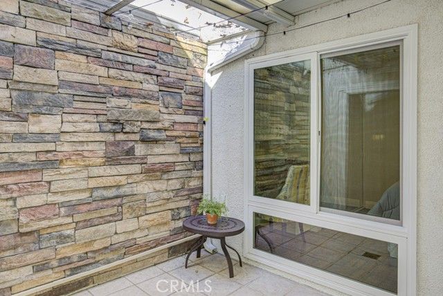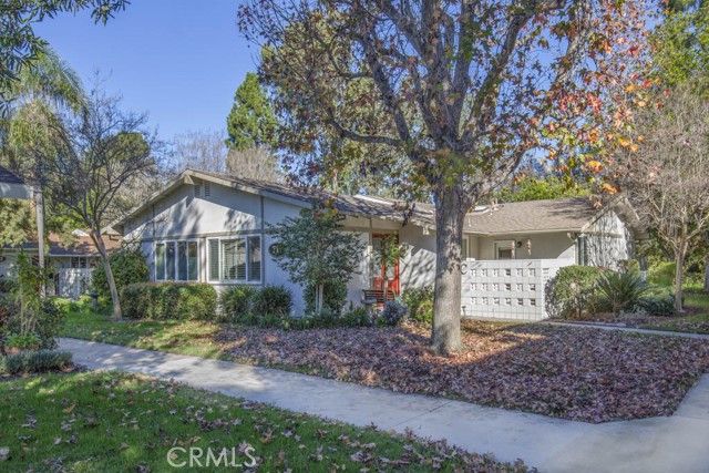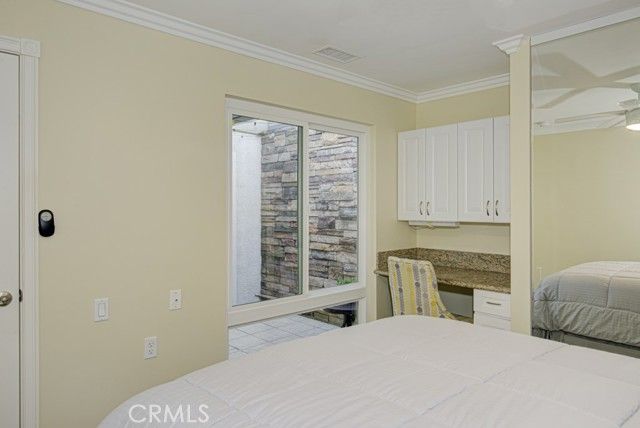 Charming cottage-style home with beautiful double leaded-glass entry doors. Light-filled living room features vaulted ceilings, plantation shutters, and a built-in electric fireplace with TV. Dining area overlooks a private atrium with stacked stone accent wall, offering peaceful breezes and indoor-outdoor living. Spacious storage closet near entry adds exceptional functionality. Updated kitchen is bright and inviting with skylight, recessed lighting, granite countertops, custom white Shaker cabinetry, stainless steel appliances, tile backsplash, and abundant storage including carousel cabinets and counter seating. Guest bedroom includes mirrored closet doors and a built-in desk overlooking the atrium. Guest bath offers custom cabinetry and a step-in tiled shower. Primary suite features floor-to-ceiling windows with plantation shutters, large mirrored closet, patio access, and ensuite bath with dual sinks and step-in shower with glass block wall. Enjoy a slate patio, serene greenbelt setting, mature trees, and charming curb appeal. Monthly HOA of $826.78 affords you the use of all the amenities that make Laguna Woods Village one of the most sought-after senior communities. Enjoy 5 swimming pools, 7 clubhouses, 3 gyms, craft studios, 2 gorgeous golf courses (27 hole & 9-hole par 3), over 250 social clubs, performing arts theater, tennis courts, equestrian trails, stable, fare free bus service, golf cart paths, manned security gates, lawn bowling, bocce ball, pickle ball & much more.