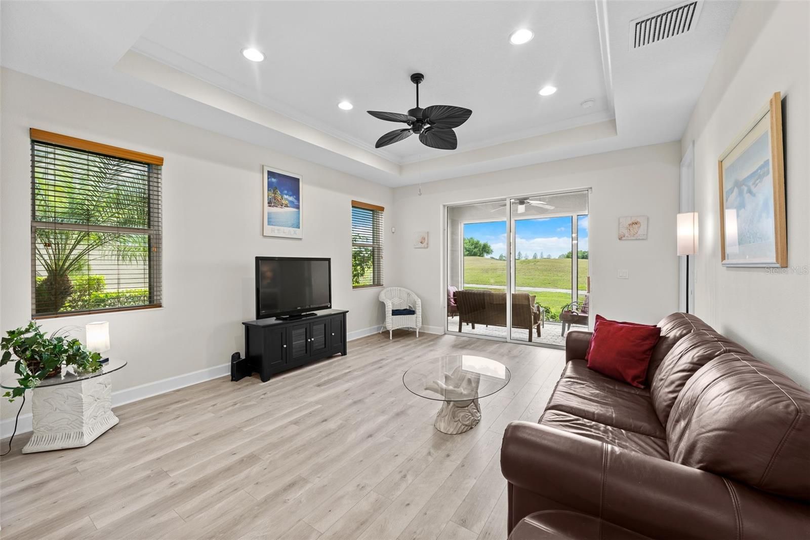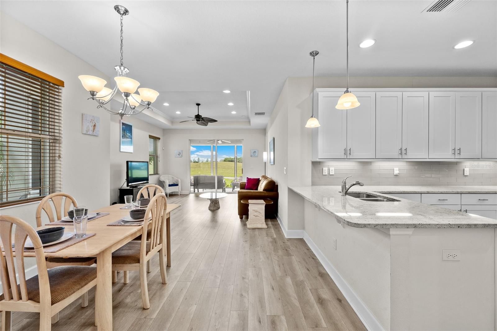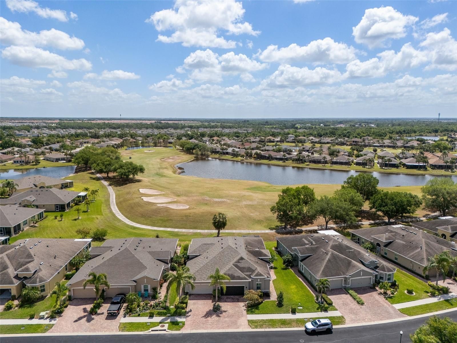 Discover unparalleled golf course living in this exquisite two-bedroom, two-bath home located within the exclusive, gated, 55+, maintenance-free community of Verona at Renaissance. Perfectly positioned on the third hole of the prestigious Club Renaissance Golf Course, this residence effortlessly blends luxury, everyday comfort and breathtaking golf course and pond views. Inside, find gorgeous luxury vinyl plank flooring sweeping throughout the main living spaces, beautifully complemented by an elegant tray ceiling finished with classic crown molding. The stunning designer kitchen boasts crisp white shaker-style cabinetry with undermounted lighting, beautiful stone countertops, a gleaming glass subway tile backsplash and a premium Samsung kitchen appliance package including a brand-new range, dishwasher and garbage disposal. Retreat to the spectacular primary suite, accessible through a grand eight-foot entry door. This private oasis continues the home's architectural elegance with its own tray ceiling and crown molding, as well as even more golf course views through the large window. The spa-inspired primary bath features stone counters, a spacious dual vanity and a sleek frameless glass walk-in shower. Outdoor living is a breeze on the covered lanai, which features charming brick flooring and views of the golf course and pond. For ultimate peace of mind, permanent hurricane screens have been installed on the lanai and all windows, which is an extensive upgrade. Engineered with wind resistance in mind, these screens provide top-tier security during storm season without compromising the home’s stylish aesthetic. Other updates include a new roof installed in December 2024, an innovative in-wall pest control system, pre-plumbing for a future whole-home water softener system and a handy utility sink located in the garage. Even your storage needs are elevated with reinforced attic floors above the garage, an upgraded pull-down ladder for easy access and added attic lighting. Residents of Verona enjoy the exclusivity of a private heated community pool, complemented by membership to the esteemed Club Renaissance. This magnificent 43,000-square-foot facility features a resort-style pool, a comprehensive fitness center with group classes and track, premium spa services and exceptional dining experiences. Furthermore, residents benefit from the extensive amenities of the Sun City Center main campus, which include indoor and outdoor pools, supplementary fitness facilities, a dog park, a library and courts for tennis, pickleball, softball, volleyball and lawn bowling, alongside more than 150 active social clubs. Thoughtfully designed for convenience, the entire community is golf-cart accessible, fostering a connected and vibrant lifestyle.