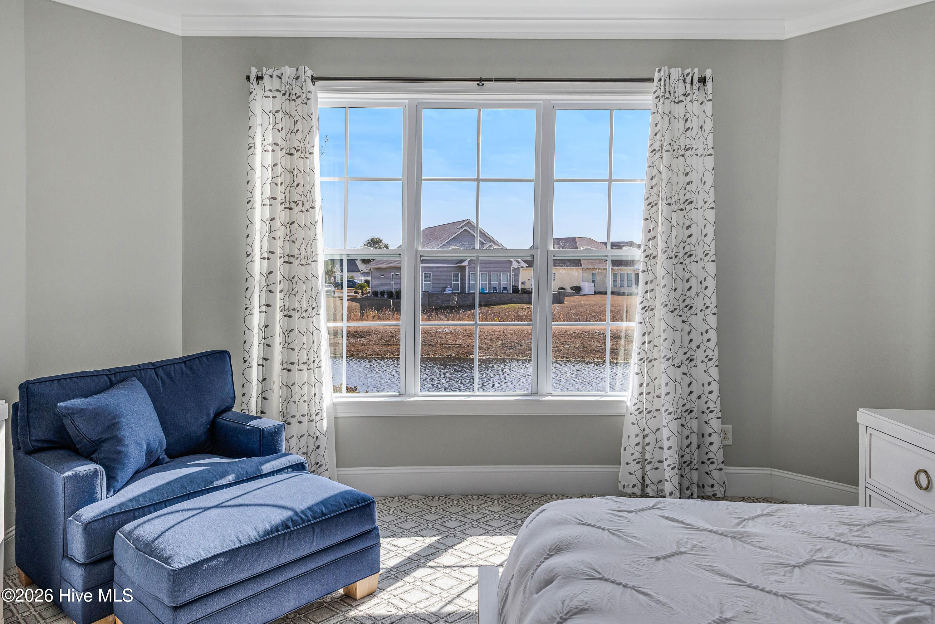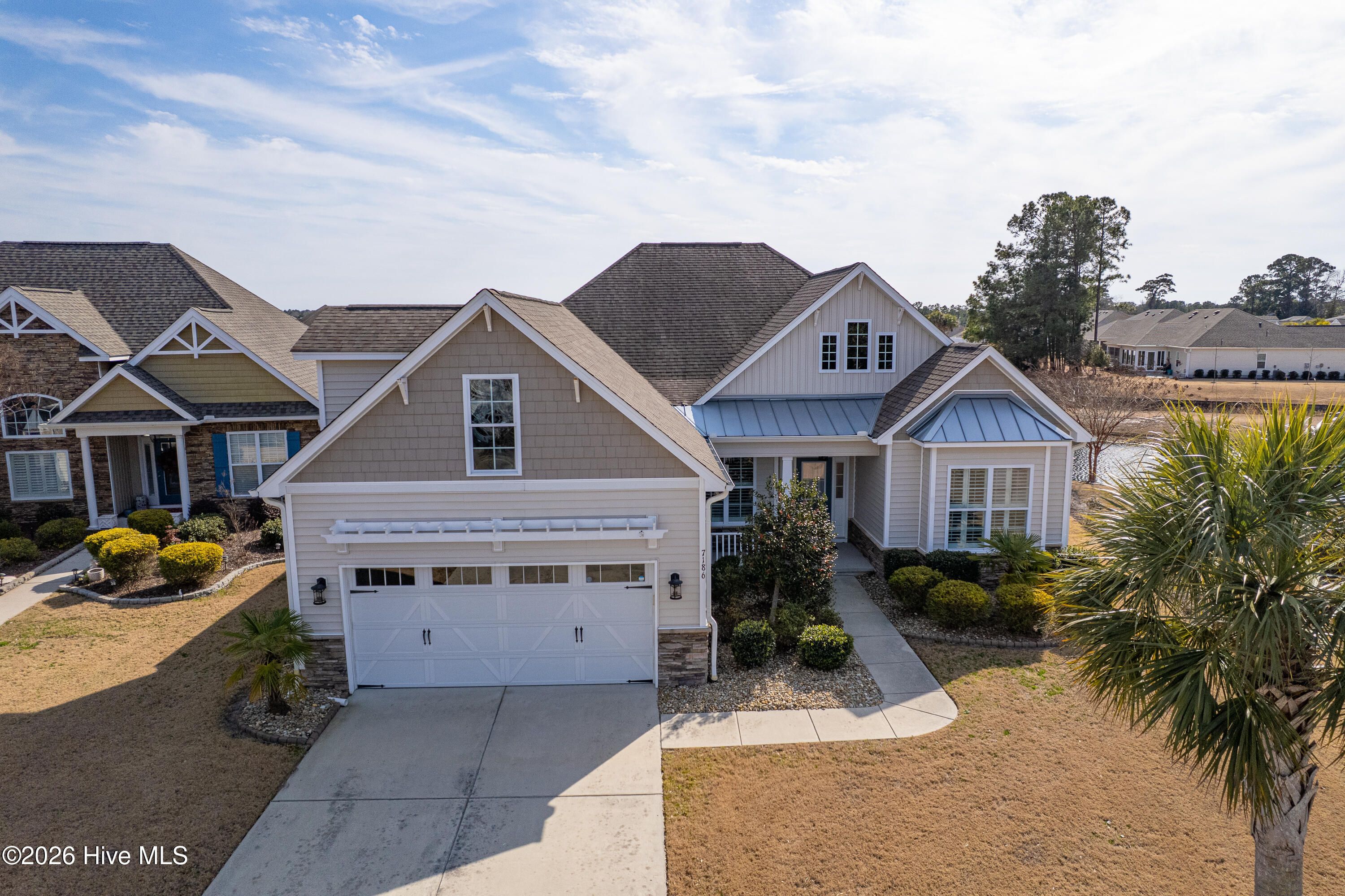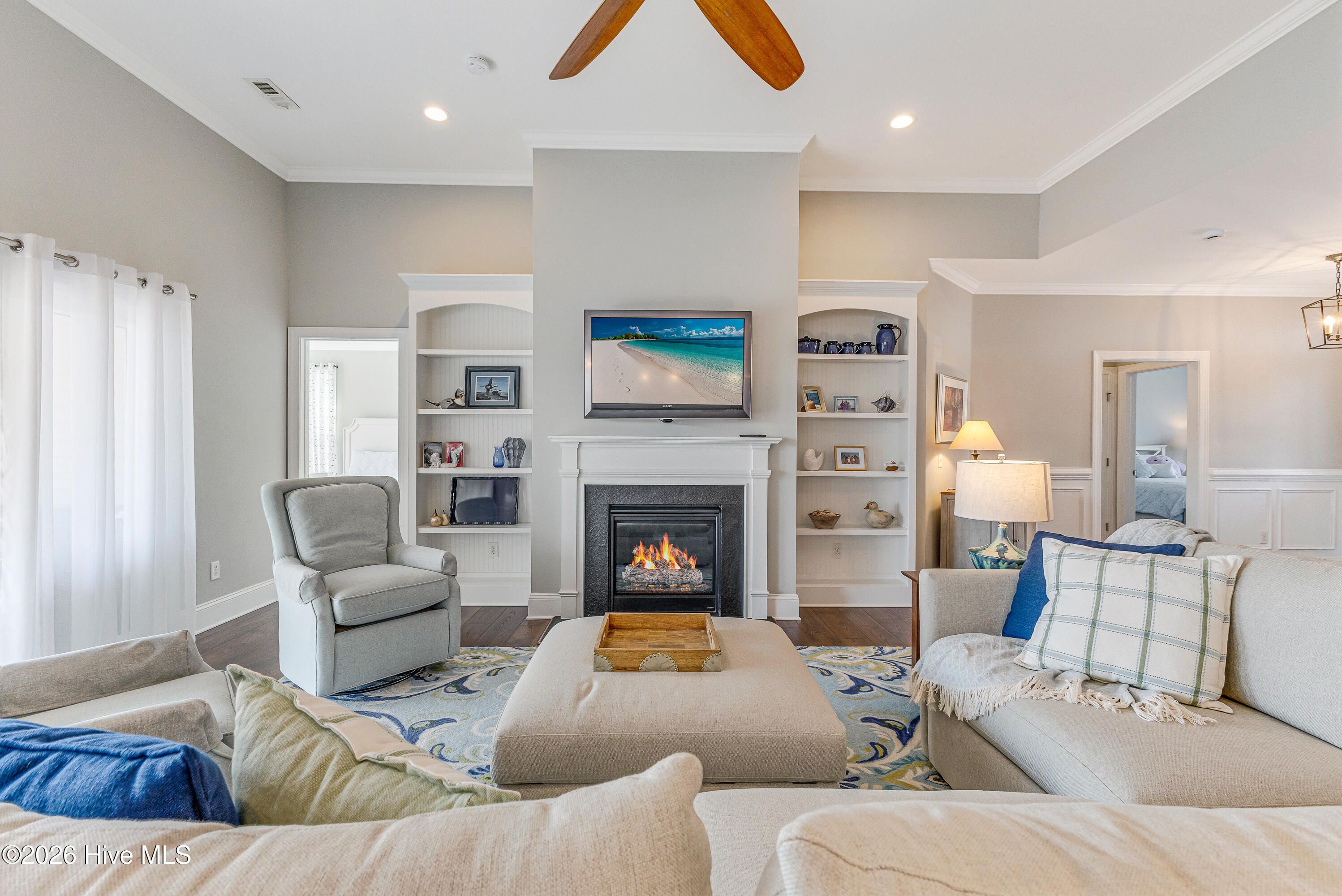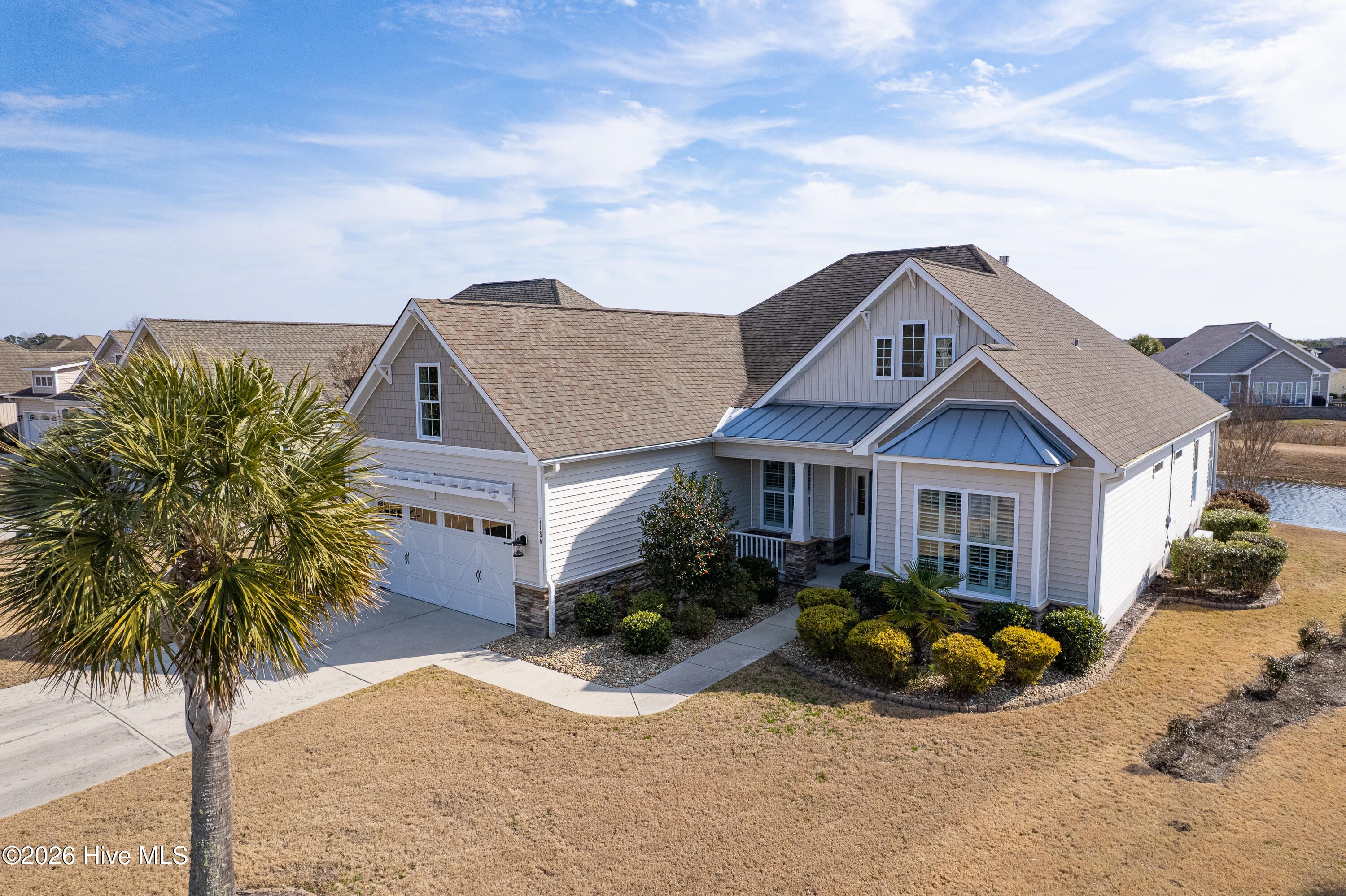 This stunning 3 bedroom, 3 bathroom home is move-in ready & filled with luxury features! Located in the Sunset Ridge community along the coast of NC this home was built in 2014 by Bill Clark. It previously served as the Bill Clark model home! The home offers an open floor plan with a finished room and full bathroom on the second floor above the garage. The home has fantastic curb appeal w/ professional landscaping, a 2-car garage, covered front porch & screened in back porch. You'll be welcomed into the home's inviting floor plan when walking through the front door. Your two guest bedrooms are in the front of the home, on either side of the foyer, with a shared guest bathroom. A gas log fireplace and mantle anchor the great room with custom built-in bookshelves on either side. The gourmet kitchen is equipped with stainless appliances, wooden cabinetry, granite countertops, tile backsplash, built-in microwave, oven, electric range, bar top counter and pendant lighting. Mohawk Rev wood select flooring is in the great room, kitchen, dining room & hallway along with crown moulding, baseboards & an 11' ceiling in the great room. The expansive primary suite has Mohawk carpet and a spacious walk -in closet with solid wood shelving. The primary bathroom is complimented with a soaking tub, walk-in tiled shower & vanity with two sinks. The home's screened in porch is directly off the great room, it features easy maintenance ceramic tile flooring, privacy shades and leads you out to a great sized backyard that overlooks the pond. A few additional bonus features of this pristine home include: 2024 HVAC system, two-zone heating & air with wireless Diakin thermostats, a wireless surround sound audio system w/ speakers in four rooms & the lot to the right of the home is owned by the HOA. HOA fees include landscape maintenance. Sunset Ridge has an exterior pool, clubhouse and fitness zone in the clubhouse. Schedule your showing today!