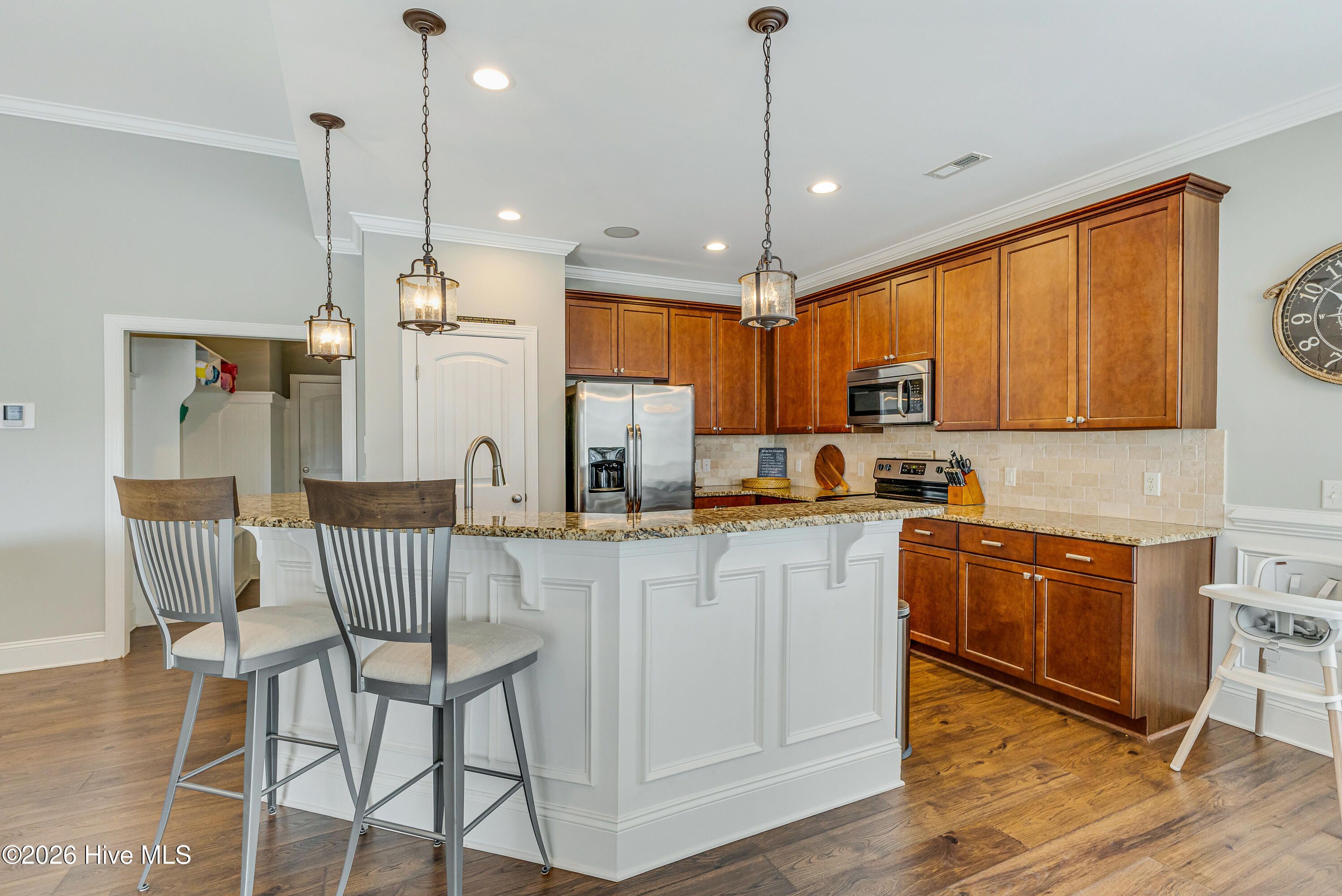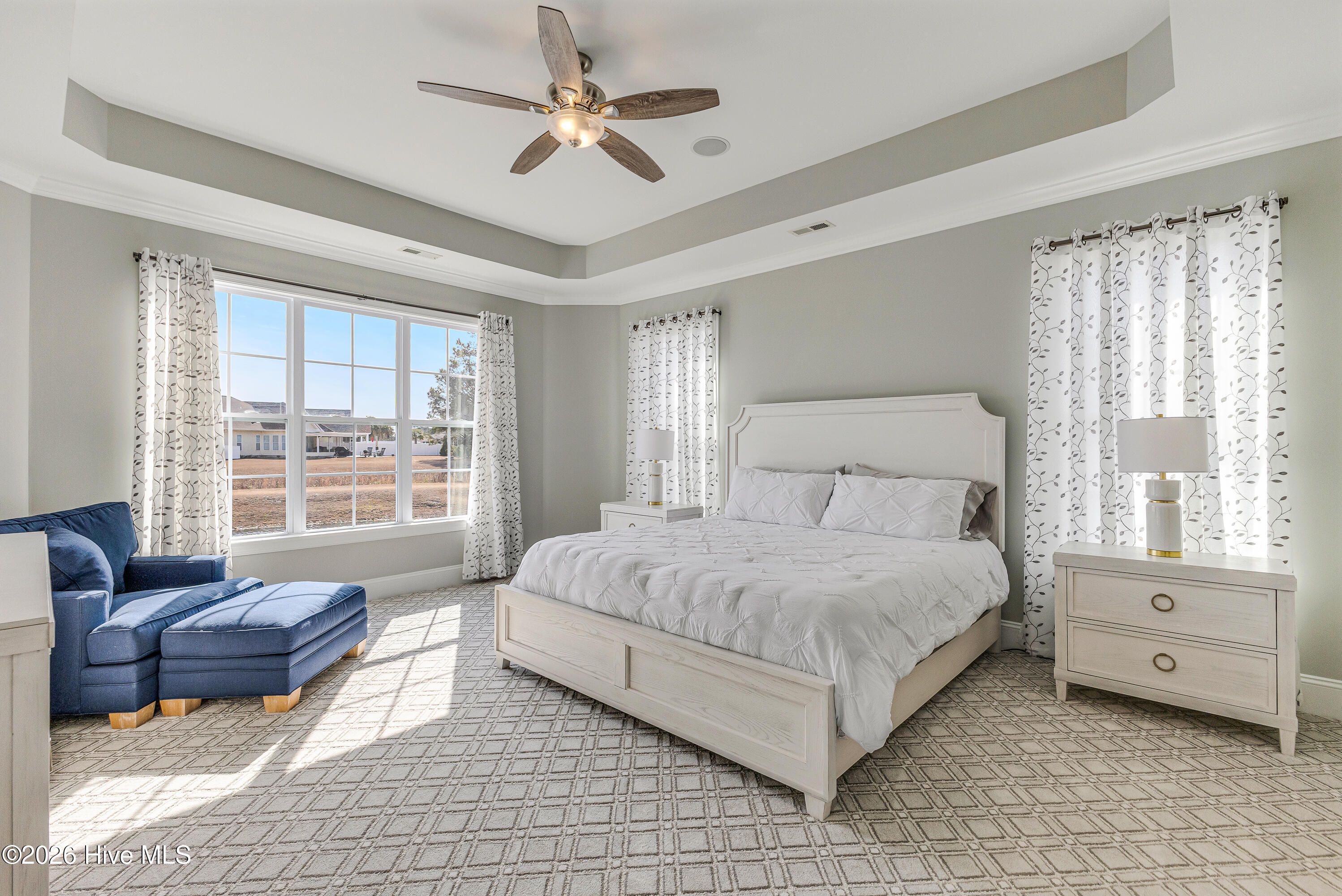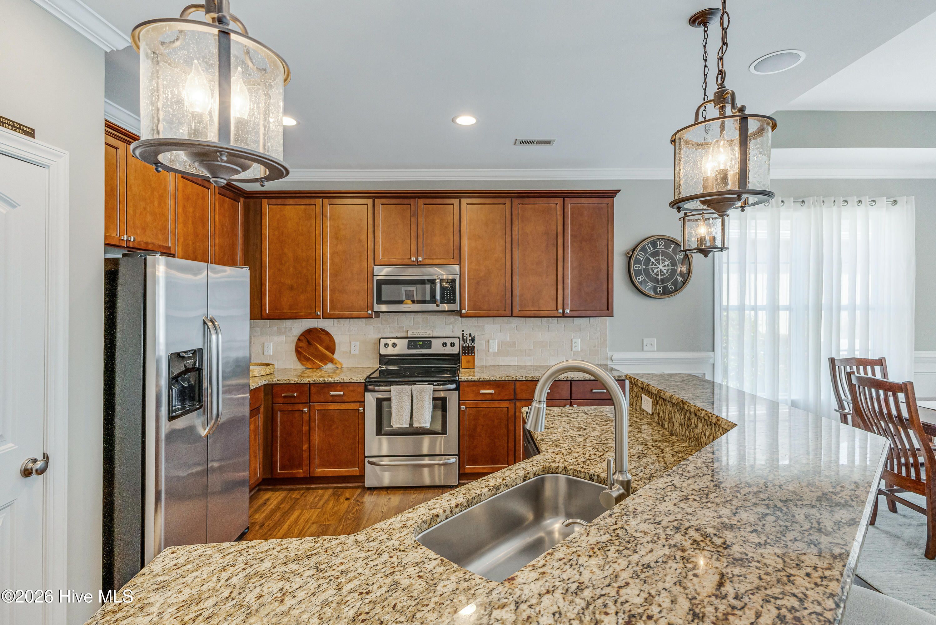 This stunning 3 bedroom, 3 bathroom home is move-in ready & filled with luxury features! Located in the Sunset Ridge community along the coast of NC this home was built in 2014 by Bill Clark. It previously served as the Bill Clark model home! The home offers an open floor plan with a finished room and full bathroom on the second floor above the garage. The home has fantastic curb appeal w/ professional landscaping, a 2-car garage, covered front porch & screened in back porch. You'll be welcomed into the home's inviting floor plan when walking through the front door. Your two guest bedrooms are in the front of the home, on either side of the foyer, with a shared guest bathroom. A gas log fireplace and mantle anchor the great room with custom built-in bookshelves on either side. The gourmet kitchen is equipped with stainless appliances, wooden cabinetry, granite countertops, tile backsplash, built-in microwave, oven, electric range, bar top counter and pendant lighting. Mohawk Rev wood select flooring is in the great room, kitchen, dining room & hallway along with crown moulding, baseboards & an 11' ceiling in the great room. The expansive primary suite has Mohawk carpet and a spacious walk -in closet with solid wood shelving. The primary bathroom is complimented with a soaking tub, walk-in tiled shower & vanity with two sinks. The home's screened in porch is directly off the great room, it features easy maintenance ceramic tile flooring, privacy shades and leads you out to a great sized backyard that overlooks the pond. A few additional bonus features of this pristine home include: 2024 HVAC system, two-zone heating & air with wireless Diakin thermostats, a wireless surround sound audio system w/ speakers in four rooms & the lot to the right of the home is owned by the HOA. HOA fees include landscape maintenance. Sunset Ridge has an exterior pool, clubhouse and fitness zone in the clubhouse. Schedule your showing today!