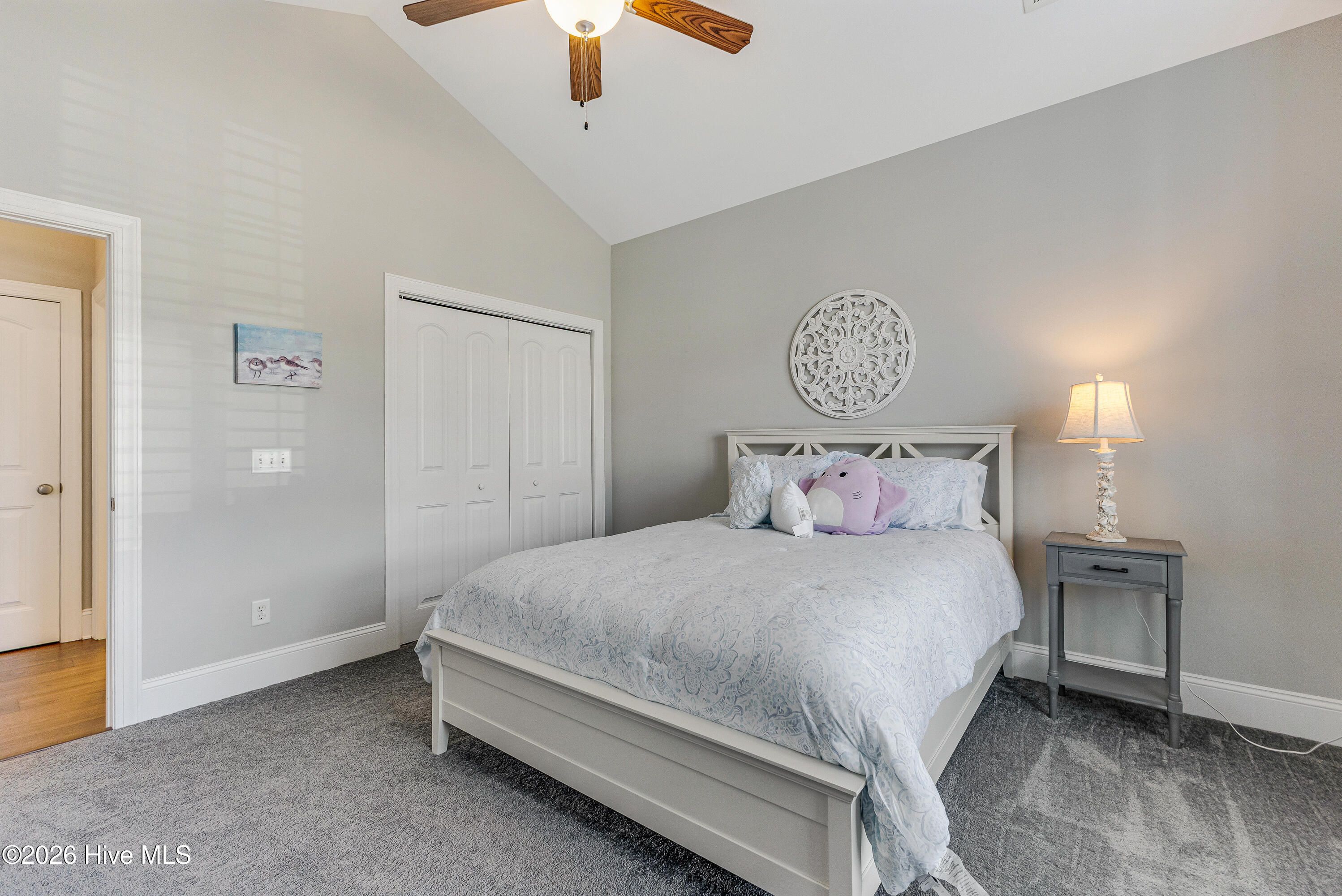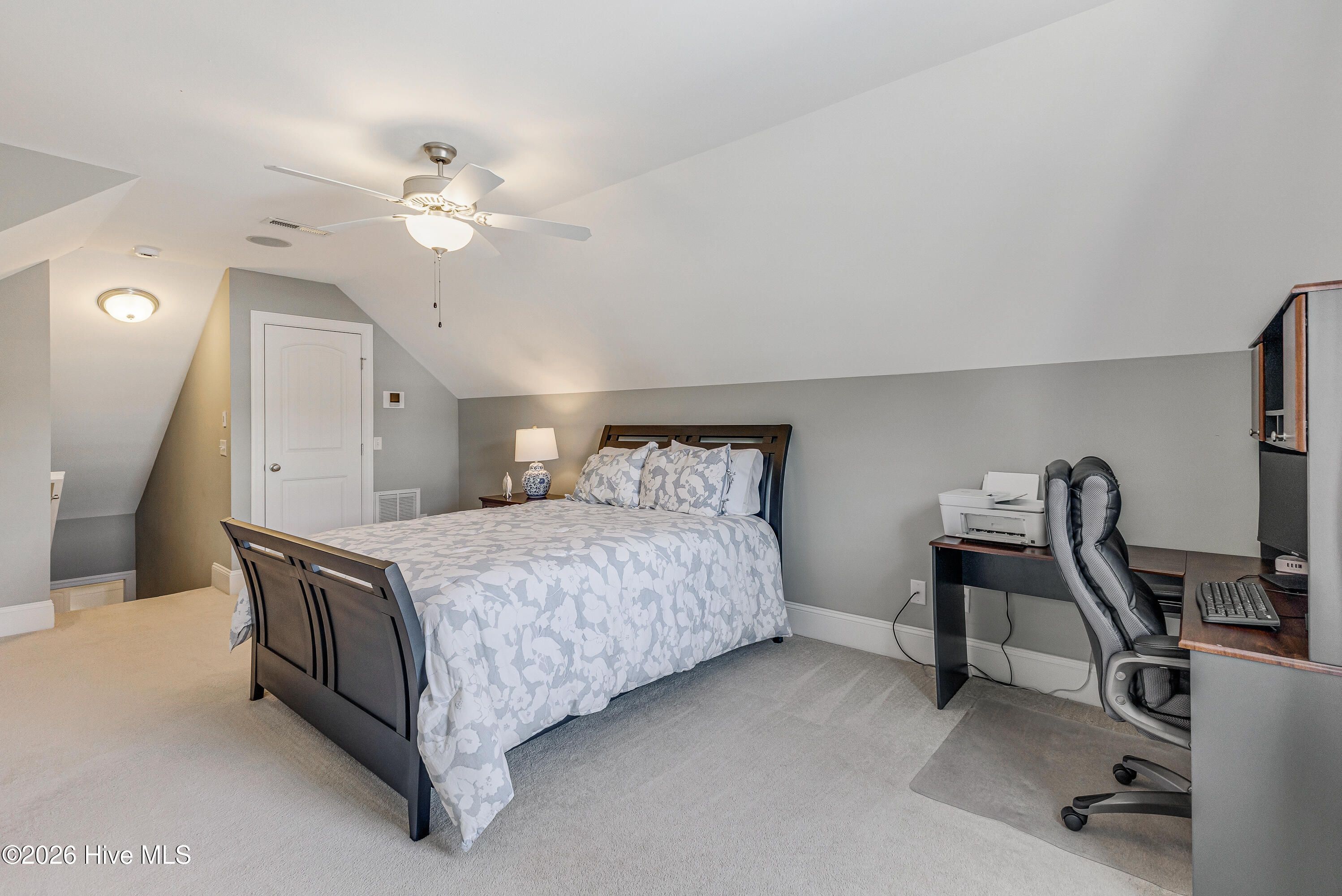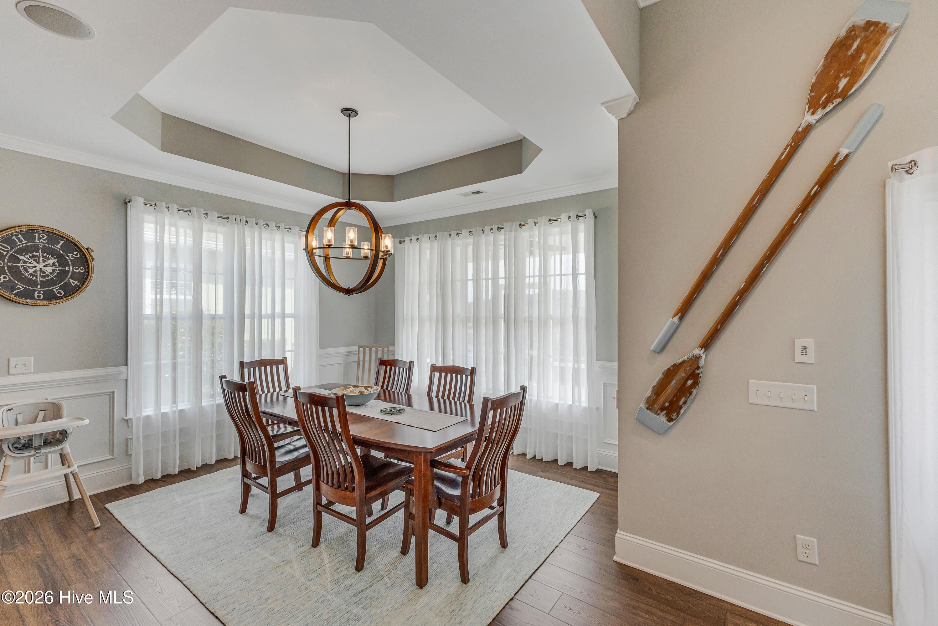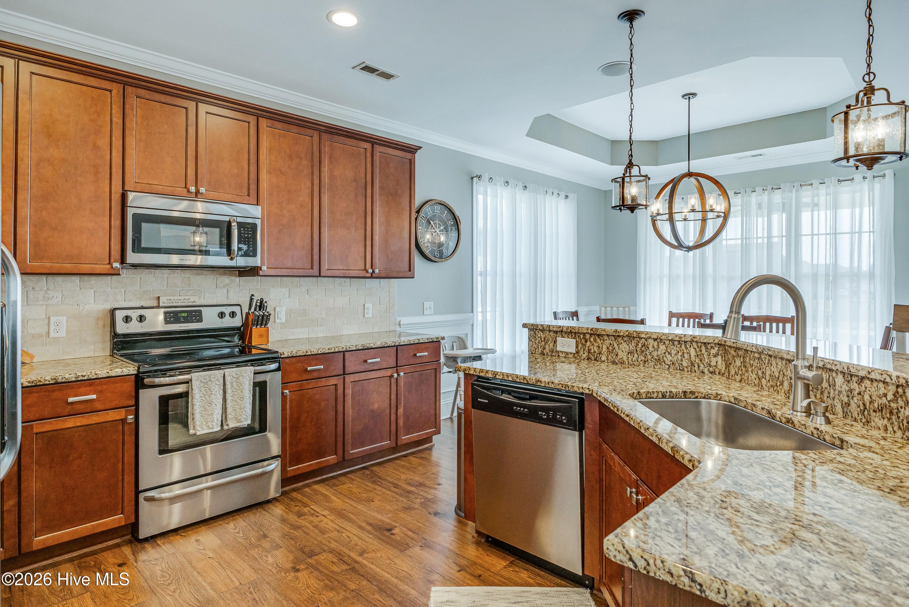 This stunning 3 bedroom, 3 bathroom home is move-in ready & filled with luxury features! Located in the Sunset Ridge community along the coast of NC this home was built in 2014 by Bill Clark. It previously served as the Bill Clark model home! The home offers an open floor plan with a finished room and full bathroom on the second floor above the garage. The home has fantastic curb appeal w/ professional landscaping, a 2-car garage, covered front porch & screened in back porch. You'll be welcomed into the home's inviting floor plan when walking through the front door. Your two guest bedrooms are in the front of the home, on either side of the foyer, with a shared guest bathroom. A gas log fireplace and mantle anchor the great room with custom built-in bookshelves on either side. The gourmet kitchen is equipped with stainless appliances, wooden cabinetry, granite countertops, tile backsplash, built-in microwave, oven, electric range, bar top counter and pendant lighting. Mohawk Rev wood select flooring is in the great room, kitchen, dining room & hallway along with crown moulding, baseboards & an 11' ceiling in the great room. The expansive primary suite has Mohawk carpet and a spacious walk -in closet with solid wood shelving. The primary bathroom is complimented with a soaking tub, walk-in tiled shower & vanity with two sinks. The home's screened in porch is directly off the great room, it features easy maintenance ceramic tile flooring, privacy shades and leads you out to a great sized backyard that overlooks the pond. A few additional bonus features of this pristine home include: 2024 HVAC system, two-zone heating & air with wireless Diakin thermostats, a wireless surround sound audio system w/ speakers in four rooms & the lot to the right of the home is owned by the HOA. HOA fees include landscape maintenance. Sunset Ridge has an exterior pool, clubhouse and fitness zone in the clubhouse. Schedule your showing today!