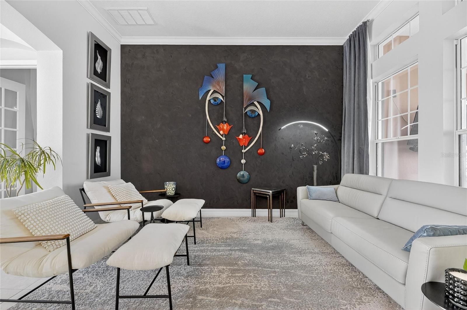 - Ceiling Fan(s), Crown Molding, High Ceilings, Kitchen/Family Room Combo, Living/Dining Room, Open Floorplan, Main Level Primary, Solid Surface Counters, Split Bedrooms, Stone Counters, Walk-In Closet(s), Window Treatments