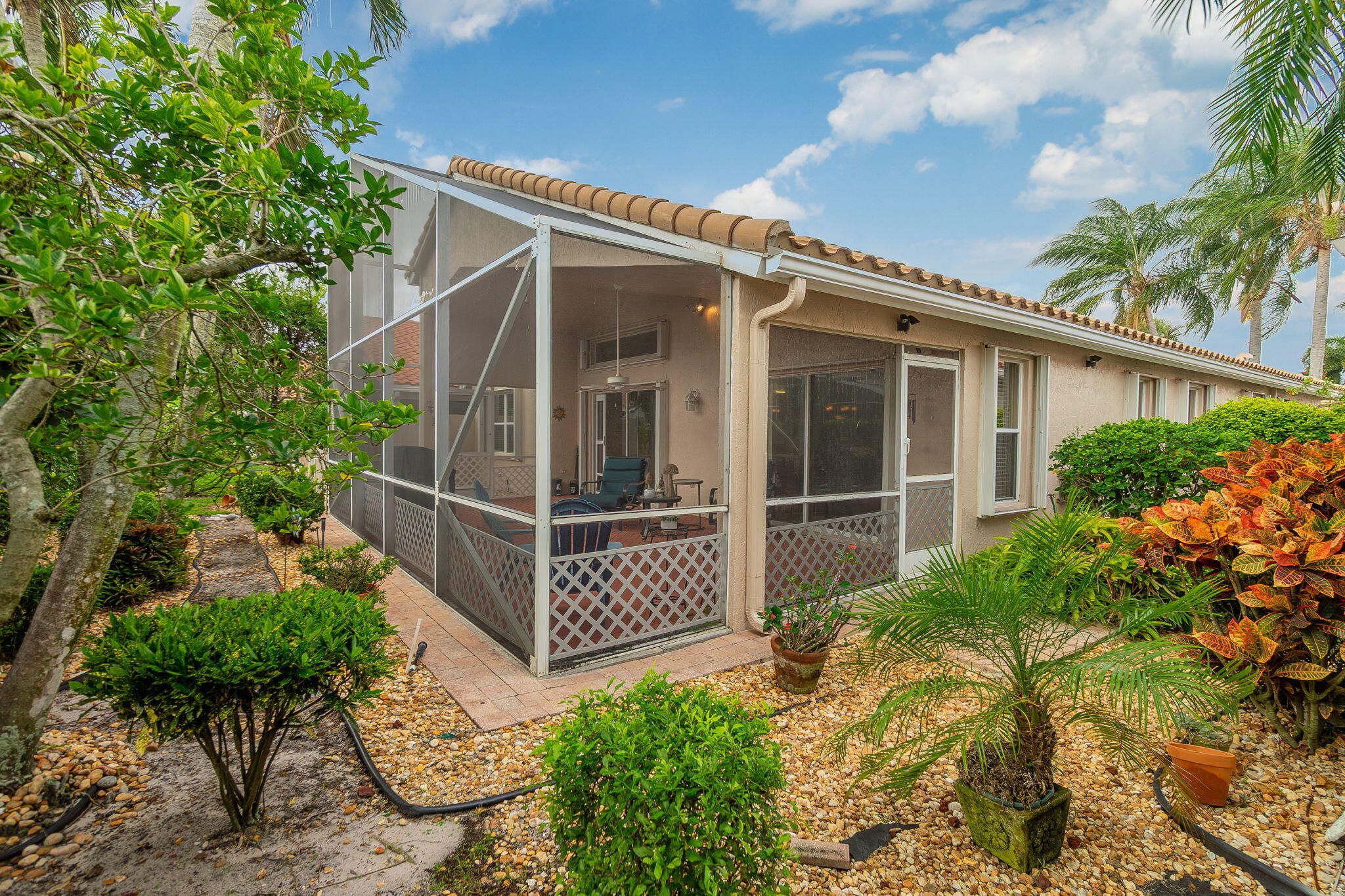 Welcome to this immaculate, move-in ready home in the prestigious Cascades community. Features include a beautiful etched-glass entry door, dining room with custom wall mirror, and an eat-in kitchen with updated cabinetry, stainless steel appliances, breakfast bar, and pantry. The living room offers vaulted ceilings and two sliding doors leading to a large paver patio with full screened enclosure. Interior highlights include ceramic tile floors, 2 bedrooms, 2 baths with a stunning owner's suite en-suite, den/office, walk in closets, large laundry room with W/D hookups, and 2-car garage. Professionally landscaped and meticulously maintained. Enjoy resort-style amenities including clubhouse, pool, billiards, café/restaurant, and more. Experience the best of South Florida living!