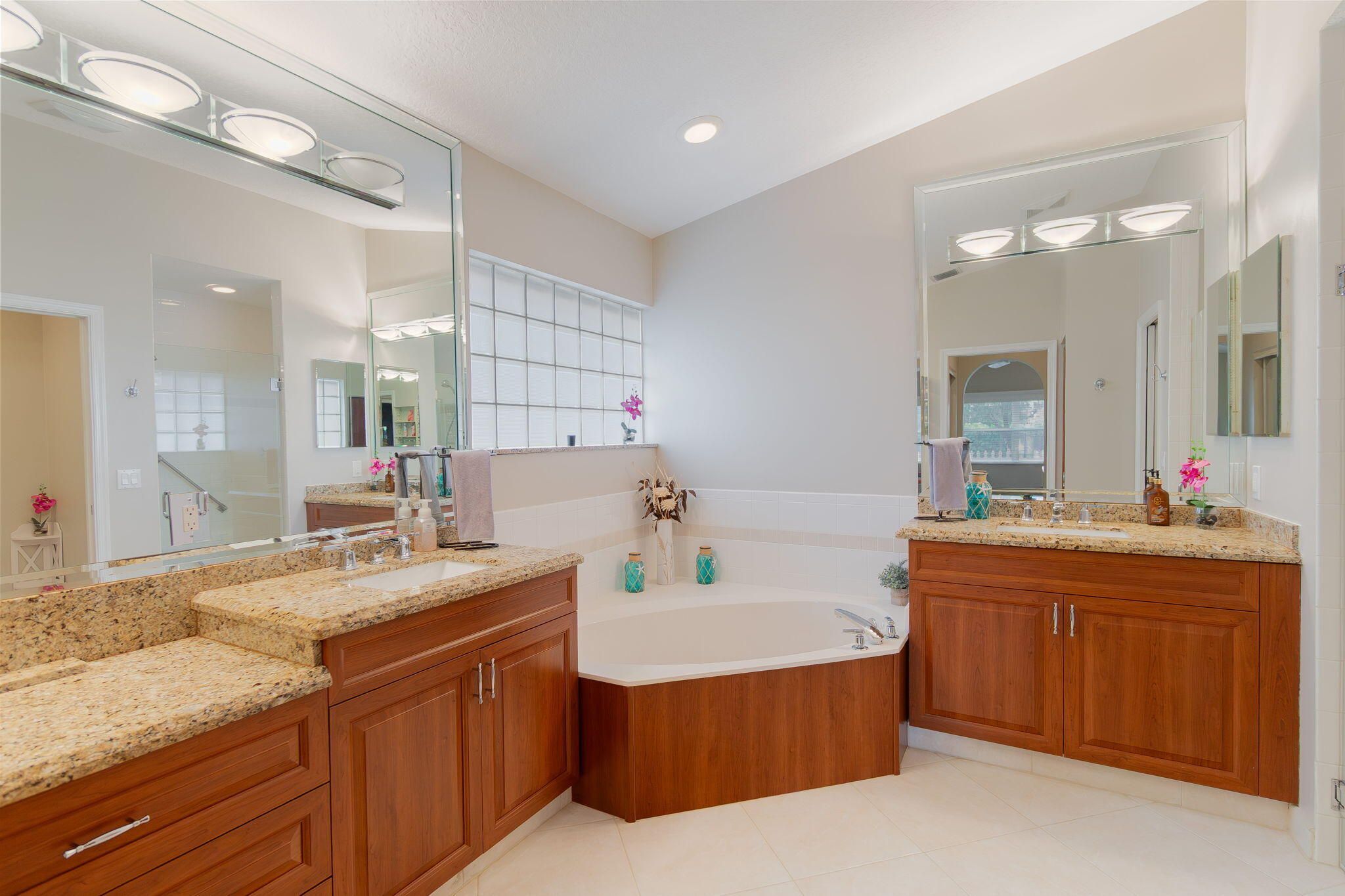- Cathedral Ceiling(s), Entrance Foyer, Pantry, Vaulted Ceiling(s), Walk-In Closet(s), Split Bedrooms, Custom Mirrors, Garden Tub/Roman Tub, Impact Glass, Eat-in Kitchen, Separate/Formal Dining Room, Snack Bar, Dual Sinks, Main Level Primary, Separate Shower, Soaking Tub