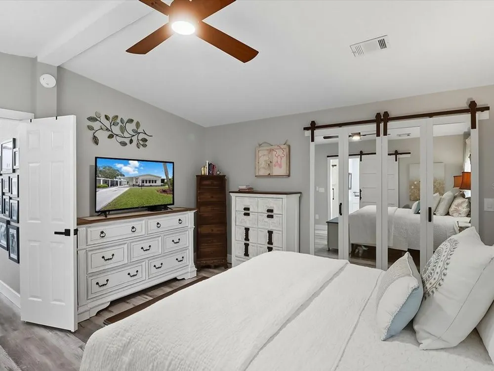 - Cathedral Ceiling(s), Ceiling Fan(s), Eat-in Kitchen, High Ceilings, Kitchen/Family Room Combo, L-Shaped Dining Room, Open Floorplan, Main Level Primary, Solid Surface Counters, Solid-Wood Cabinets, Stone Counters, Thermostat, Vaulted Ceiling(s), Walk-In Closet(s), Window Treatments