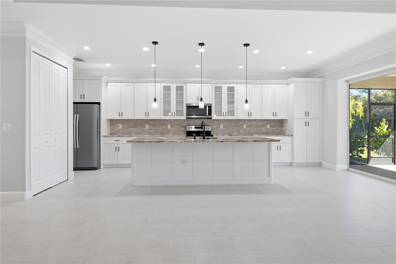 Under Construction. MOVE IN READY! 3 bedroom, 2 bath new construction home located in the 55+ community of Park Forest. Step through the double doors into an inviting foyer that leads you to this open concept home. High 9 foot ceilings create a light and bright living space. The kitchen features shaker sytle cabinets, granite counter tops with a stunning backsplash. Laundry room is off the kitchen with lots a storage. The living area is highlighted by a coffer ceiling, crown molding, and large pocket sliding doors leading to the lanai. The primary bedroom also has sliding doors to the lanai. The primary bathroom boast all wood cabinets, granite counter tops, and a large walk in shower with a glass enclosure. The front door, garage door and windows are impact glass. This home is located close to beaches, shopping, golfing and the Sarasota County sports park. The community includes a club house, pool and tennis/pickleball courts that have newly updated and NO CDD's. Taxes and assoctiation fees have been estimated.