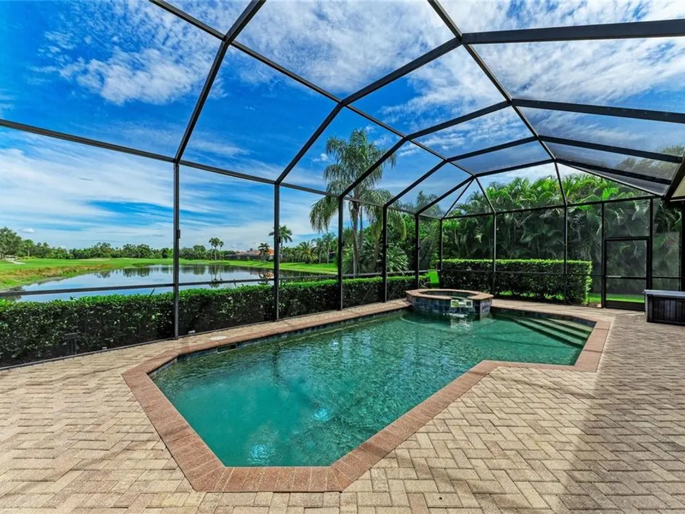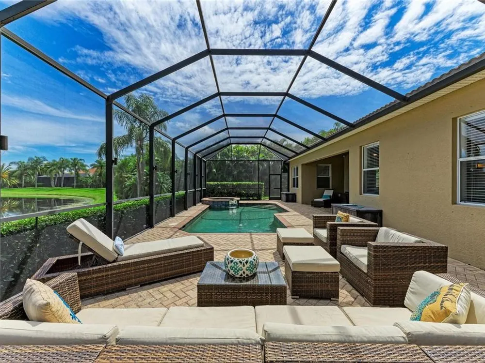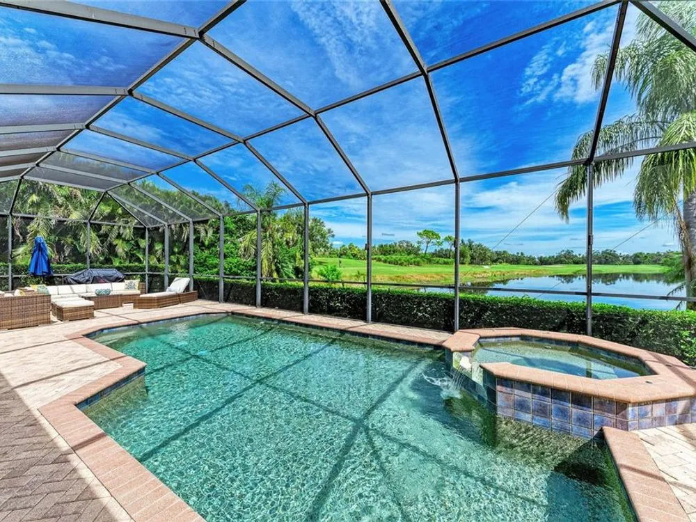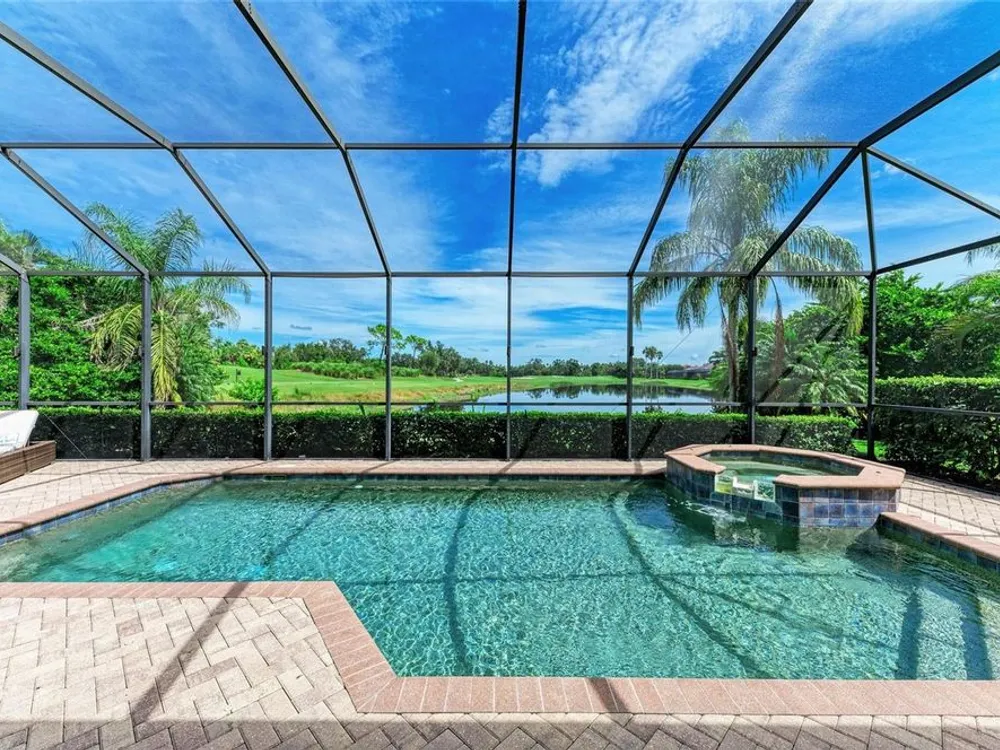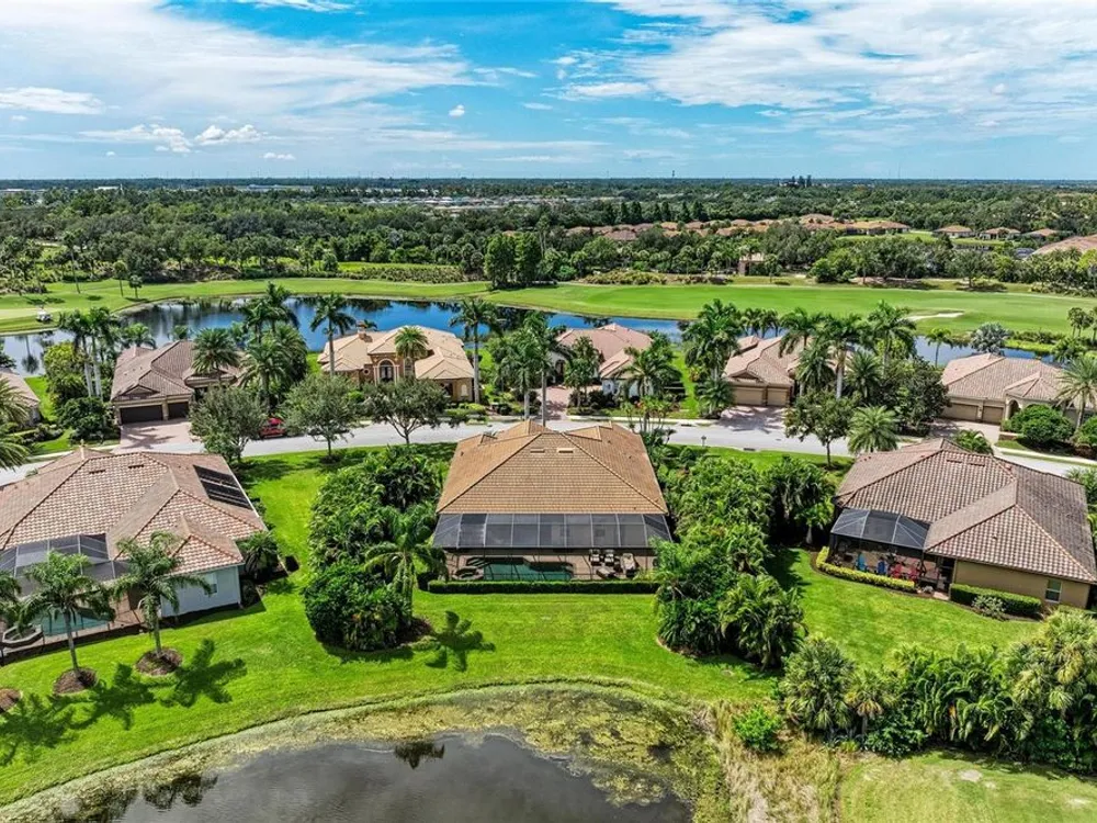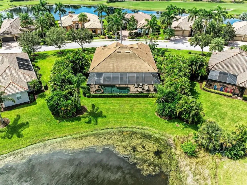 Searching for your forever home or the perfect winter retreat? Look no further than this STUNNING GOLF DEEDED ESTATE PROPERTY in the sought-after, gated resort community of River Strand Golf & Country Club. Located on one of the LARGEST LOTS in River Strand, this beautifully appointed home offers over 2,900 square feet of thoughtfully designed living space. With 4 bedrooms, 3 bathrooms, and a dedicated office/den, there’s room for everyone — whether you're hosting guests or enjoying peaceful privacy. Upon entry, you’re welcomed by a formal dining area and a versatile sitting or game room — perfect for entertaining or relaxing. THE OPEN CONCEPT MAIN LIVING AREA features a spacious family room and a bright, eat-in kitchen, highlighted by an aquarium window and sliding glass doors that seamlessly blend indoor and outdoor living. Step outside to your personal paradise — a large covered lanai, HEATED POOL AND SPA and expansive patio area ideal for entertaining or simply soaking in the sun. The PANORAMIC GOLF AND WATER VIEWS are truly unmatched, offering tee-to-green vistas of the first hole of the Tributary Course, along with added privacy on both sides. With a 3 car garage you will also have plenty of room for vehicles, a golf cart and toys too. This home has recently been painted both inside and out and is offered FURNISHED and move-in ready. River Strand Golf & Country Club is renowned for its 27 holes of pristine golf, but the lifestyle here goes far beyond the fairways. The community’s clubhouse is currently undergoing an exciting renovation, enhancing the restaurant, grille room, pool, spa, and tiki bar — promising an even better resort-style experience. In addition to the main clubhouse, residents enjoy access to six satellite pools, two fitness centers, tennis and pickleball courts, and a second resort-style pool at the community center. Whether you're into sports, fitness, or just relaxing under the Florida sun, there’s something here for everyone. The vibrant social calendar is packed year-round, featuring events like live music, holiday celebrations, Trivia Nights, Name That Tune competitions, and fun poolside parties — creating countless opportunities to connect with neighbors and friends. Ideally situated just minutes from I-75, River Strand offers effortless access to Sarasota, Tampa, and St. Petersburg, making commuting and day trips a breeze. You're also close to The Market Place, home to Costco, the new Target, and an expanding selection of shopping and dining options. And when it’s time to unwind, the renowned beaches of Florida’s Gulf Coast are just a short drive away! So what are you waiting for? Come tour this incredible home and experience River Strand at it's best — you might never want to leave!