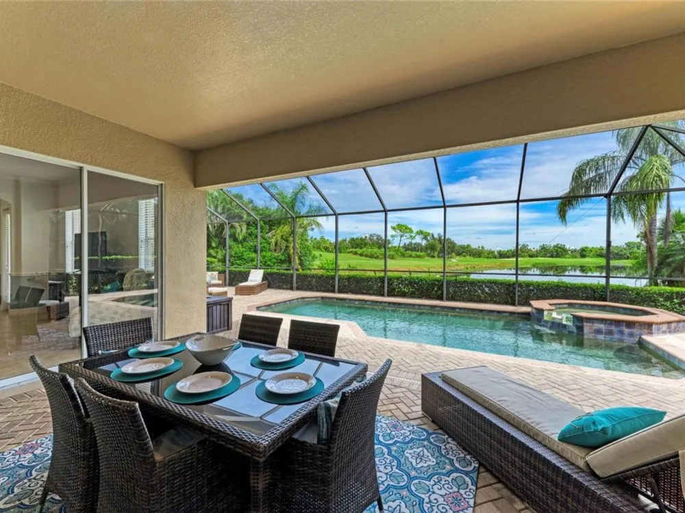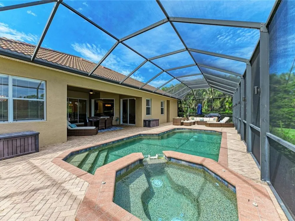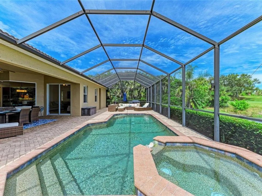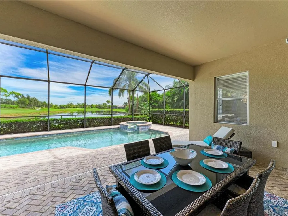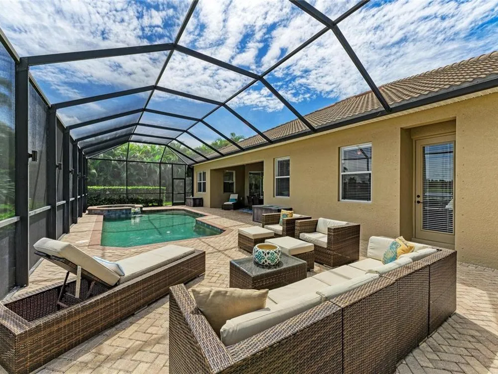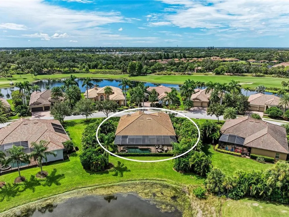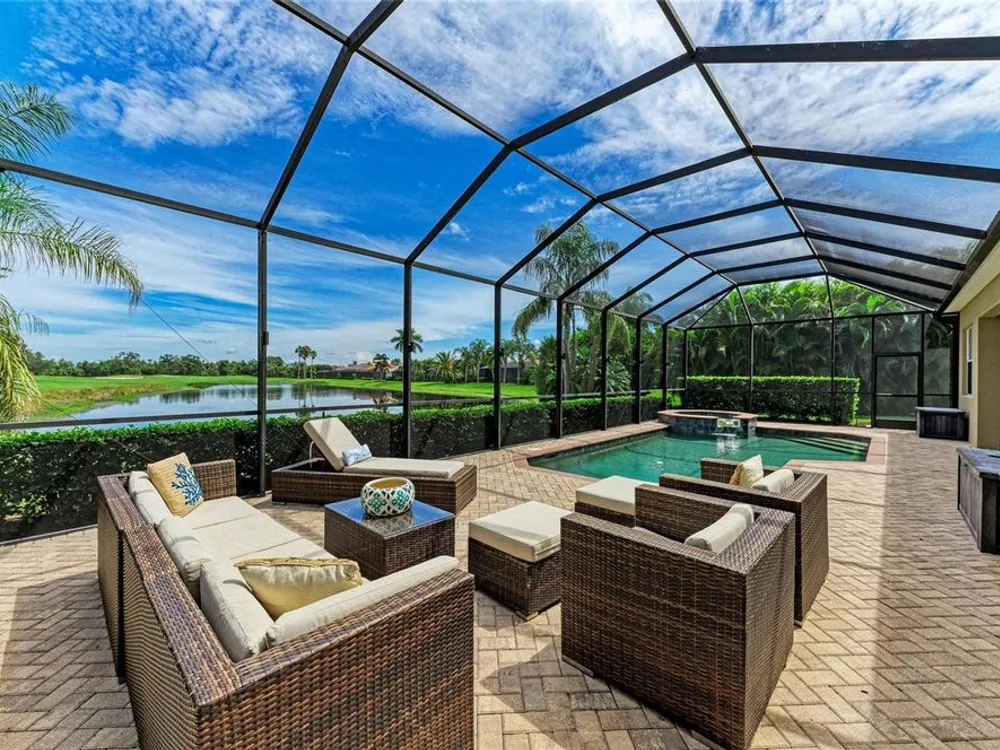 Searching for your forever home or the perfect winter retreat? Look no further than this STUNNING GOLF DEEDED ESTATE PROPERTY in the sought-after, gated resort community of River Strand Golf & Country Club. Located on one of the LARGEST LOTS in River Strand, this beautifully appointed home offers over 2,900 square feet of thoughtfully designed living space. With 4 bedrooms, 3 bathrooms, and a dedicated office/den, there’s room for everyone — whether you're hosting guests or enjoying peaceful privacy. Upon entry, you’re welcomed by a formal dining area and a versatile sitting or game room — perfect for entertaining or relaxing. THE OPEN CONCEPT MAIN LIVING AREA features a spacious family room and a bright, eat-in kitchen, highlighted by an aquarium window and sliding glass doors that seamlessly blend indoor and outdoor living. Step outside to your personal paradise — a large covered lanai, HEATED POOL AND SPA and expansive patio area ideal for entertaining or simply soaking in the sun. The PANORAMIC GOLF AND WATER VIEWS are truly unmatched, offering tee-to-green vistas of the first hole of the Tributary Course, along with added privacy on both sides. With a 3 car garage you will also have plenty of room for vehicles, a golf cart and toys too. This home has recently been painted both inside and out and is offered FURNISHED and move-in ready. River Strand Golf & Country Club is renowned for its 27 holes of pristine golf, but the lifestyle here goes far beyond the fairways. The community’s clubhouse is currently undergoing an exciting renovation, enhancing the restaurant, grille room, pool, spa, and tiki bar — promising an even better resort-style experience. In addition to the main clubhouse, residents enjoy access to six satellite pools, two fitness centers, tennis and pickleball courts, and a second resort-style pool at the community center. Whether you're into sports, fitness, or just relaxing under the Florida sun, there’s something here for everyone. The vibrant social calendar is packed year-round, featuring events like live music, holiday celebrations, Trivia Nights, Name That Tune competitions, and fun poolside parties — creating countless opportunities to connect with neighbors and friends. Ideally situated just minutes from I-75, River Strand offers effortless access to Sarasota, Tampa, and St. Petersburg, making commuting and day trips a breeze. You're also close to The Market Place, home to Costco, the new Target, and an expanding selection of shopping and dining options. And when it’s time to unwind, the renowned beaches of Florida’s Gulf Coast are just a short drive away! So what are you waiting for? Come tour this incredible home and experience River Strand at it's best — you might never want to leave!