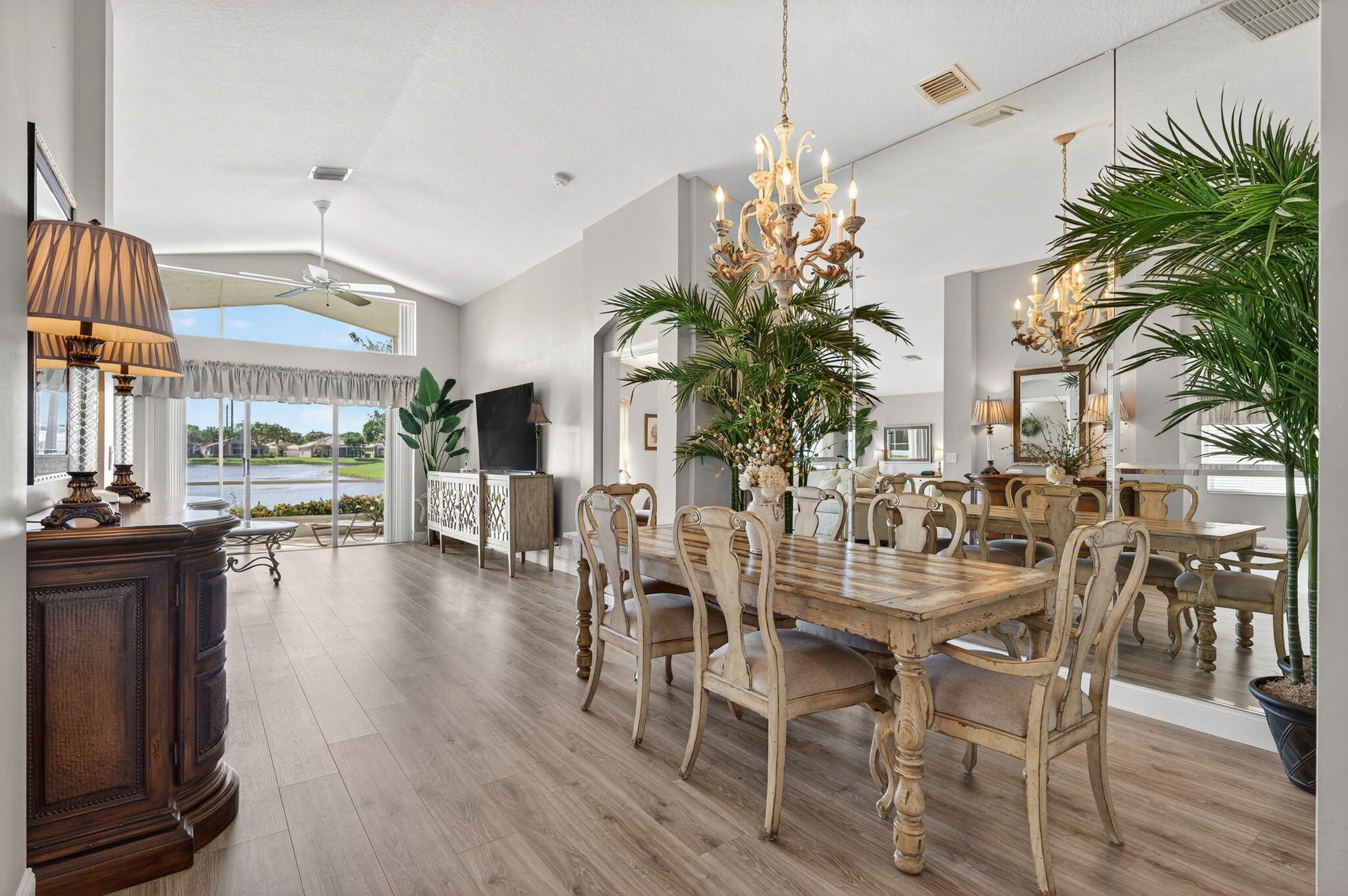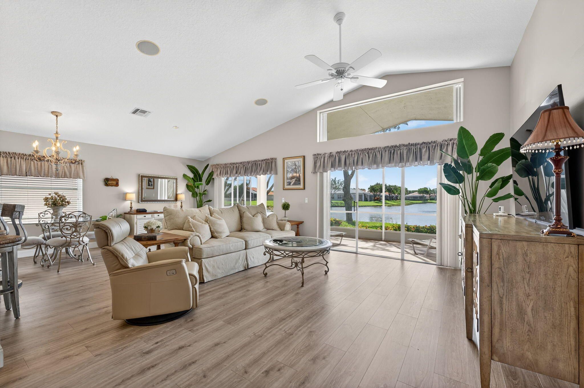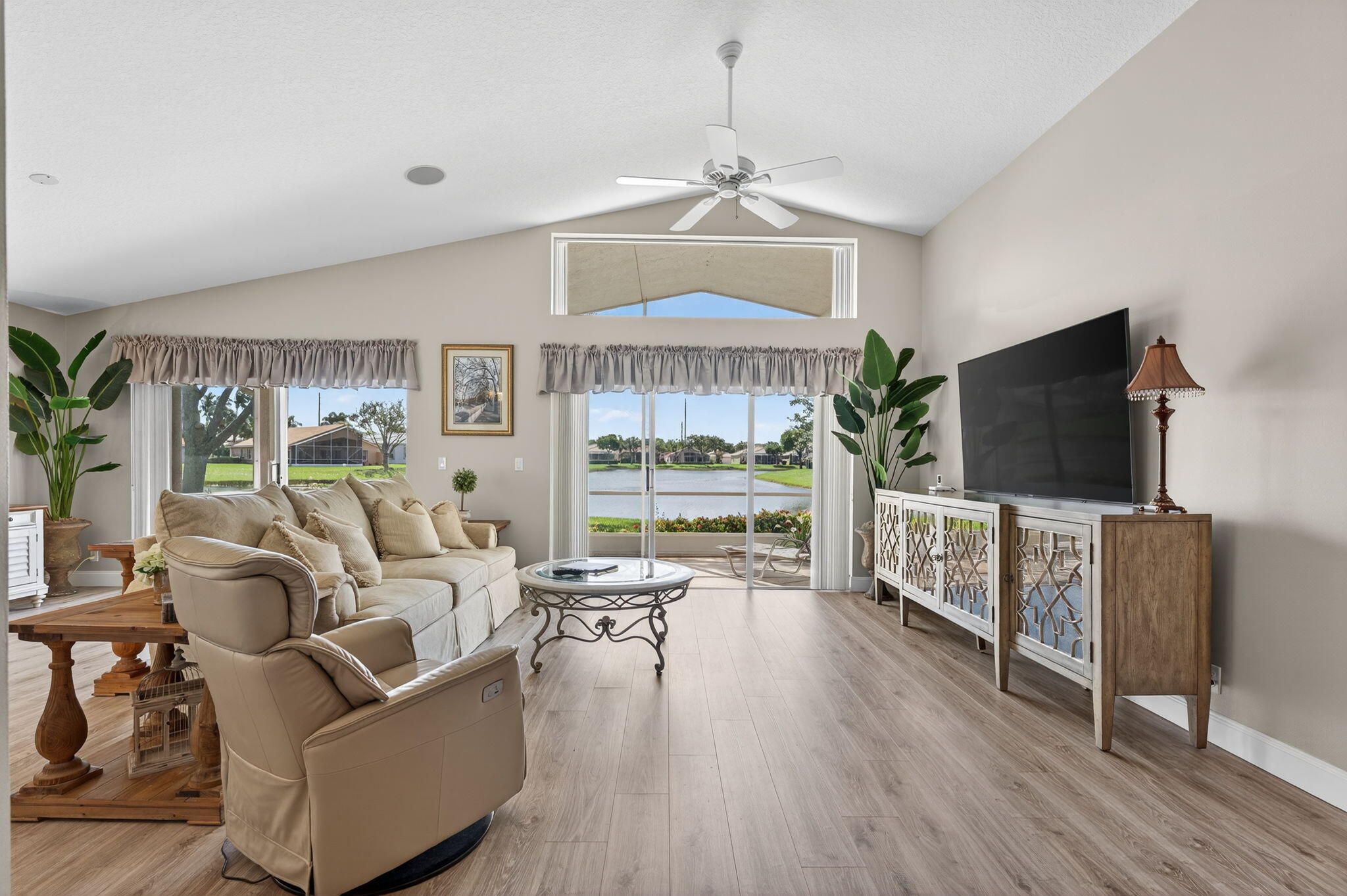 WATCH THE VIDEO attached, to get a sense of how special this home is. VERY ACTIVE community most look for. IMMACULATE, beautifully maintained LONG Lake Este model. An open-concept great room floor plan has a true third bedroom. Move-in ready and furnishings are negotiable. Full hurricane-accordion shutters, and no carpet. Fresh exterior paint for the home is scheduled and will be a warm neutral color. LONG Lake views from the open kitchen, great room or in primary suite. Gorgeous! The screened-in patio offers ample space for entertaining and highlights the bright Southern exposure with stunning water views as well as sunsets. A split-bedroom layout with 2 full baths. Luxury vinyl wood like floors throughout. Pre-inspected in perfect condition. The transom windows bring in all the light! The primary suite has long lake views, Custom fitted large walk-in closet, framed mirrors, Soaking tub, Glass-enclosed shower and Dual sinks. Additional Home Features: Roof and home inspection confirms great condition. Community Amenities Include: designer renovated clubhouse, Resort-style pool & spa, State-of-the-art fitness center, Three regulation Tennis courts & six dedicated pickleball courts (expanded!), Two Bocce ball, billiards, card rooms, arts & crafts, Library, game room, and entertainment theater for top-tier shows, Professionally designed Putting green & driving range, No upcoming assessments for new sports complex additions, HOA allows 2 pets (max 35 lbs each) Monthly HOA: $623 | Capital Contribution: $3,738 |Internet, landscaping and security included. Application Fee: $300 No leasing permitted during the first 2 years of ownership Prime Location: Conveniently located near top shopping and dining destinations, including the new WHOLE FOODS. Easy access via Jog Road, or Hagan Ranch Road and just North of Boynton Beach Blvd. Ponte Vecchio is A Highly Sought-After 55+ Active Community of 647 homes, in Boynton Beach!