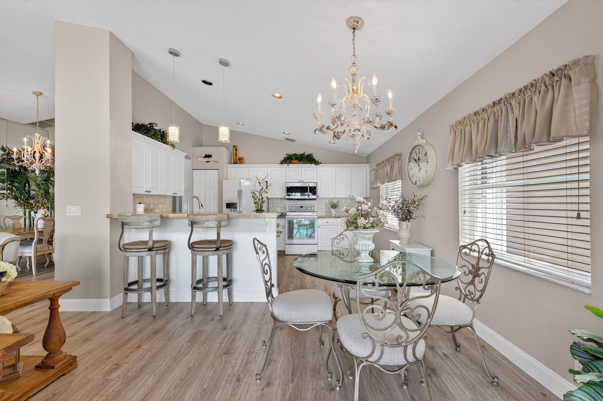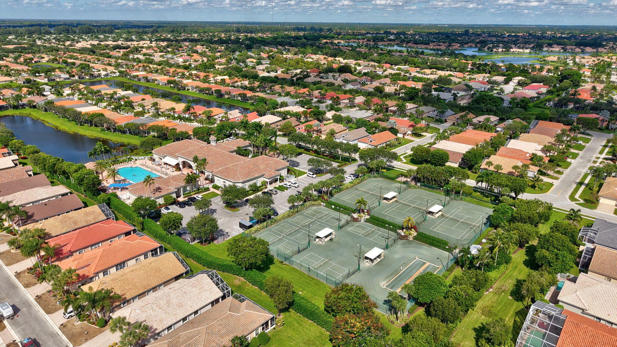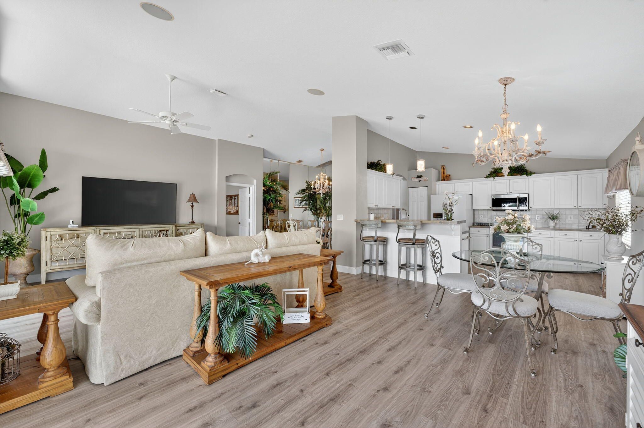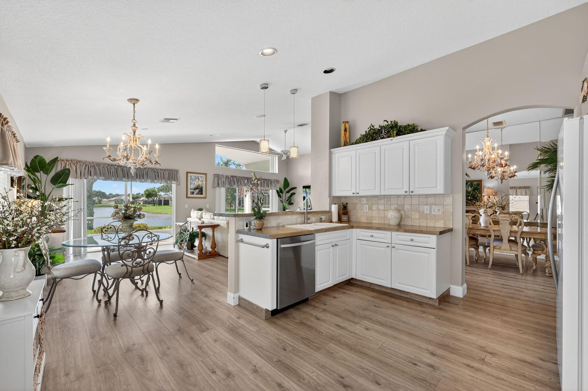 WATCH THE VIDEO attached, to get a sense of how special this home is. VERY ACTIVE community most look for. IMMACULATE, beautifully maintained LONG Lake Este model. An open-concept great room floor plan has a true third bedroom. Move-in ready and furnishings are negotiable. Full hurricane-accordion shutters, and no carpet. Fresh exterior paint for the home is scheduled and will be a warm neutral color. LONG Lake views from the open kitchen, great room or in primary suite. Gorgeous! The screened-in patio offers ample space for entertaining and highlights the bright Southern exposure with stunning water views as well as sunsets. A split-bedroom layout with 2 full baths. Luxury vinyl wood like floors throughout. Pre-inspected in perfect condition. The transom windows bring in all the light! The primary suite has long lake views, Custom fitted large walk-in closet, framed mirrors, Soaking tub, Glass-enclosed shower and Dual sinks. Additional Home Features: Roof and home inspection confirms great condition. Community Amenities Include: designer renovated clubhouse, Resort-style pool & spa, State-of-the-art fitness center, Three regulation Tennis courts & six dedicated pickleball courts (expanded!), Two Bocce ball, billiards, card rooms, arts & crafts, Library, game room, and entertainment theater for top-tier shows, Professionally designed Putting green & driving range, No upcoming assessments for new sports complex additions, HOA allows 2 pets (max 35 lbs each) Monthly HOA: $623 | Capital Contribution: $3,738 |Internet, landscaping and security included. Application Fee: $300 No leasing permitted during the first 2 years of ownership Prime Location: Conveniently located near top shopping and dining destinations, including the new WHOLE FOODS. Easy access via Jog Road, or Hagan Ranch Road and just North of Boynton Beach Blvd. Ponte Vecchio is A Highly Sought-After 55+ Active Community of 647 homes, in Boynton Beach!