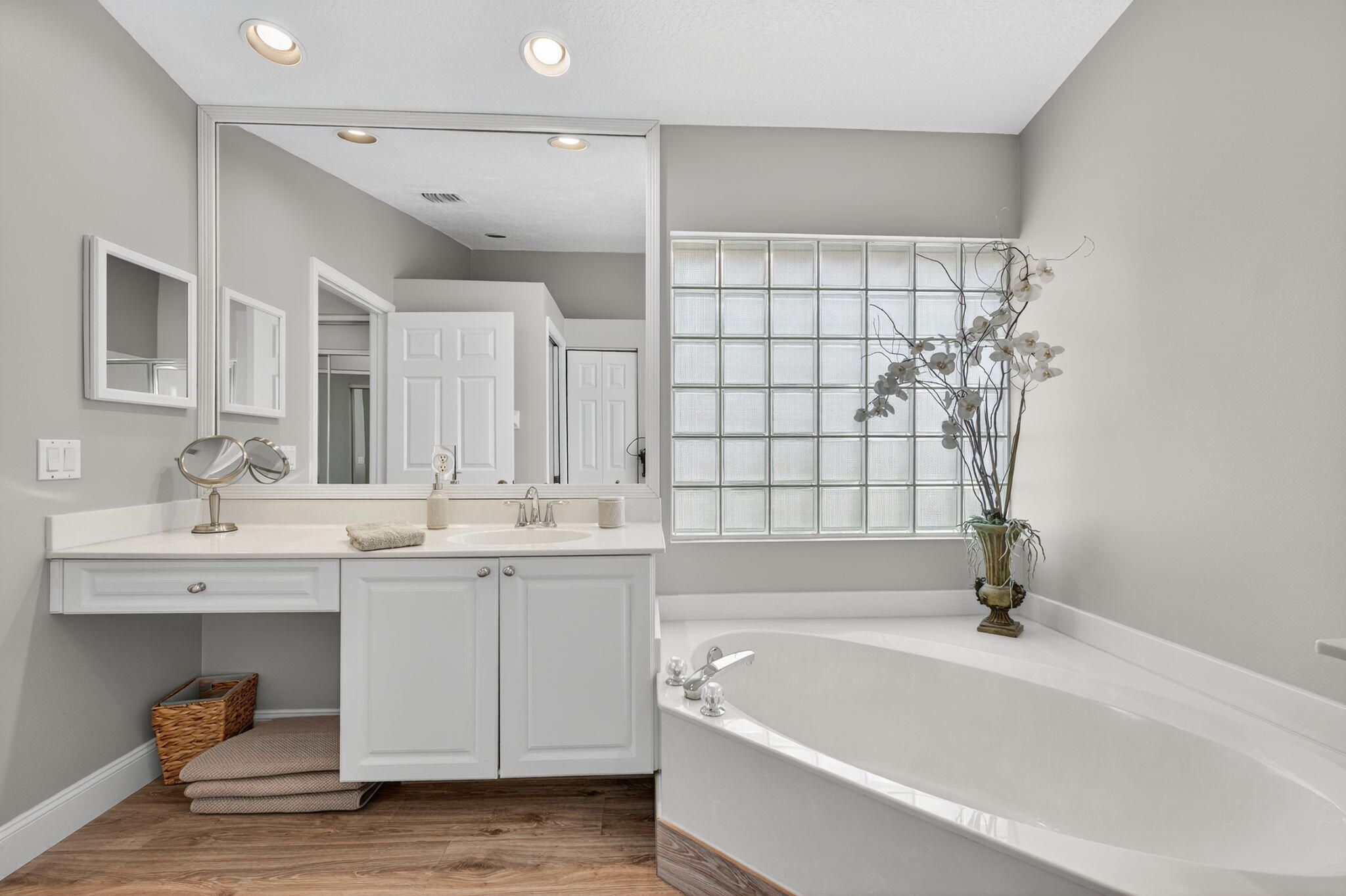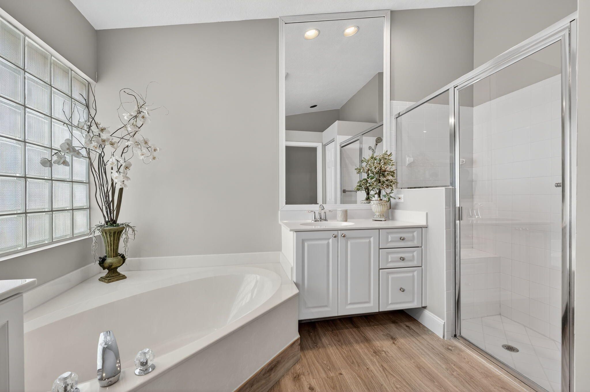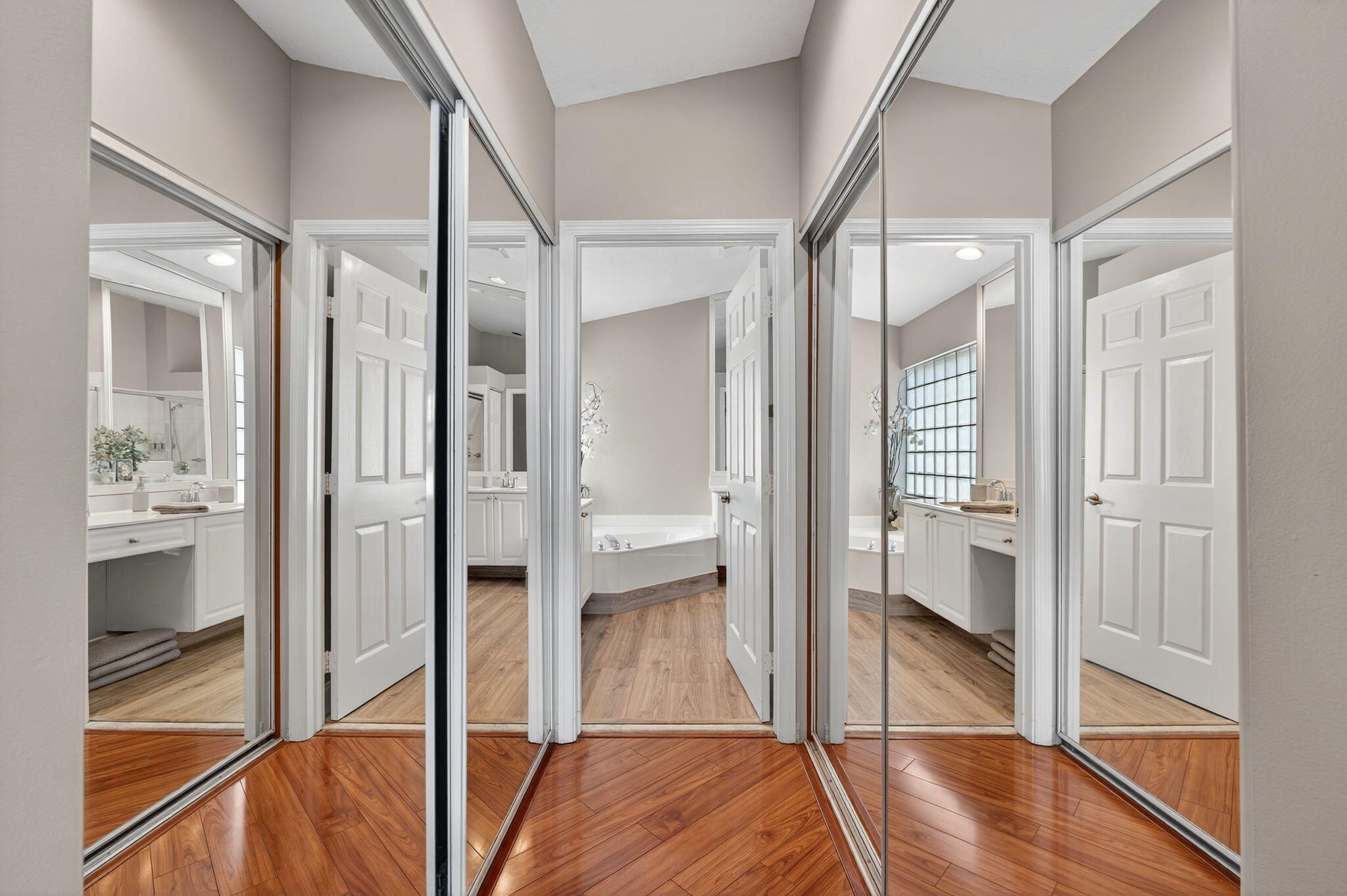 - Cathedral Ceiling(s), High Ceilings, Pantry, Vaulted Ceiling(s), Walk-In Closet(s), Split Bedrooms, Custom Mirrors, Dual Sinks, Main Level Primary, Separate Shower, Soaking Tub