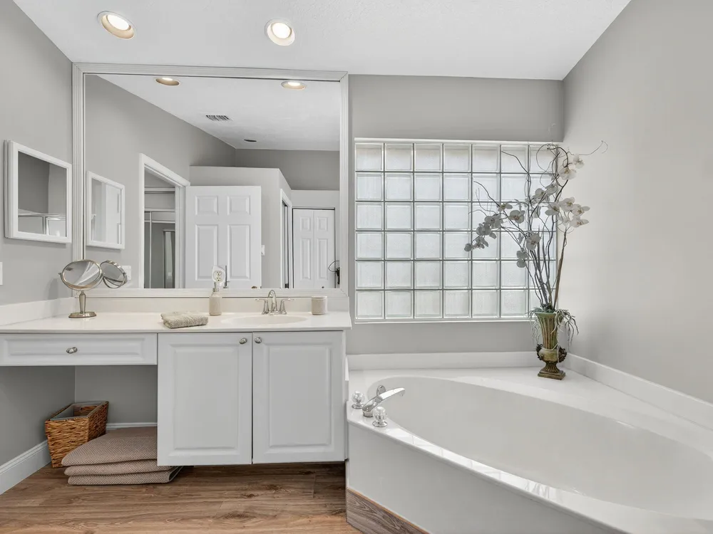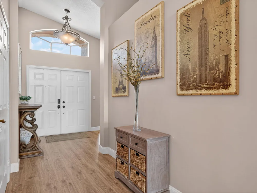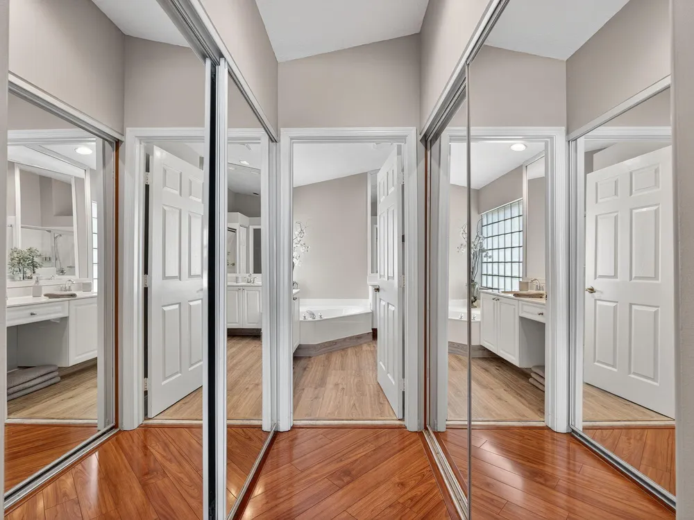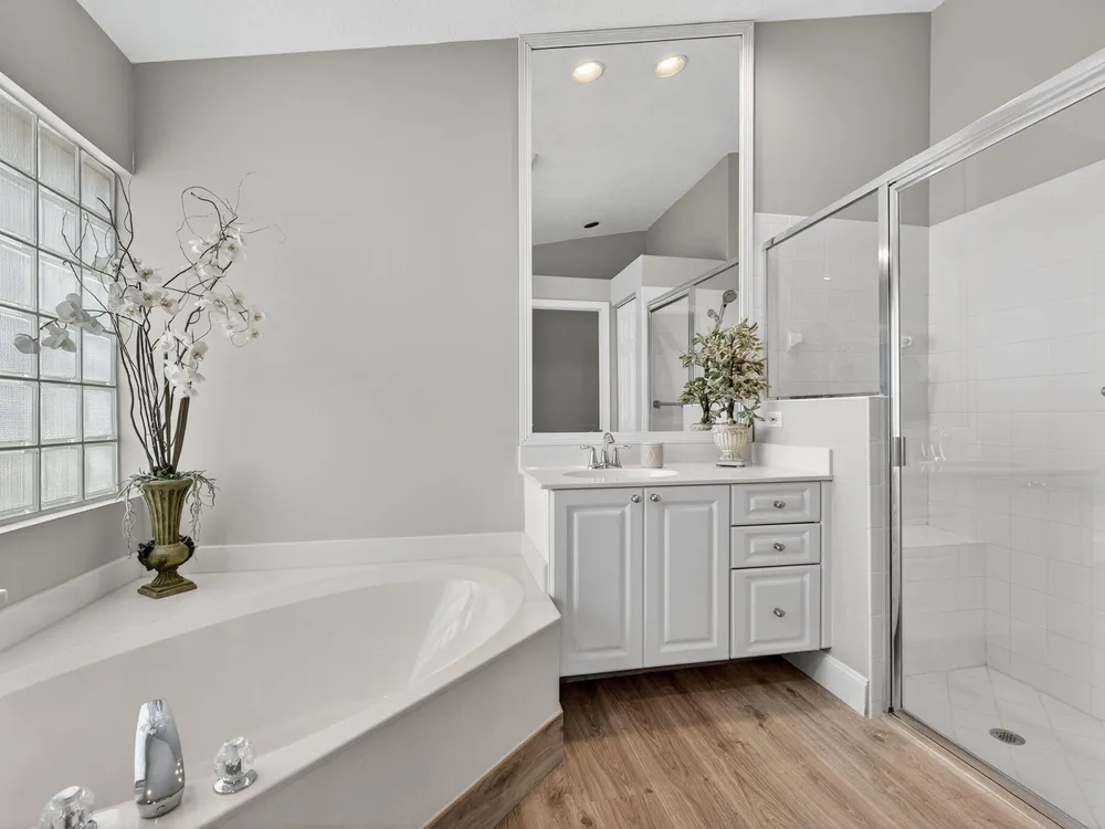 - Cathedral Ceiling(s), Custom Mirrors, Entry Level Living Area, Pantry, Split Bedrooms, High Ceilings, Walk-In Closet(s), Great Room, Dual Sinks, Primary Downstairs, Separate Shower, Bathtub, Storm Shutters