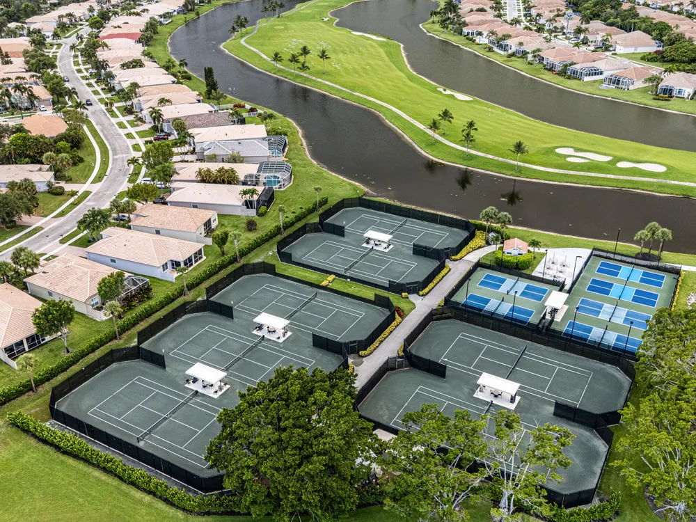 - Bocce, Clubhouse, Community Room, Fitness Center, Golf, Lobby, Pickleball, Pool, Putting Green, Sauna, Tennis Court(s)