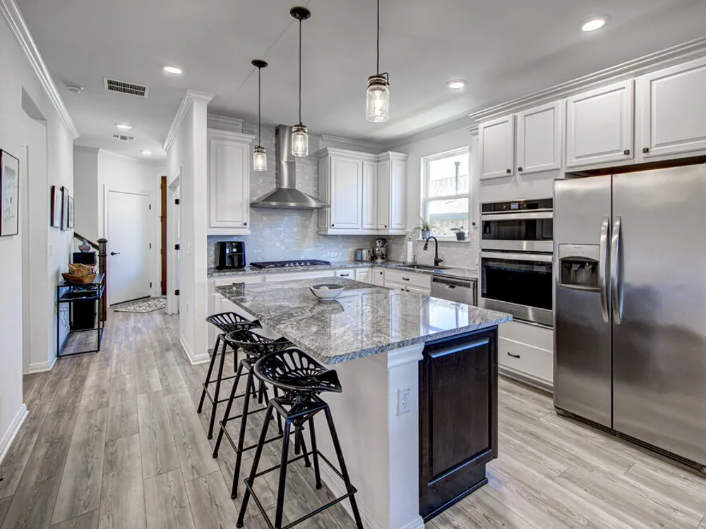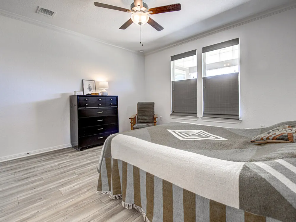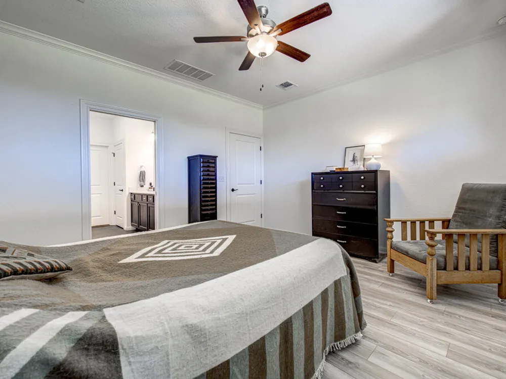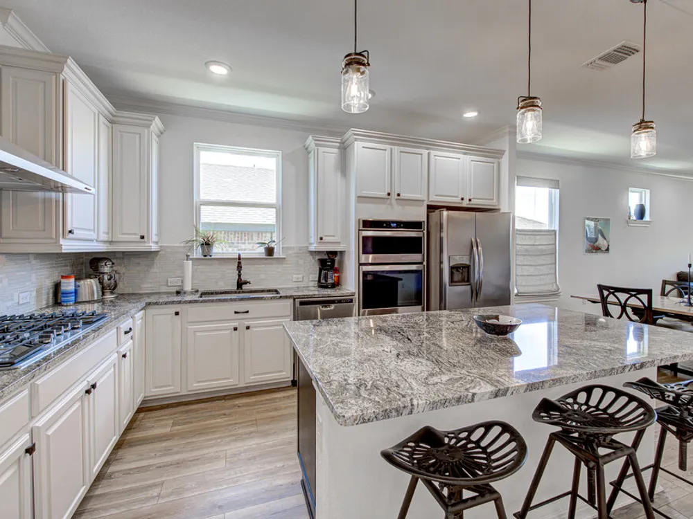 - Breakfast Bar, Ceiling Fan(s), Crown Molding, Double Vanity, Eat-in Kitchen, French Door(s)/Atrium Door(s), High Ceilings, Kitchen Island, Multiple Living Areas, Main Level Primary, Open Floorplan, Pantry, Recessed Lighting, Walk-In Closet(s)