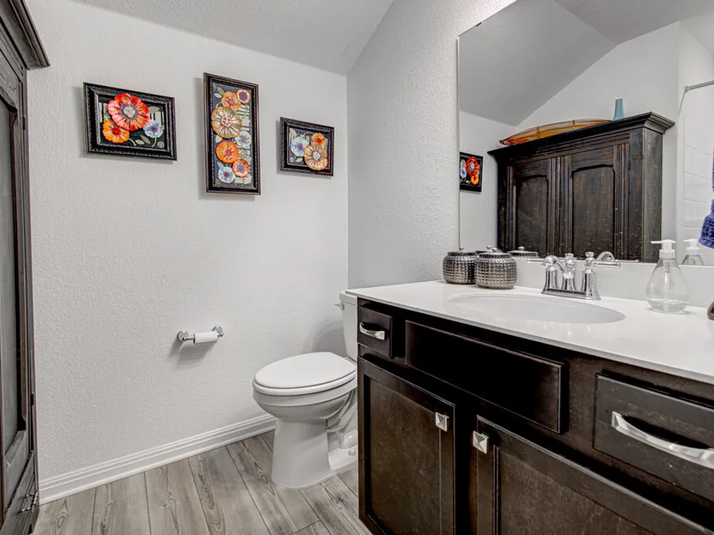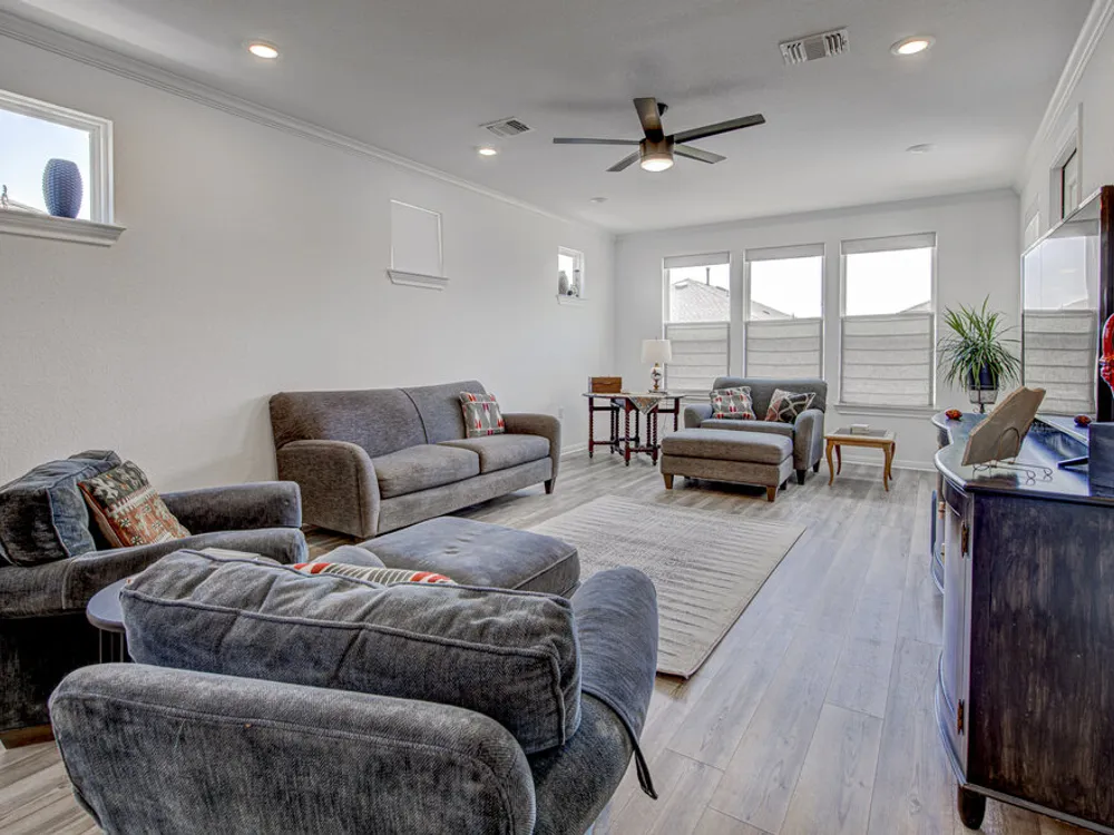 Fantastic home in Georgetown’s sought-after Sun City community, offering an incredible combination of space, upgrades, and access to world-class amenities. This beautiful two-story residence features a thoughtful floorplan with an open, light-filled layout that’s perfect for entertaining. The main level boasts high ceilings, luxury vinyl plank flooring, a dedicated flex room with French doors, two bedrooms, and two full baths. The kitchen shines with granite countertops, stainless steel appliances, and flows seamlessly into the living and dining areas, which include a 10-foot extension for added comfort and entertaining space. Upstairs, you’ll find a private suite with its own living area, bedroom, and full bath — ideal for guests, grandkids, or a home office/studio. The oversized garage includes a 4-foot extension for added storage, while the front and back covered patios offer the perfect spots to relax in the shade. Enjoy the beautiful, low-maintenance landscaped backyard with an extended back patio and quick access to one of Sun City’s newest amenity centers, plus groceries, golf, and dining, all just a golf cart ride away. Only 15 minutes to charming downtown Georgetown and its vibrant square, this almost-new home combines convenience, community, and style — truly a rare find at an amazing value!