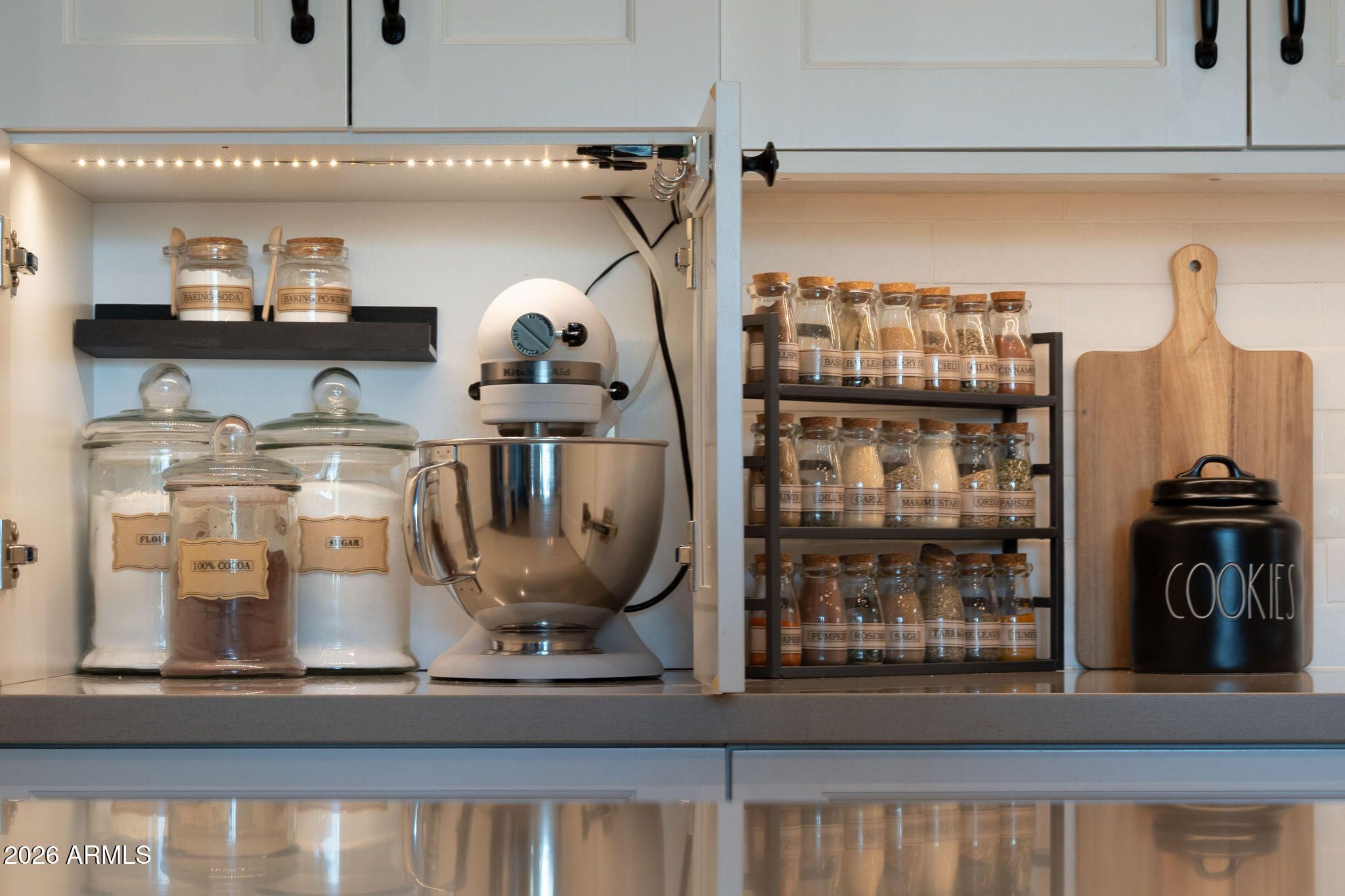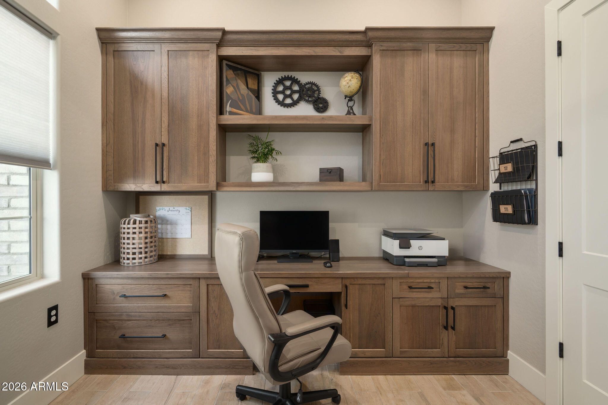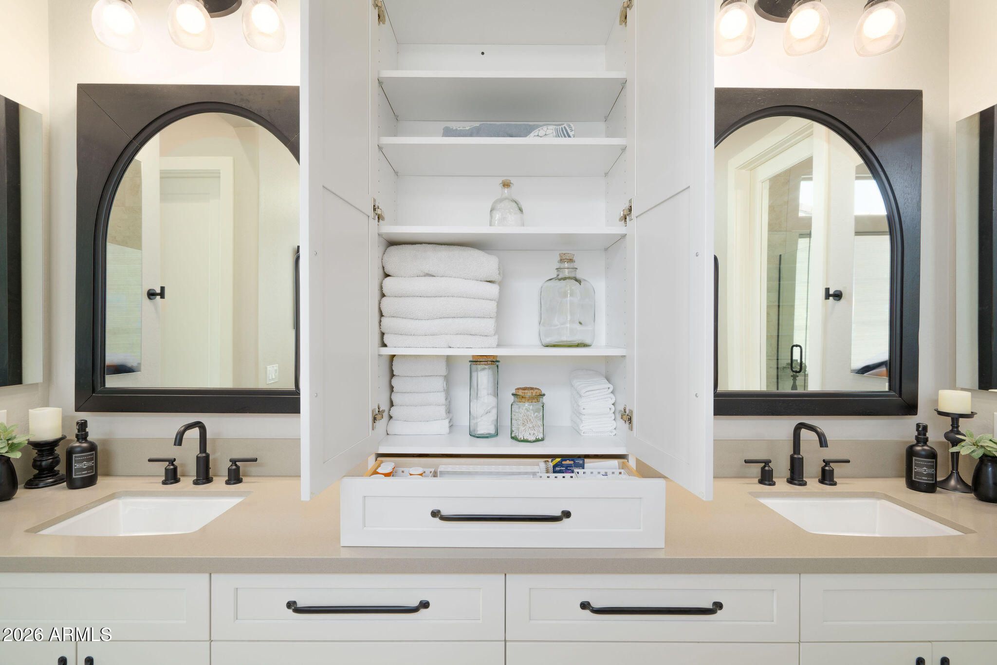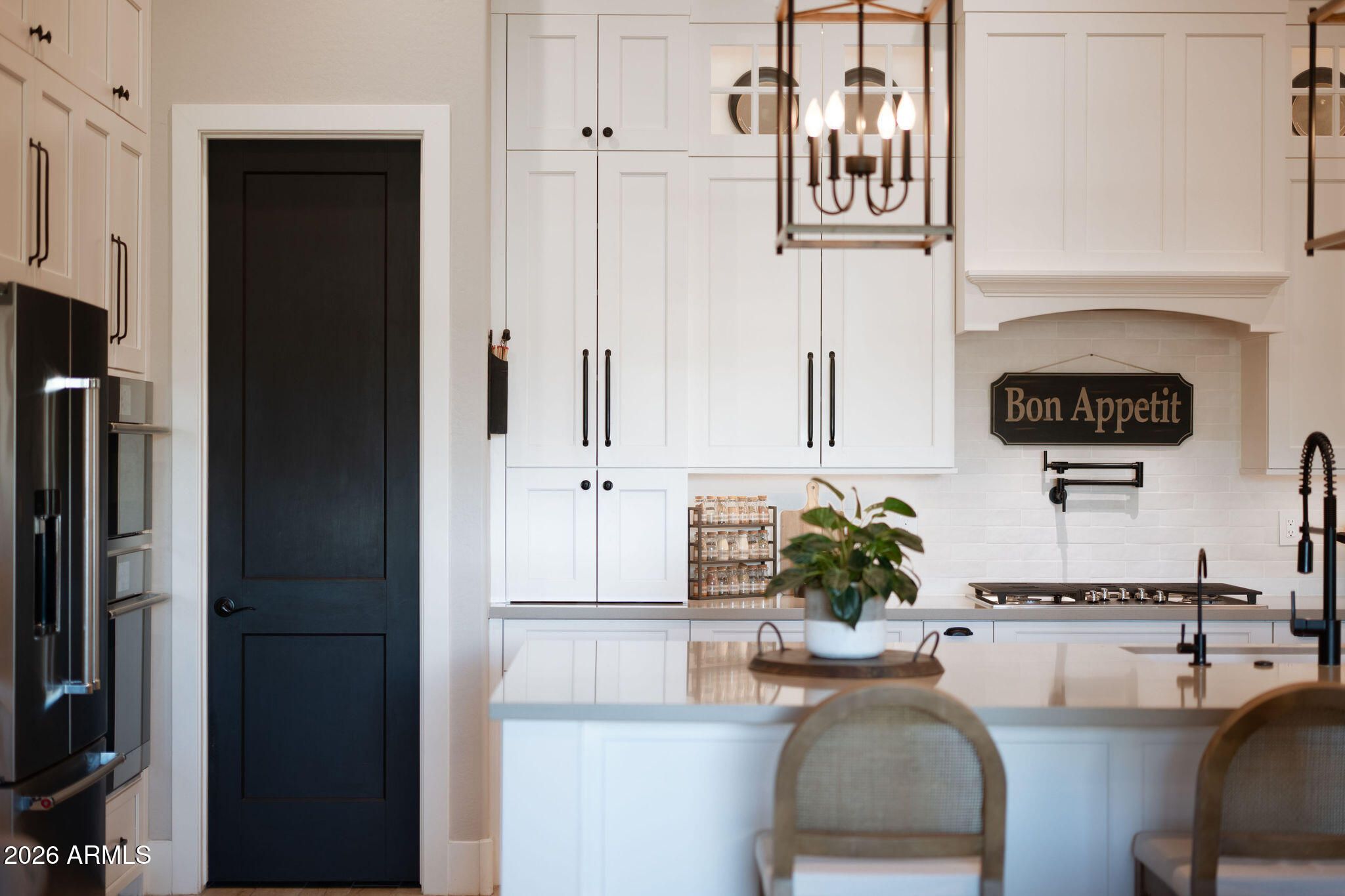 This exceptional residence has been thoughtfully and extensively redesigned with true designer-level finishes throughout. Major interior spaces were custom reimagined by the homeowner, owner of Fallone Kitchen & Bath, a highly regarded five-star Scottsdale-based company. This is not a builder upgrade package, but a fully custom renovation showcasing high-end materials, expert craftsmanship, and intentional design well beyond typical neighborhood standards. The chef's kitchen serves as the heart of the home and is distinguished by 10-foot custom cabinetry featuring full-overlay, soft-close doors and full-extension drawers, including 15 drawers within the cooking area alone. Additional features include a dedicated baking center with integrated lighting and electrical, an appliance garage, a furniture-paneled island, a decorative custom hood, a pot filler, a beverage refrigerator, and an extended coffee and wine bar with wine cooler. The premium appliances include a KitchenAid three-rack dishwasher and a GE Café Advantium oven/microwave. The LED under-cabinet lighting adds both functionality and refined ambiance. The primary suite bath is designed as a serene, spa-inspired retreat, featuring custom cabinetry with six full-extension drawers and a linen cabinet for exceptional storage. Italian 36" x 36" tile flooringenhanced with radiant heatadds both comfort and elegance, while a dedicated makeup area with upper cabinetry and drawer storage completes the space. Designed with guest comfort and privacy in mind, the secondary bedroom offers an ensuite bath with double vanities, a custom-tiled shower, and a walk-in closet. Function and organization continue into the custom home office, which includes deep file drawers, a computer/component cabinet, a rollout cabinet for a shredder, open shelving, and 48 inch upper cabinets for extra storage. While the redesigned laundry room adds everyday convenience with a marble countertop and deep sink, upper cabinets, and a clever lower cabinet finished inside to double as a built-in dog bed area when the doors are removed. Additional interior enhancements include a smart programable thermostat, new LED recessed lighting, power shades at the sliding glass door, and a striking iron front door with integrated security screen, offering both elevated curb appeal and peace of mind. The garage features custom-built cabinetrywell above standard garage finishespaired with an epoxy floor. Outdoor living is equally impressive. The professionally landscaped backyard is designed for year-round enjoyment and features an extended limestone patio that remains cool during warmer months, a Sundance Marin spa accommodating four to five guests with a new cover, a water feature and artificial turf with integrated cooling sprinklers. This residence presents a rare opportunity to own a truly custom-quality home where design integrity, functionality, and craftsmanship clearly exceed standard comparable properties.