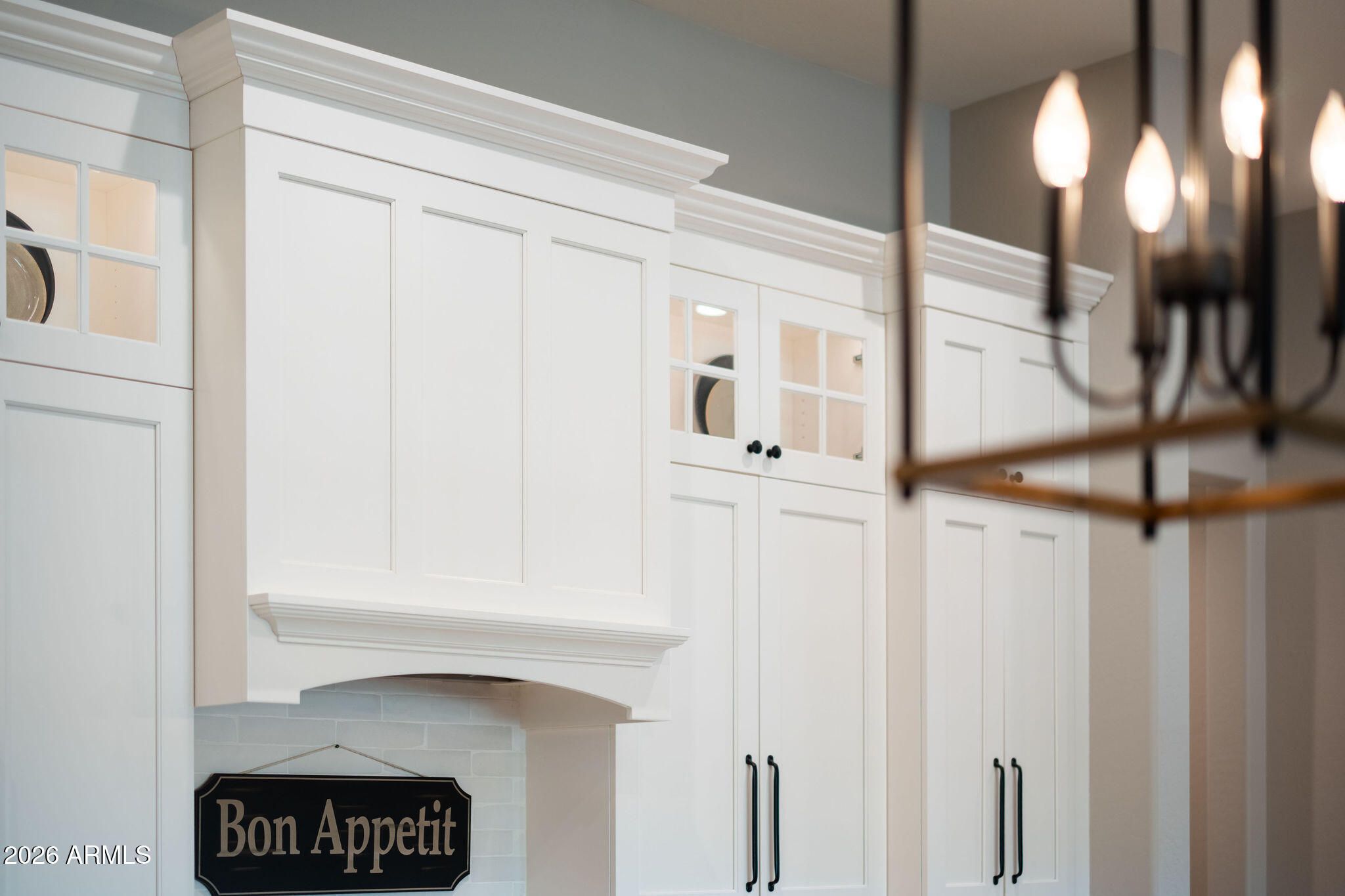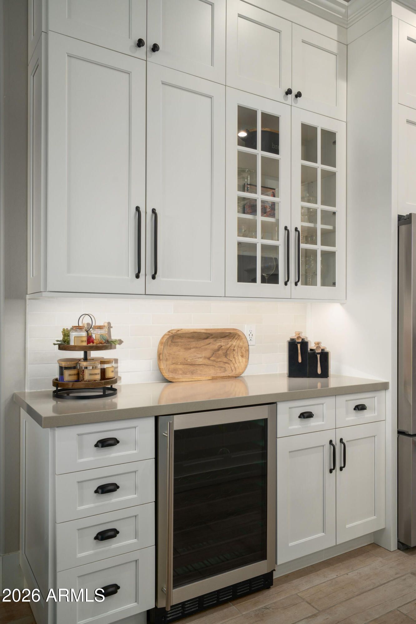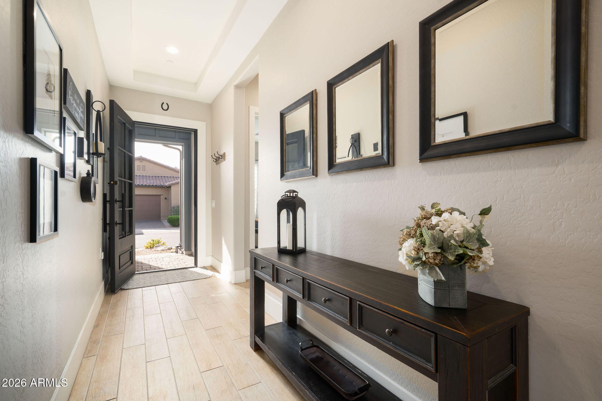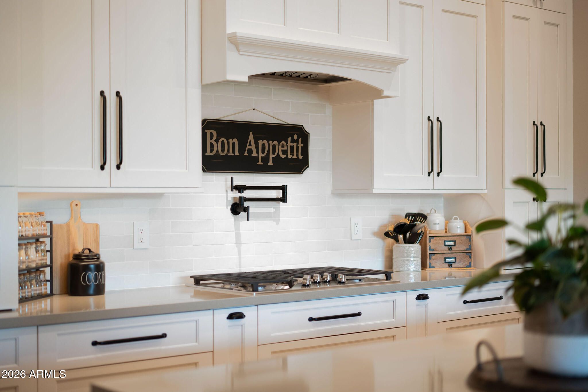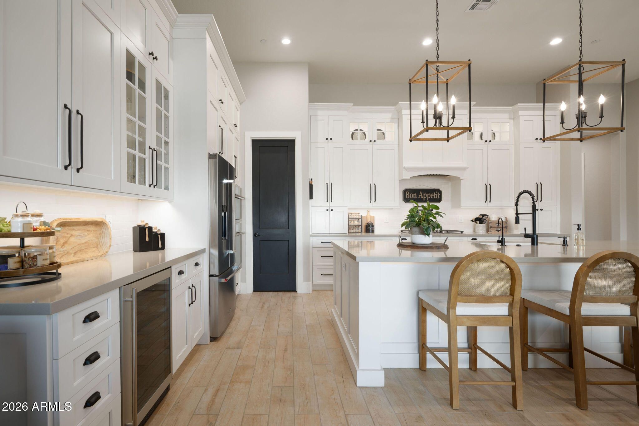 This exceptional residence has been thoughtfully and extensively redesigned with true designer-level finishes throughout. Major interior spaces were custom reimagined by the homeowner, owner of Fallone Kitchen & Bath, a highly regarded five-star Scottsdale-based company. This is not a builder upgrade package, but a fully custom renovation showcasing high-end materials, expert craftsmanship, and intentional design well beyond typical neighborhood standards. The chef's kitchen serves as the heart of the home and is distinguished by 10-foot custom cabinetry featuring full-overlay, soft-close doors and full-extension drawers, including 15 drawers within the cooking area alone. Additional features include a dedicated baking center with integrated lighting and electrical, an appliance garage, a furniture-paneled island, a decorative custom hood, a pot filler, a beverage refrigerator, and an extended coffee and wine bar with wine cooler. The premium appliances include a KitchenAid three-rack dishwasher and a GE Café Advantium oven/microwave. The LED under-cabinet lighting adds both functionality and refined ambiance. The primary suite bath is designed as a serene, spa-inspired retreat, featuring custom cabinetry with six full-extension drawers and a linen cabinet for exceptional storage. Italian 36" x 36" tile flooringenhanced with radiant heatadds both comfort and elegance, while a dedicated makeup area with upper cabinetry and drawer storage completes the space. Designed with guest comfort and privacy in mind, the secondary bedroom offers an ensuite bath with double vanities, a custom-tiled shower, and a walk-in closet. Function and organization continue into the custom home office, which includes deep file drawers, a computer/component cabinet, a rollout cabinet for a shredder, open shelving, and 48 inch upper cabinets for extra storage. While the redesigned laundry room adds everyday convenience with a marble countertop and deep sink, upper cabinets, and a clever lower cabinet finished inside to double as a built-in dog bed area when the doors are removed. Additional interior enhancements include a smart programable thermostat, new LED recessed lighting, power shades at the sliding glass door, and a striking iron front door with integrated security screen, offering both elevated curb appeal and peace of mind. The garage features custom-built cabinetrywell above standard garage finishespaired with an epoxy floor. Outdoor living is equally impressive. The professionally landscaped backyard is designed for year-round enjoyment and features an extended limestone patio that remains cool during warmer months, a Sundance Marin spa accommodating four to five guests with a new cover, a water feature and artificial turf with integrated cooling sprinklers. This residence presents a rare opportunity to own a truly custom-quality home where design integrity, functionality, and craftsmanship clearly exceed standard comparable properties.