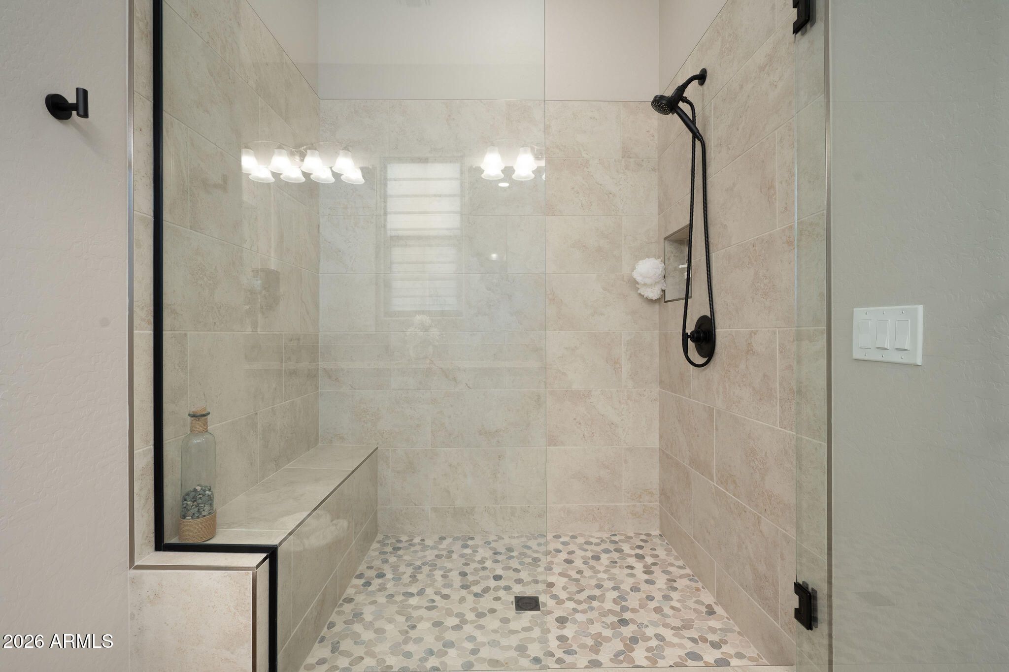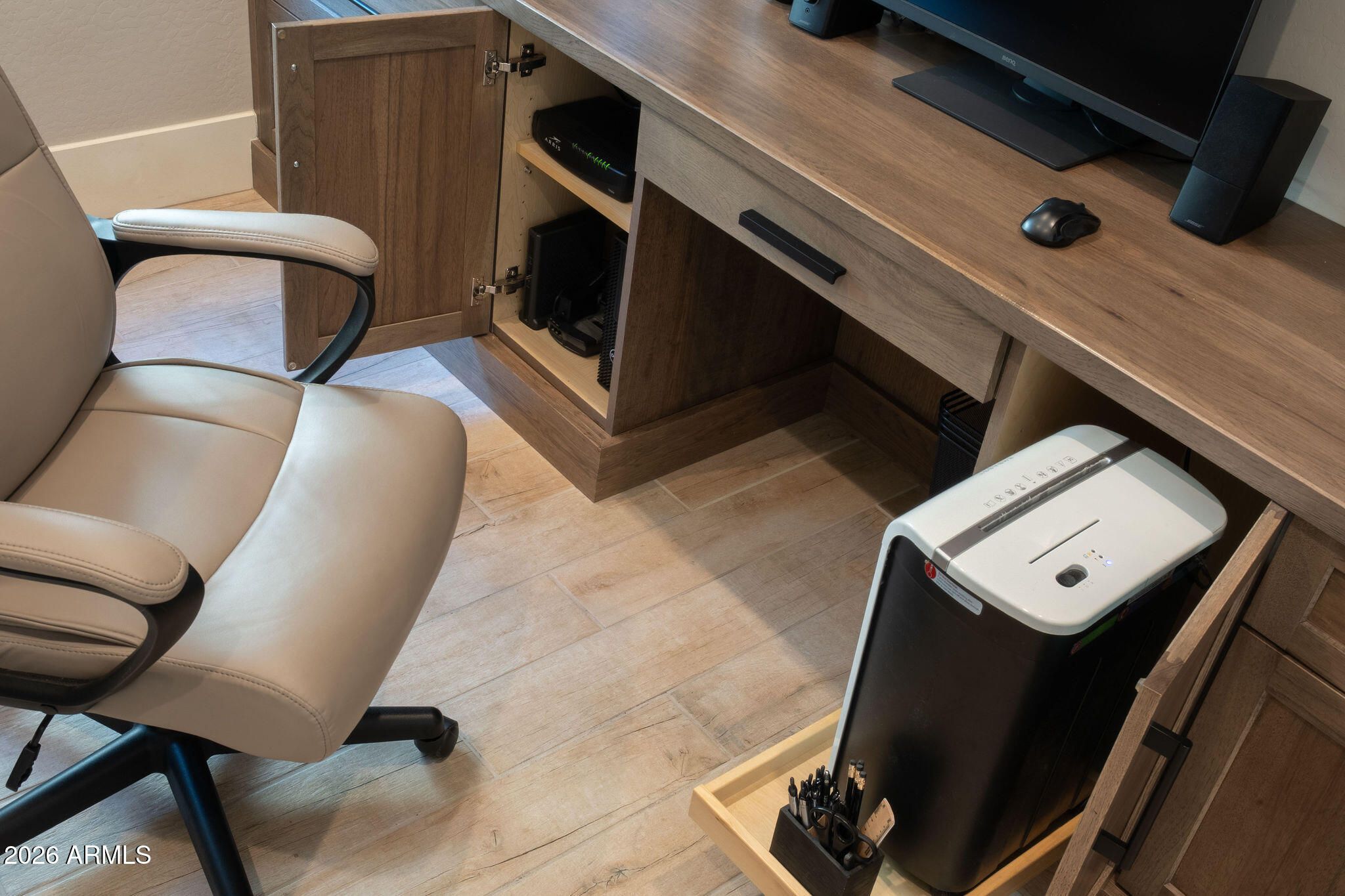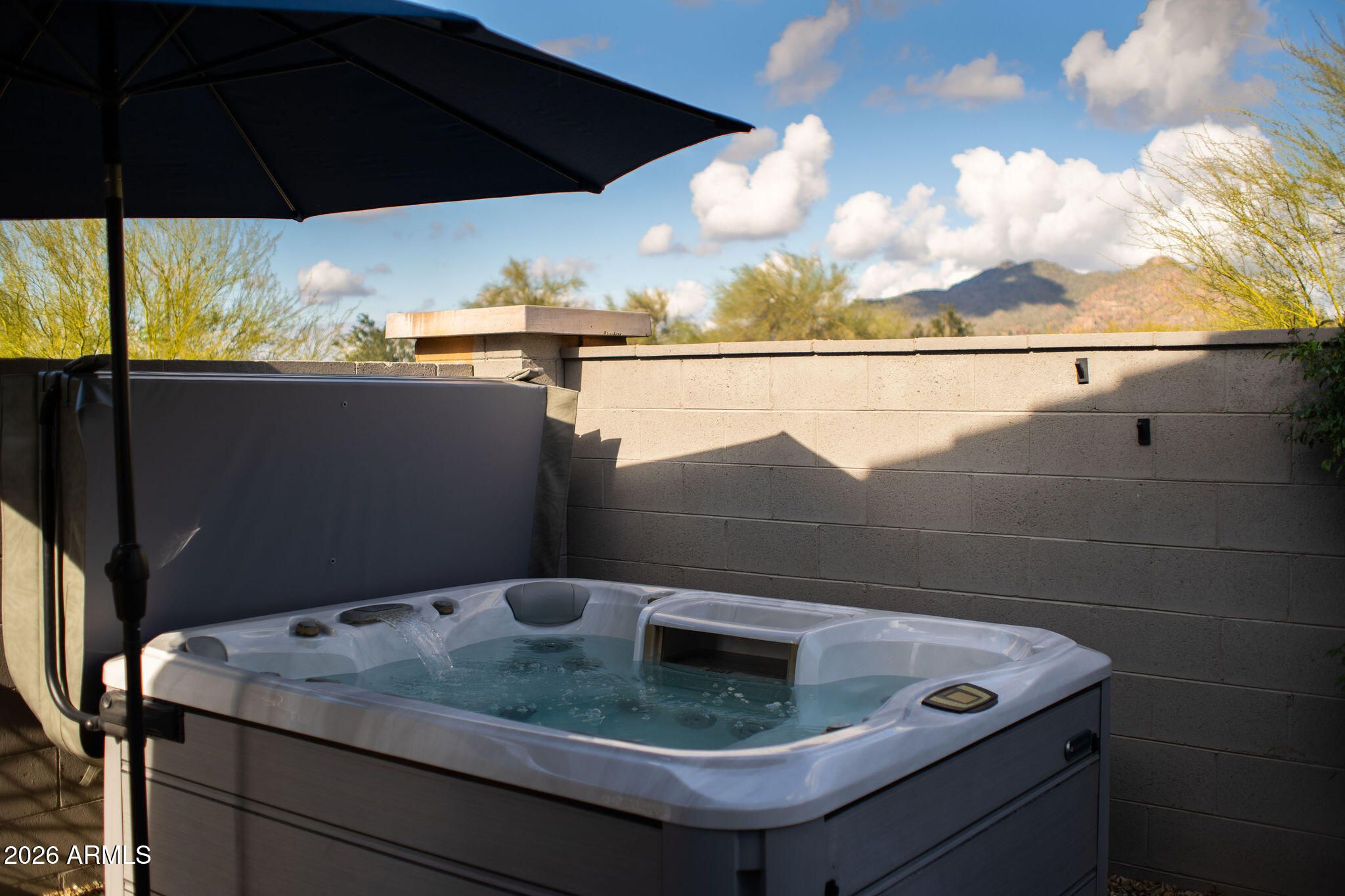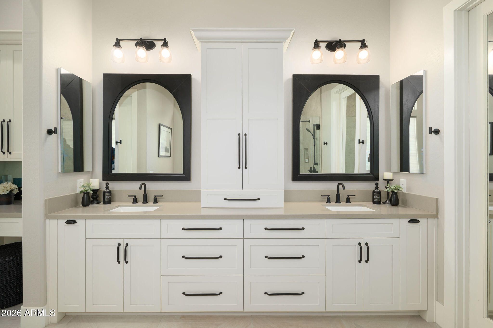 This exceptional residence has been thoughtfully and extensively redesigned with true designer-level finishes throughout. Major interior spaces were custom reimagined by the homeowner, owner of Fallone Kitchen & Bath, a highly regarded five-star Scottsdale-based company. This is not a builder upgrade package, but a fully custom renovation showcasing high-end materials, expert craftsmanship, and intentional design well beyond typical neighborhood standards. The chef's kitchen serves as the heart of the home and is distinguished by 10-foot custom cabinetry featuring full-overlay, soft-close doors and full-extension drawers, including 15 drawers within the cooking area alone. Additional features include a dedicated baking center with integrated lighting and electrical, an appliance garage, a furniture-paneled island, a decorative custom hood, a pot filler, a beverage refrigerator, and an extended coffee and wine bar with wine cooler. The premium appliances include a KitchenAid three-rack dishwasher and a GE Café Advantium oven/microwave. The LED under-cabinet lighting adds both functionality and refined ambiance. The primary suite bath is designed as a serene, spa-inspired retreat, featuring custom cabinetry with six full-extension drawers and a linen cabinet for exceptional storage. Italian 36" x 36" tile flooringenhanced with radiant heatadds both comfort and elegance, while a dedicated makeup area with upper cabinetry and drawer storage completes the space. Designed with guest comfort and privacy in mind, the secondary bedroom offers an ensuite bath with double vanities, a custom-tiled shower, and a walk-in closet. Function and organization continue into the custom home office, which includes deep file drawers, a computer/component cabinet, a rollout cabinet for a shredder, open shelving, and 48 inch upper cabinets for extra storage. While the redesigned laundry room adds everyday convenience with a marble countertop and deep sink, upper cabinets, and a clever lower cabinet finished inside to double as a built-in dog bed area when the doors are removed. Additional interior enhancements include a smart programable thermostat, new LED recessed lighting, power shades at the sliding glass door, and a striking iron front door with integrated security screen, offering both elevated curb appeal and peace of mind. The garage features custom-built cabinetrywell above standard garage finishespaired with an epoxy floor. Outdoor living is equally impressive. The professionally landscaped backyard is designed for year-round enjoyment and features an extended limestone patio that remains cool during warmer months, a Sundance Marin spa accommodating four to five guests with a new cover, a water feature and artificial turf with integrated cooling sprinklers. This residence presents a rare opportunity to own a truly custom-quality home where design integrity, functionality, and craftsmanship clearly exceed standard comparable properties.