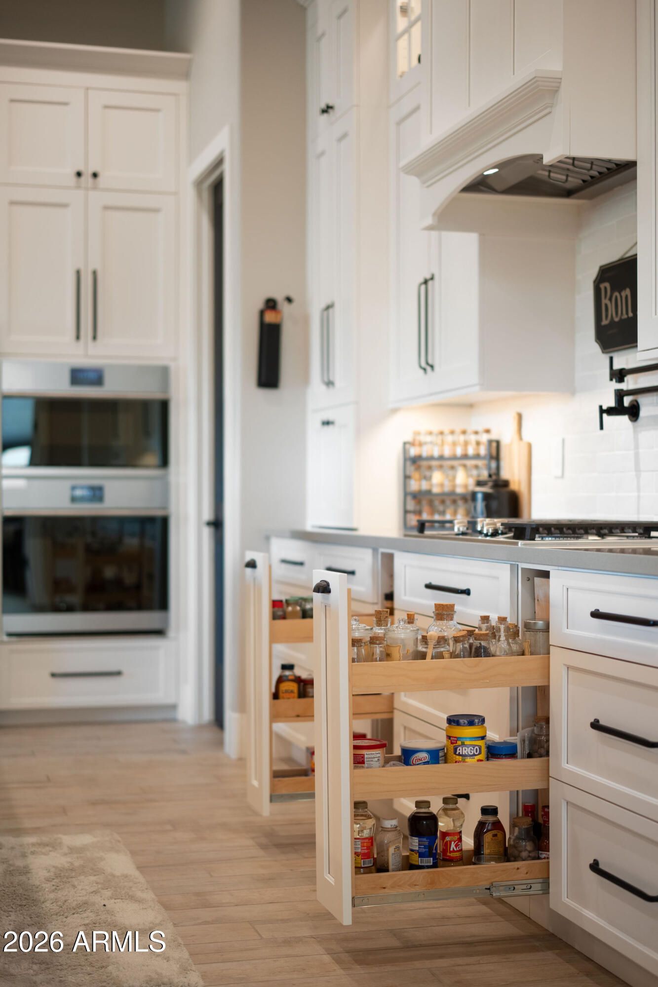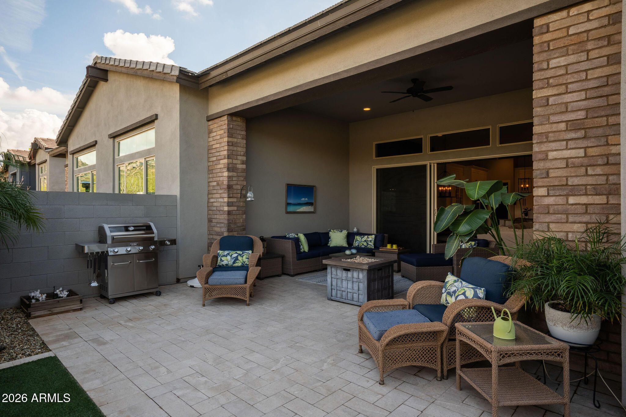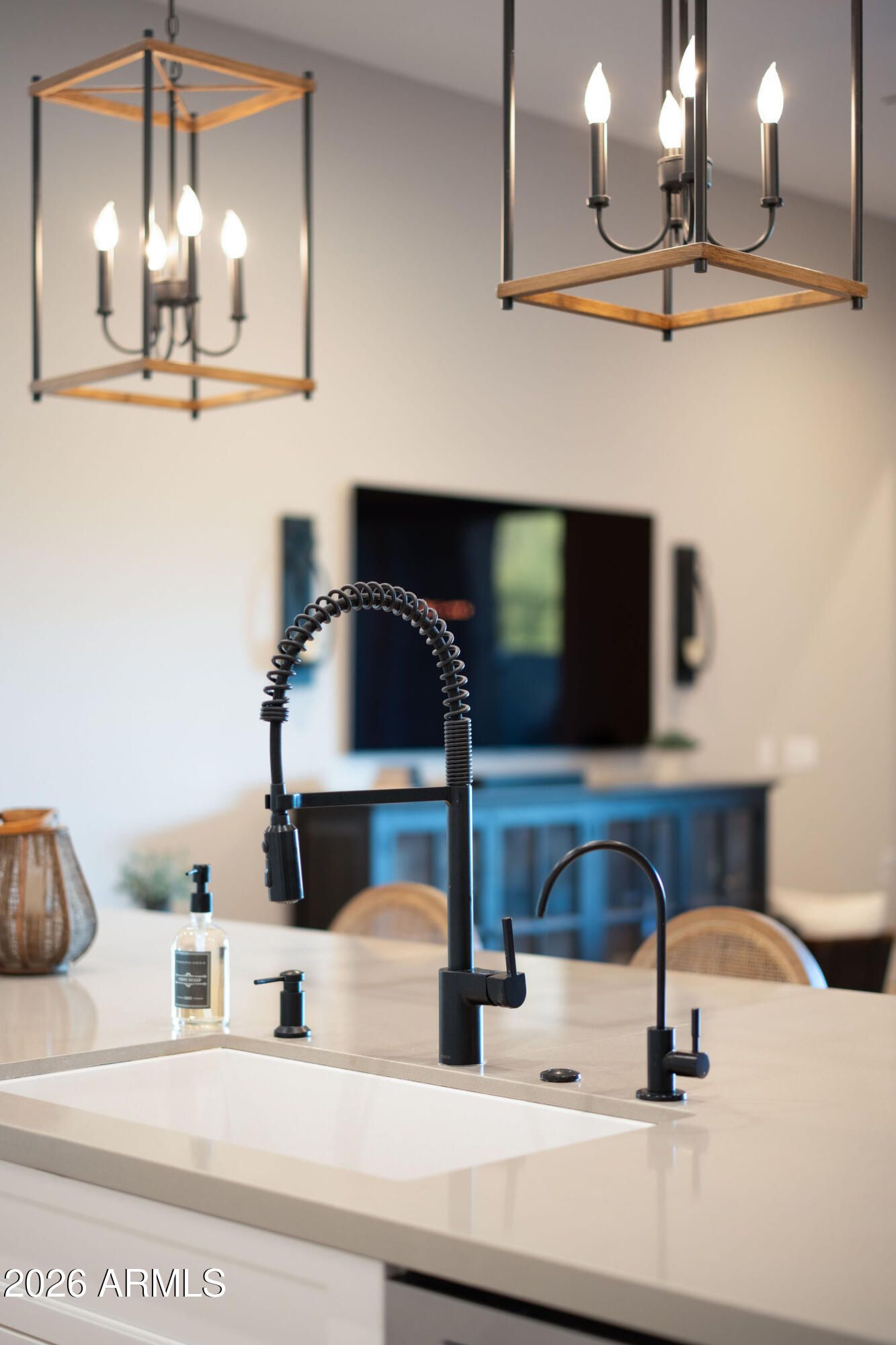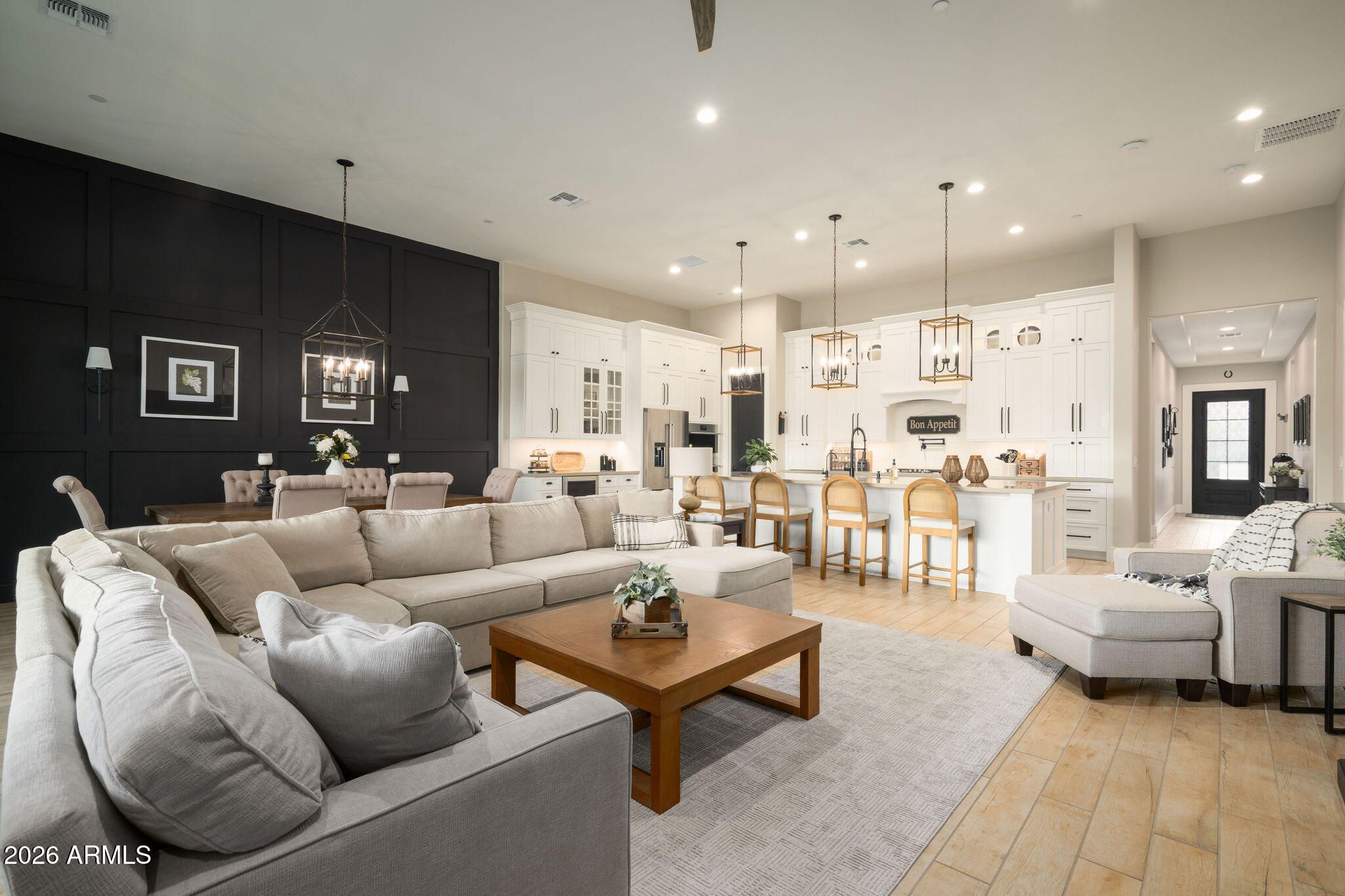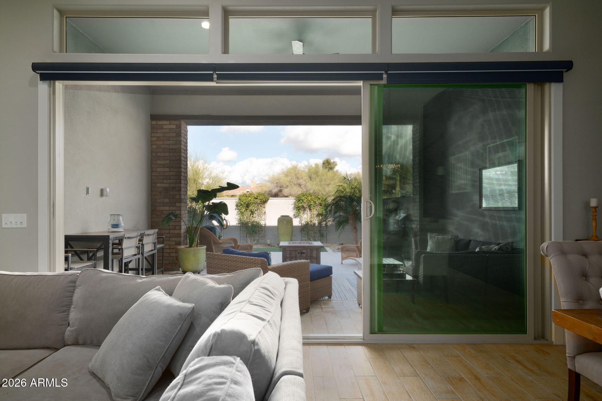 This exceptional residence has been thoughtfully and extensively redesigned with true designer-level finishes throughout. Major interior spaces were custom reimagined by the homeowner, owner of Fallone Kitchen & Bath, a highly regarded five-star Scottsdale-based company. This is not a builder upgrade package, but a fully custom renovation showcasing high-end materials, expert craftsmanship, and intentional design well beyond typical neighborhood standards. The chef's kitchen serves as the heart of the home and is distinguished by 10-foot custom cabinetry featuring full-overlay, soft-close doors and full-extension drawers, including 15 drawers within the cooking area alone. Additional features include a dedicated baking center with integrated lighting and electrical, an appliance garage, a furniture-paneled island, a decorative custom hood, a pot filler, a beverage refrigerator, and an extended coffee and wine bar with wine cooler. The premium appliances include a KitchenAid three-rack dishwasher and a GE Café Advantium oven/microwave. The LED under-cabinet lighting adds both functionality and refined ambiance. The primary suite bath is designed as a serene, spa-inspired retreat, featuring custom cabinetry with six full-extension drawers and a linen cabinet for exceptional storage. Italian 36" x 36" tile flooringenhanced with radiant heatadds both comfort and elegance, while a dedicated makeup area with upper cabinetry and drawer storage completes the space. Designed with guest comfort and privacy in mind, the secondary bedroom offers an ensuite bath with double vanities, a custom-tiled shower, and a walk-in closet. Function and organization continue into the custom home office, which includes deep file drawers, a computer/component cabinet, a rollout cabinet for a shredder, open shelving, and 48 inch upper cabinets for extra storage. While the redesigned laundry room adds everyday convenience with a marble countertop and deep sink, upper cabinets, and a clever lower cabinet finished inside to double as a built-in dog bed area when the doors are removed. Additional interior enhancements include a smart programable thermostat, new LED recessed lighting, power shades at the sliding glass door, and a striking iron front door with integrated security screen, offering both elevated curb appeal and peace of mind. The garage features custom-built cabinetrywell above standard garage finishespaired with an epoxy floor. Outdoor living is equally impressive. The professionally landscaped backyard is designed for year-round enjoyment and features an extended limestone patio that remains cool during warmer months, a Sundance Marin spa accommodating four to five guests with a new cover, a water feature and artificial turf with integrated cooling sprinklers. This residence presents a rare opportunity to own a truly custom-quality home where design integrity, functionality, and craftsmanship clearly exceed standard comparable properties.