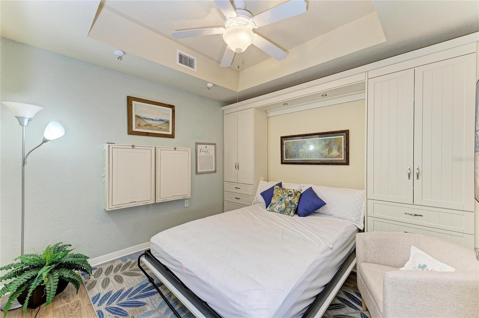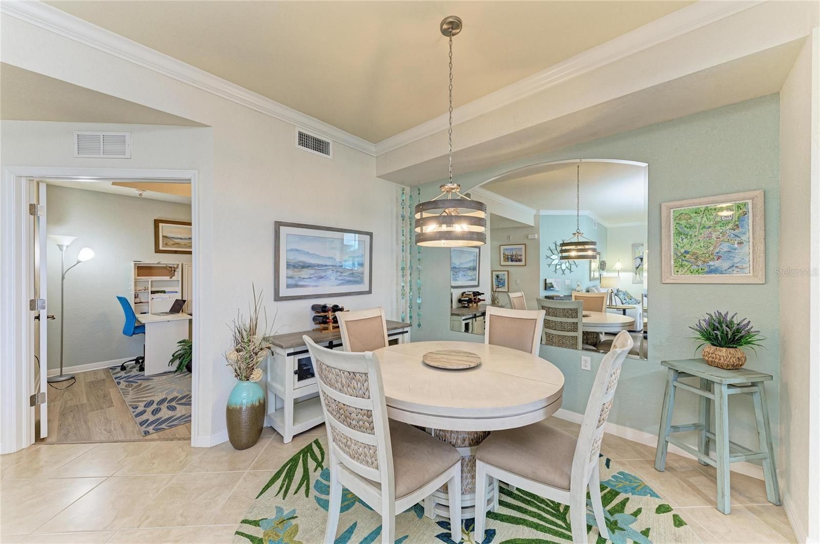 Experience refined Florida living in this exquisitely UPDATED first-floor veranda condominium, perfectly positioned within the luxurious gated River Strand Golf & Country Club. Offering over 1,500 square feet of thoughtfully designed living space, the sought-after Dogwood floor plan showcases an elegant OPEN-CONCEPT layout ideal for both enhanced entertaining and everyday comfort. The KITCHEN HAS BEEN BEAUTIFULLY REIMAGINED with stunning quartzite countertops, custom-painted cabinetry, and a designer backsplash, seamlessly flowing into the expansive great room and dining area. Luxury vinyl flooring enhances the bedrooms and den, combining timeless style with modern durability. The primary suite is a true retreat, featuring a striking accent wall, A FULLY RENOVATED SPA-LIKE BATH with new cabinetry, countertops, and an upgraded shower, along with a spacious custom walk-in closet. The versatile den offers custom built-ins, including a discreet Murphy bed and hidden desk spaces—perfect for hosting guests without sacrificing elegance. Step onto the private, screened rear lanai and take in SWEEPING GOLF AND WATER VIEWS overlooking the 8th hole of the Estuary Course—iconic scenery that defines River Strand living. An additional front lanai provides another serene space to enjoy Florida’s year-round sunshine. A detached one-car garage offers ample room for a vehicle, golf cart, or beach essentials. Notable upgrades include a new A/C system (2025), custom lighting, plantation shutters, ceramic brick-style tile on both lanais, and a stunning custom glass-inlay front door. River Strand continues to elevate its luxury lifestyle with an impressive $9 million amenity renovation nearing completion, featuring a redesigned RESTAURANT, grille room and an expanded tiki bar with modernized facilities. This GOLF DEEDED residence includes access to 27 holes of championship golf, two resort-style pools and spas, six satellite pools, tennis and pickleball courts, two state-of-the-art fitness centers, and a vibrant calendar of social and wellness events. Ideally located just minutes from the new Marketplace with Target, Costco, and an exciting collection of upscale dining and shopping options. This exceptional residence offers the perfect blend of luxury, lifestyle, and location—So come and experience River Strand at its best, you may never want to leave!
